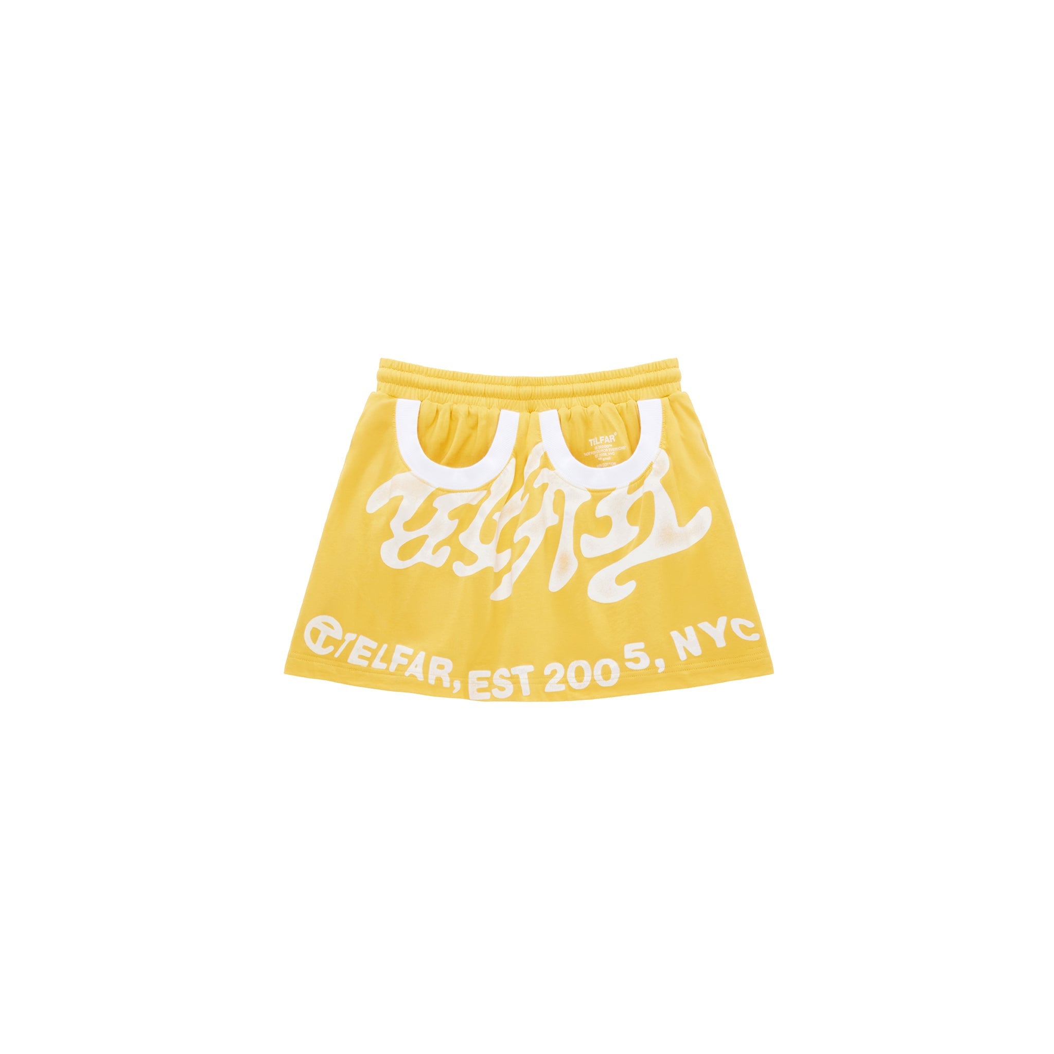 The Ambigram Skirt — featuring kangaroo pockets with contrast rib knit seams, adjustable drawstring at the waist, and signature Ambigram print.