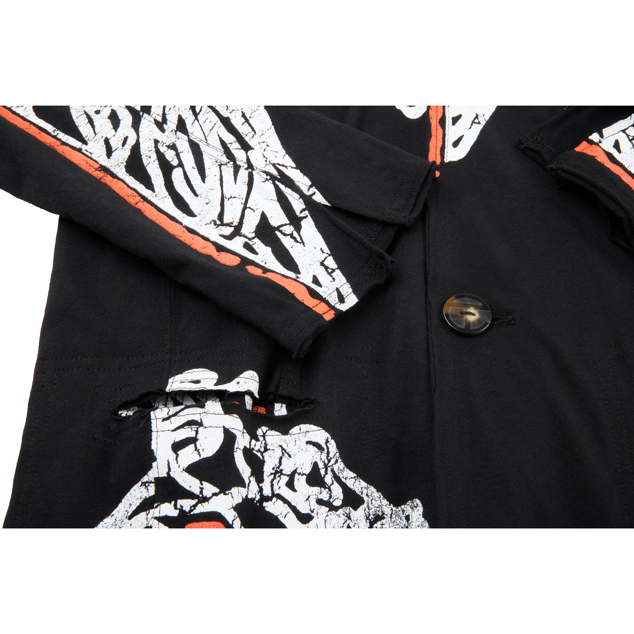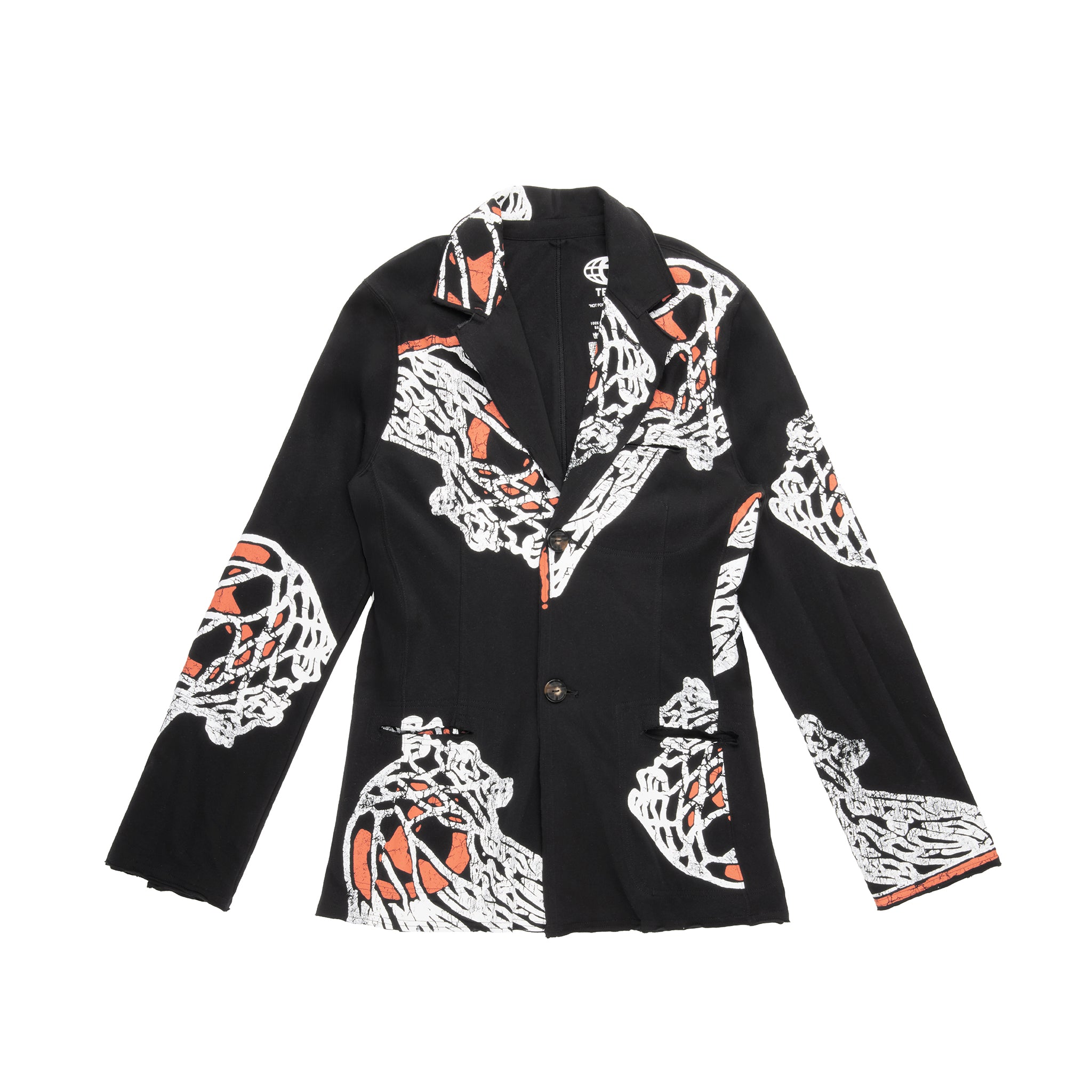Our T-Shirt Blazer – Now in our signature cracked Basketball print on 100% ultra-soft jersey cotton. Featuring lapel collar, chest pocket, deep slit pockets at the waist, custom faux horn buttons, exposed seams, and raw edges.