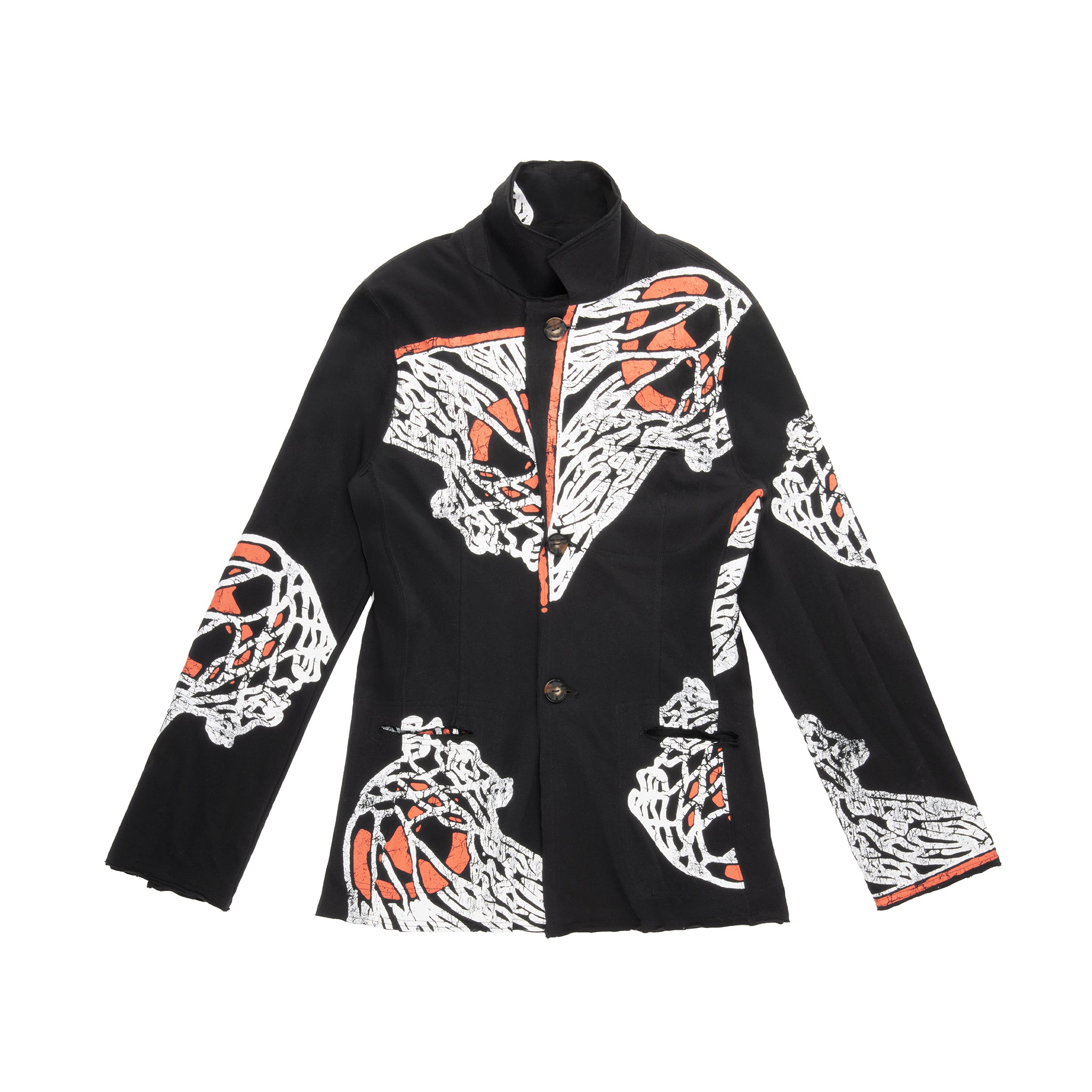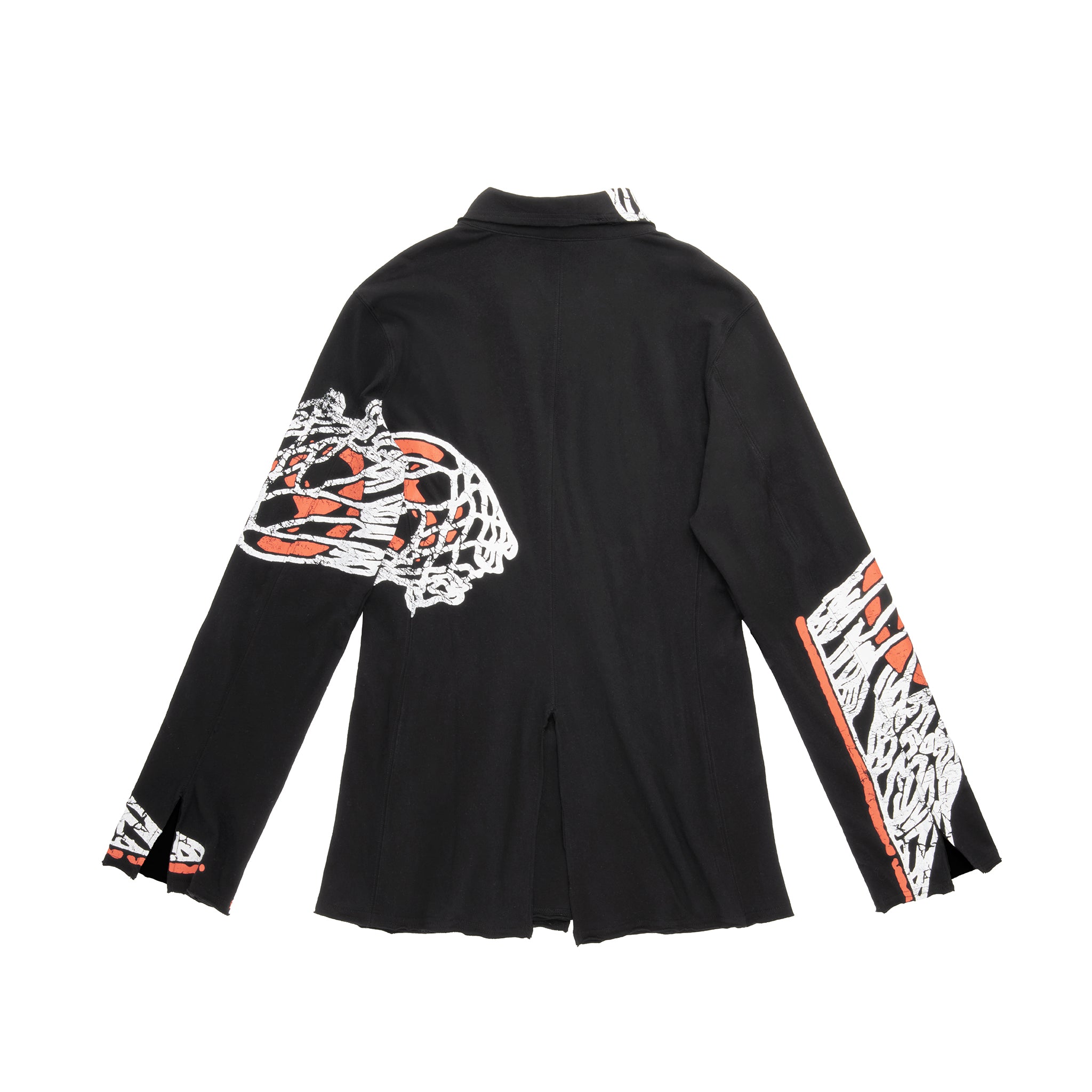 Our T-Shirt Blazer – Now in our signature cracked Basketball print on 100% ultra-soft jersey cotton. Featuring lapel collar, chest pocket, deep slit pockets at the waist, custom faux horn buttons, exposed seams, and raw edges.