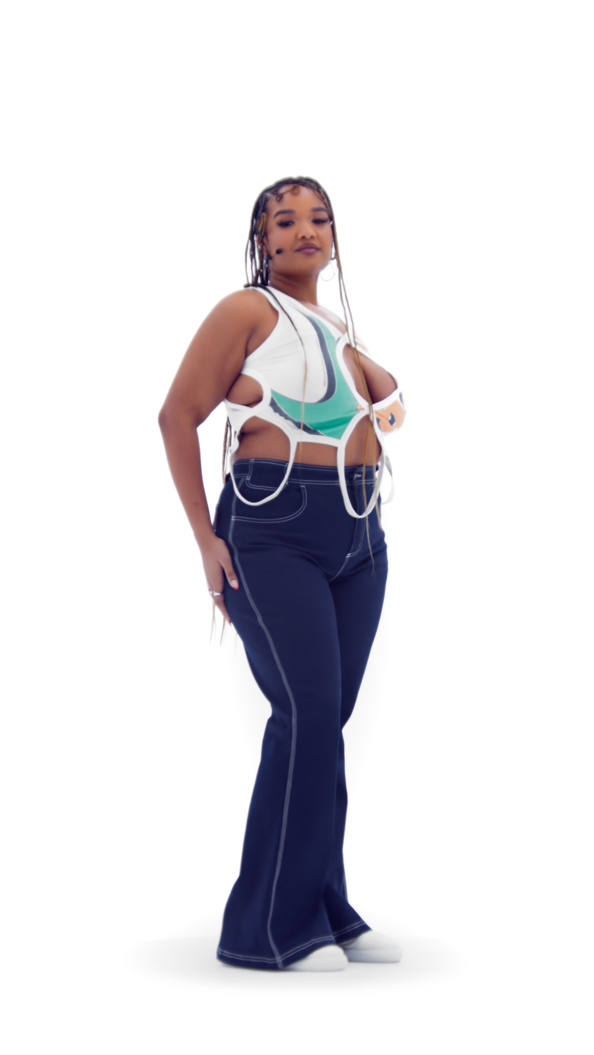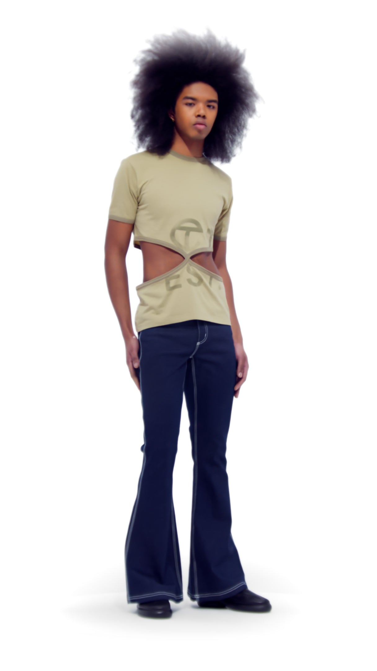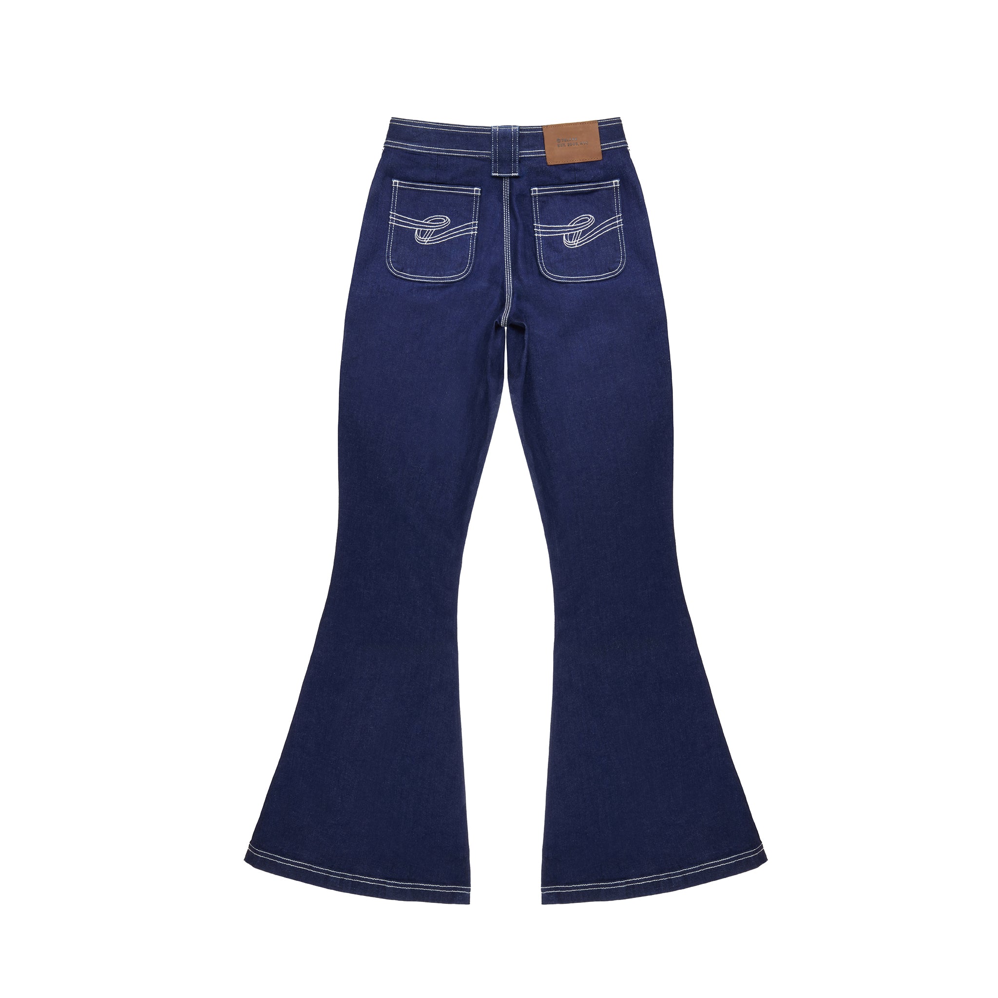 Our signature Bell Bottom Pant in blue stretch denim with contrast stitch — fitted and flaring at the ankle. Featuring deep pockets with logo embroidery, hidden belt loop stash compartments, custom hardware and debossed leather patch on back.