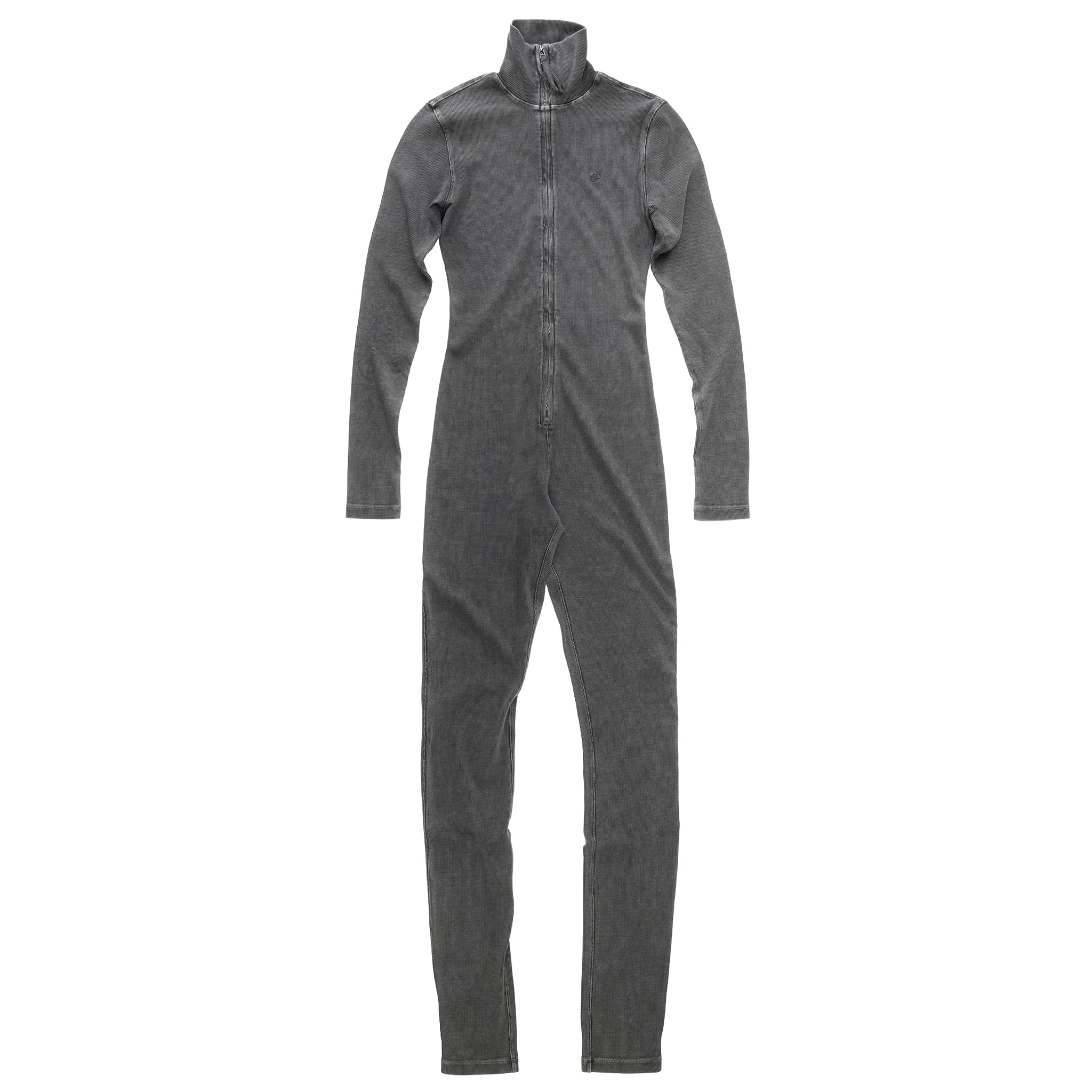 Jersey ribbed knit Bodysuit. Full zipper closure with high colar. Faded wash. Tonal seams. Long sleeves with thumholes. Zipper closure at front panel. Tapered leg. Available in Black and Snake Eyes.