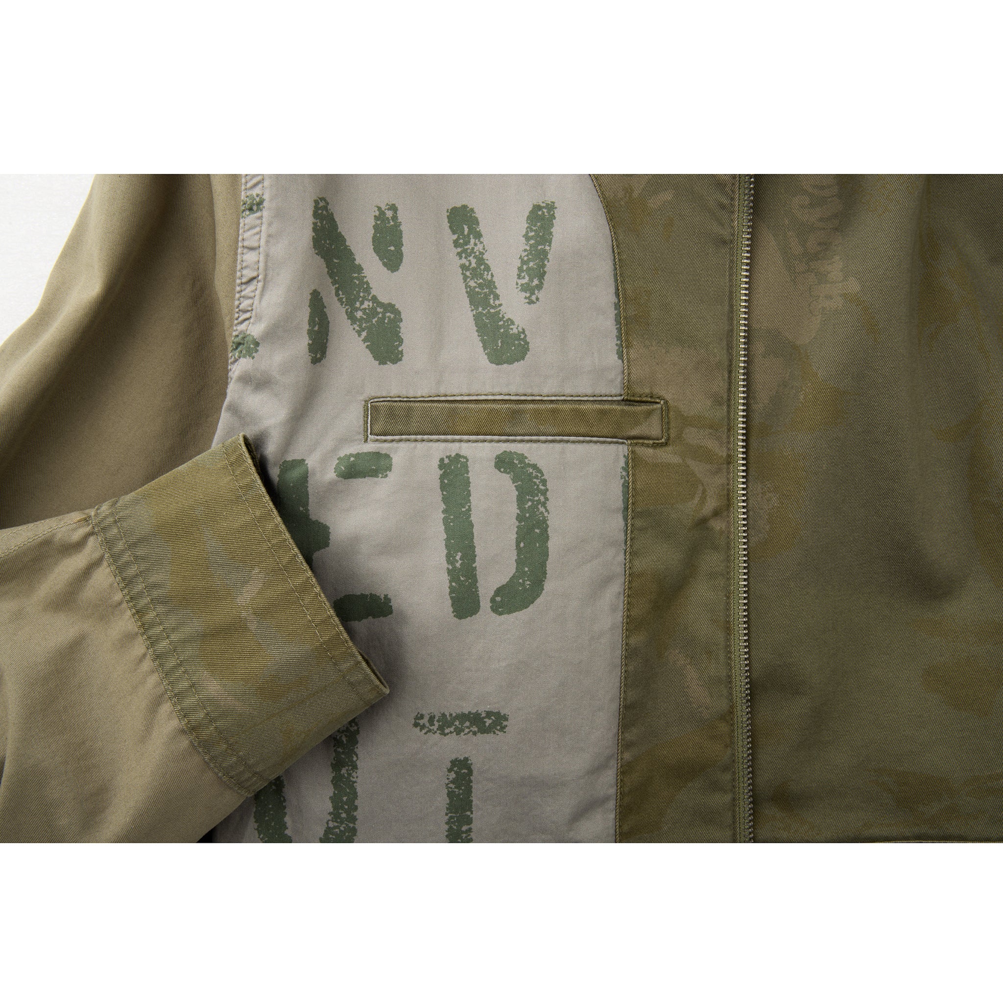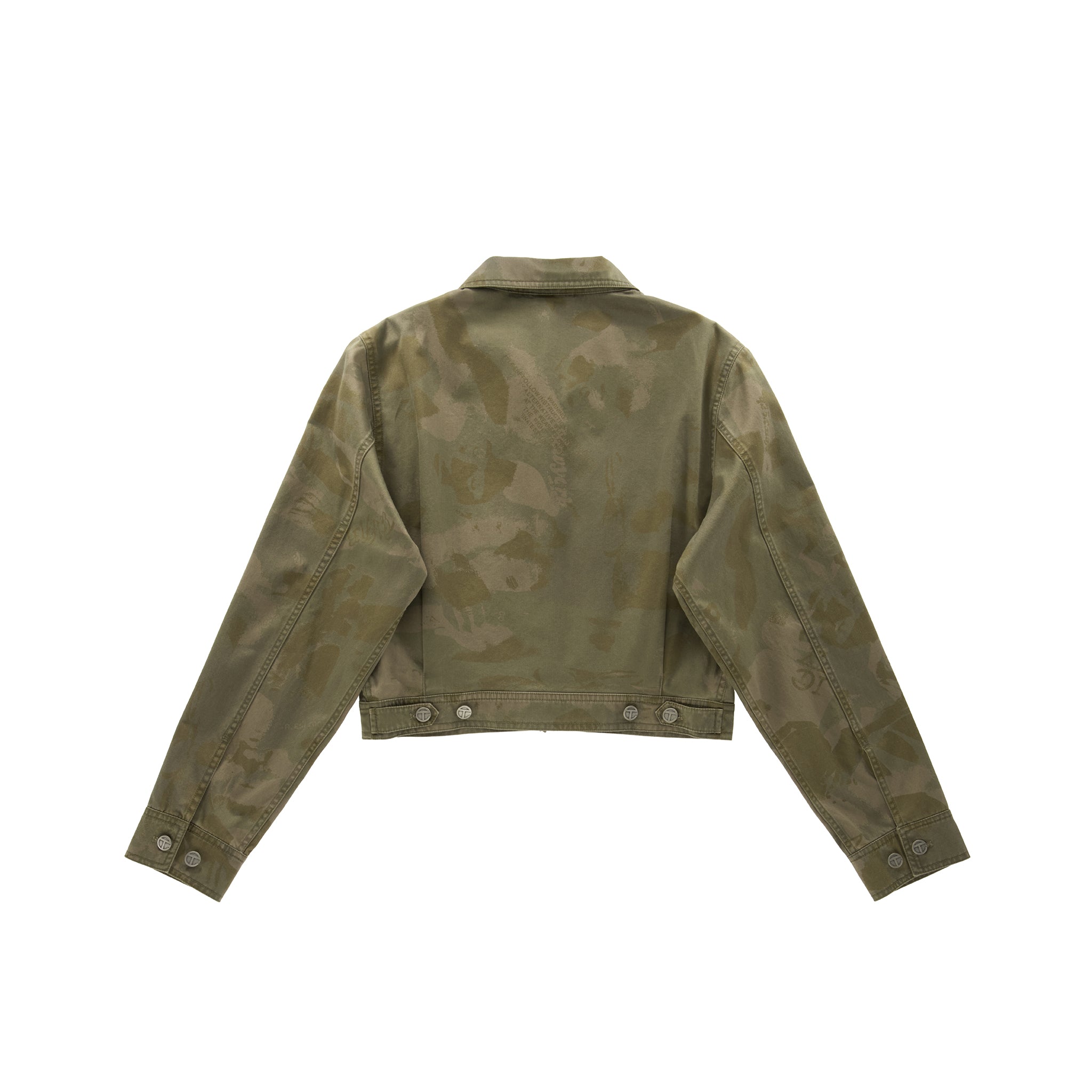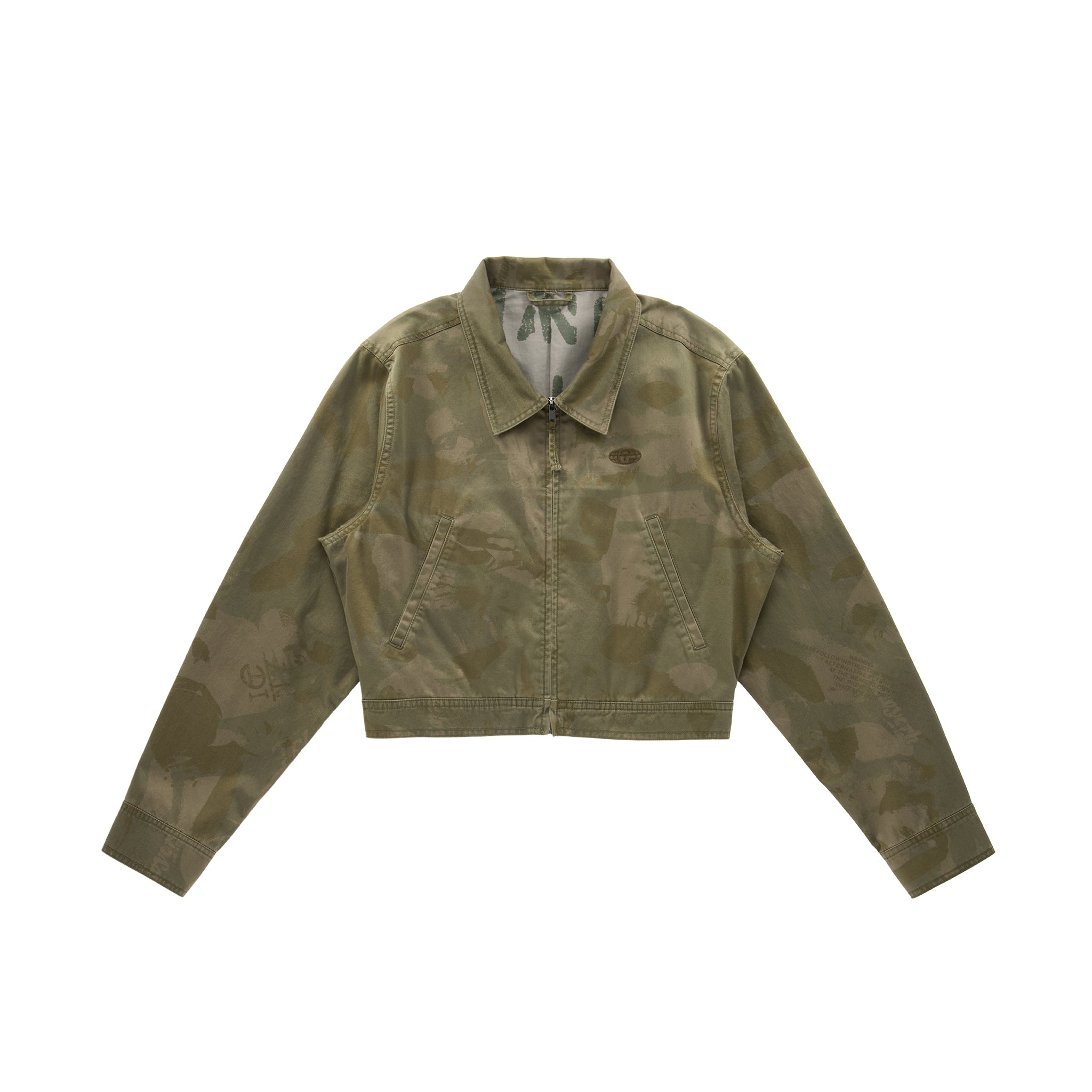 Our iconic Cropped Work Jacket featuring classic pointed collar, full zipper closure, adjustable waist tab, embroidered insignia, custom hardware and interior lining with faded print.