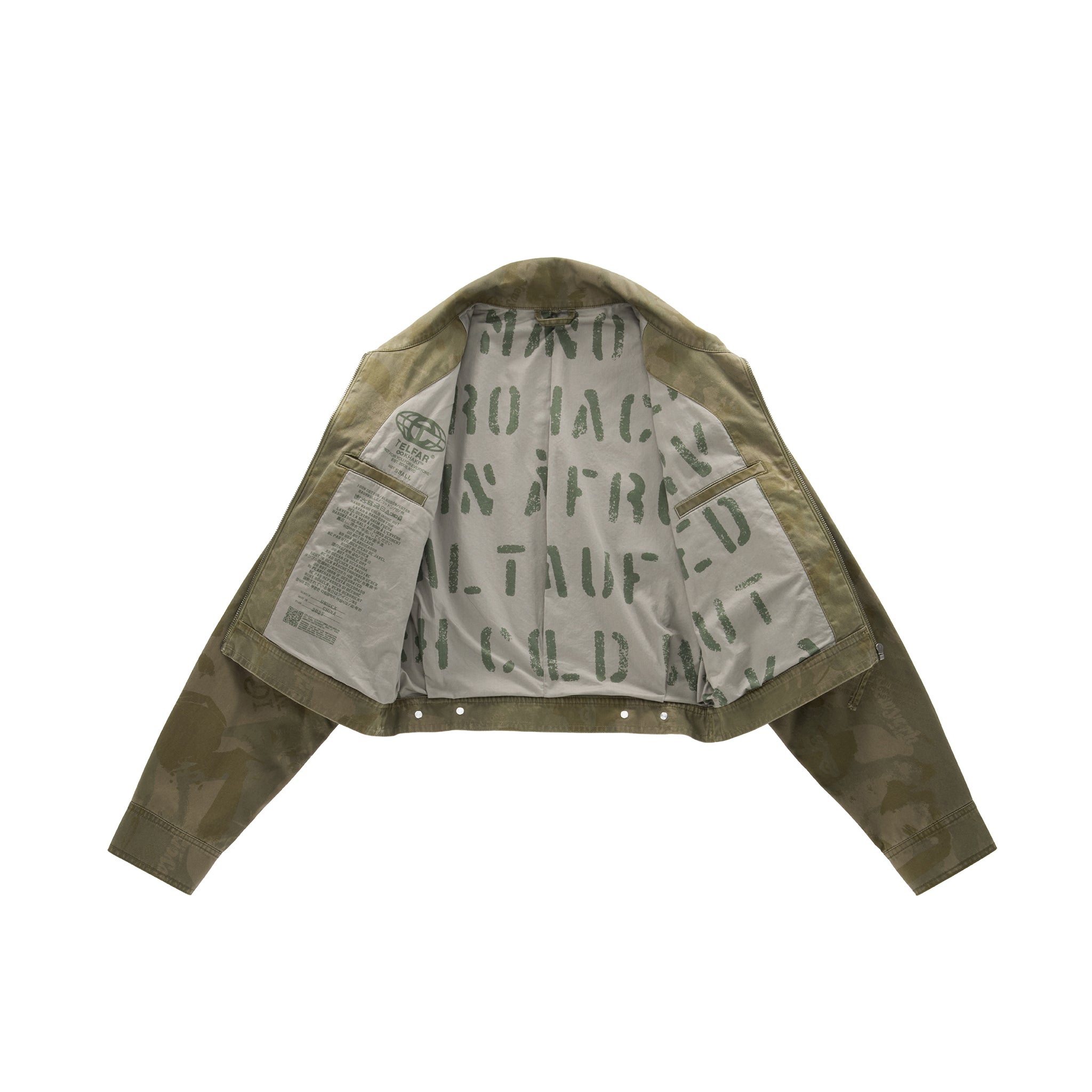 Our iconic Cropped Work Jacket featuring classic pointed collar, full zipper closure, adjustable waist tab, embroidered insignia, custom hardware and interior lining with faded print.