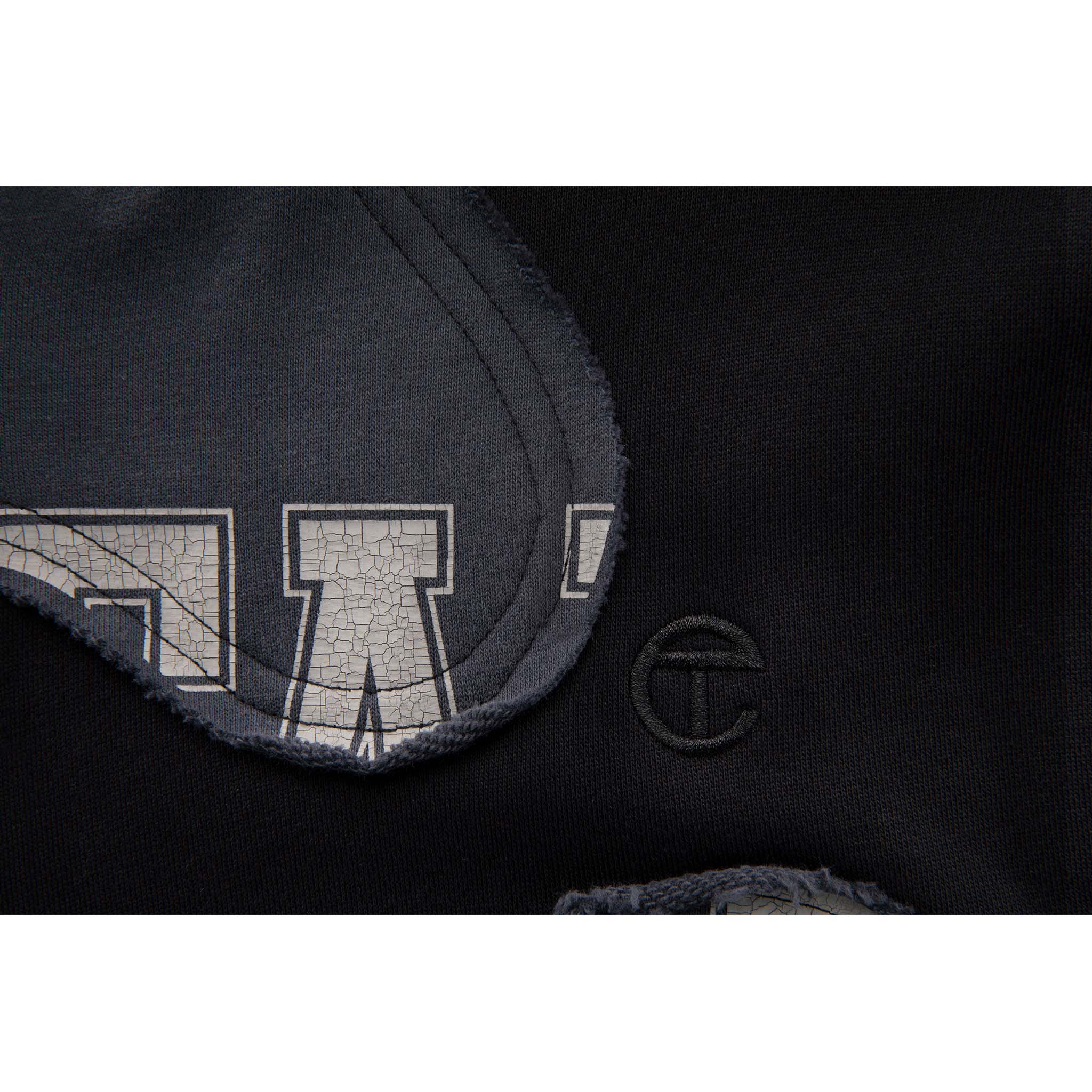 Boxy Camo Hoodie constructed by layering two tones of terry-back fleece in a camouflage pattern. Featuring TELFAR print in cracked ink on chest — obscured by raw edged camo cut-outs.