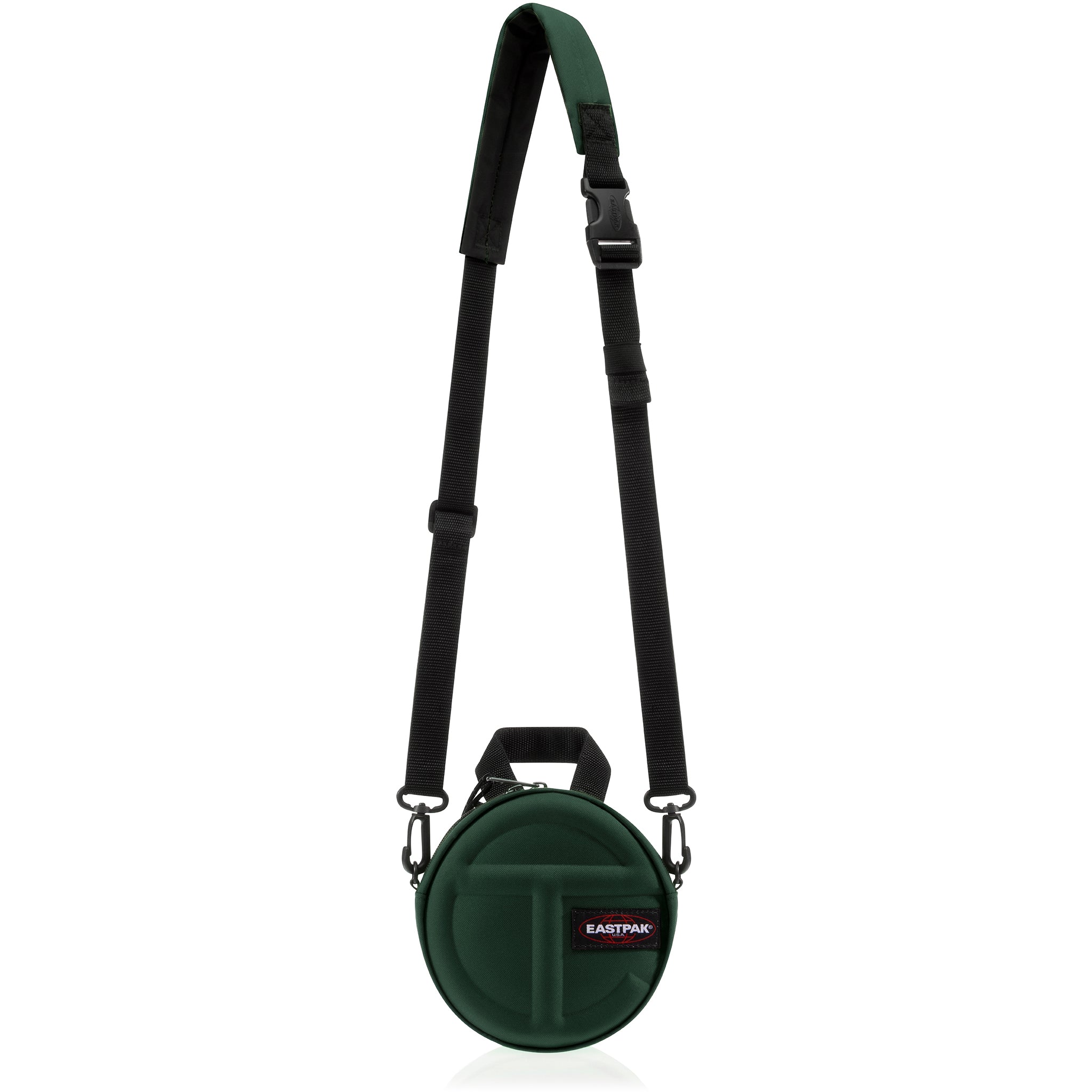 Telfar Circle Bag in tactical canvas with woven hand straps and removable/adjustable padded shoulder strap to be worn crossbody, around the waist or over the shoulder. Exterior features embossed Telfar logo and interior includes zipper pockets and mesh inner compartments.