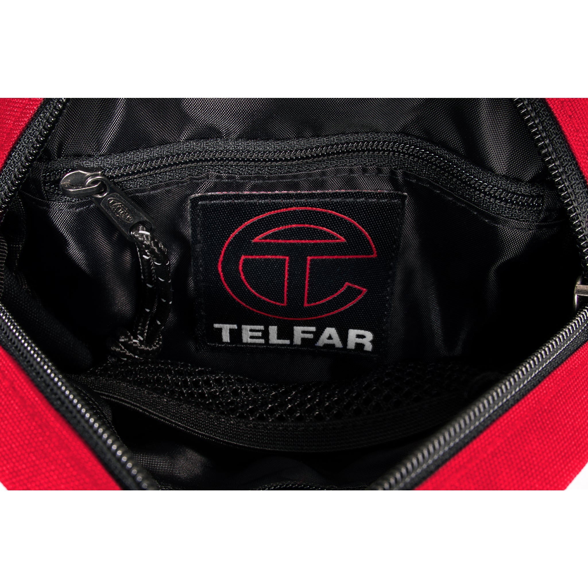 Telfar Circle Bag in tactical canvas with woven hand straps and removable/adjustable padded shoulder strap to be worn crossbody, around the waist or over the shoulder. Exterior features embossed Telfar logo and interior includes zipper pockets and mesh inner compartments.