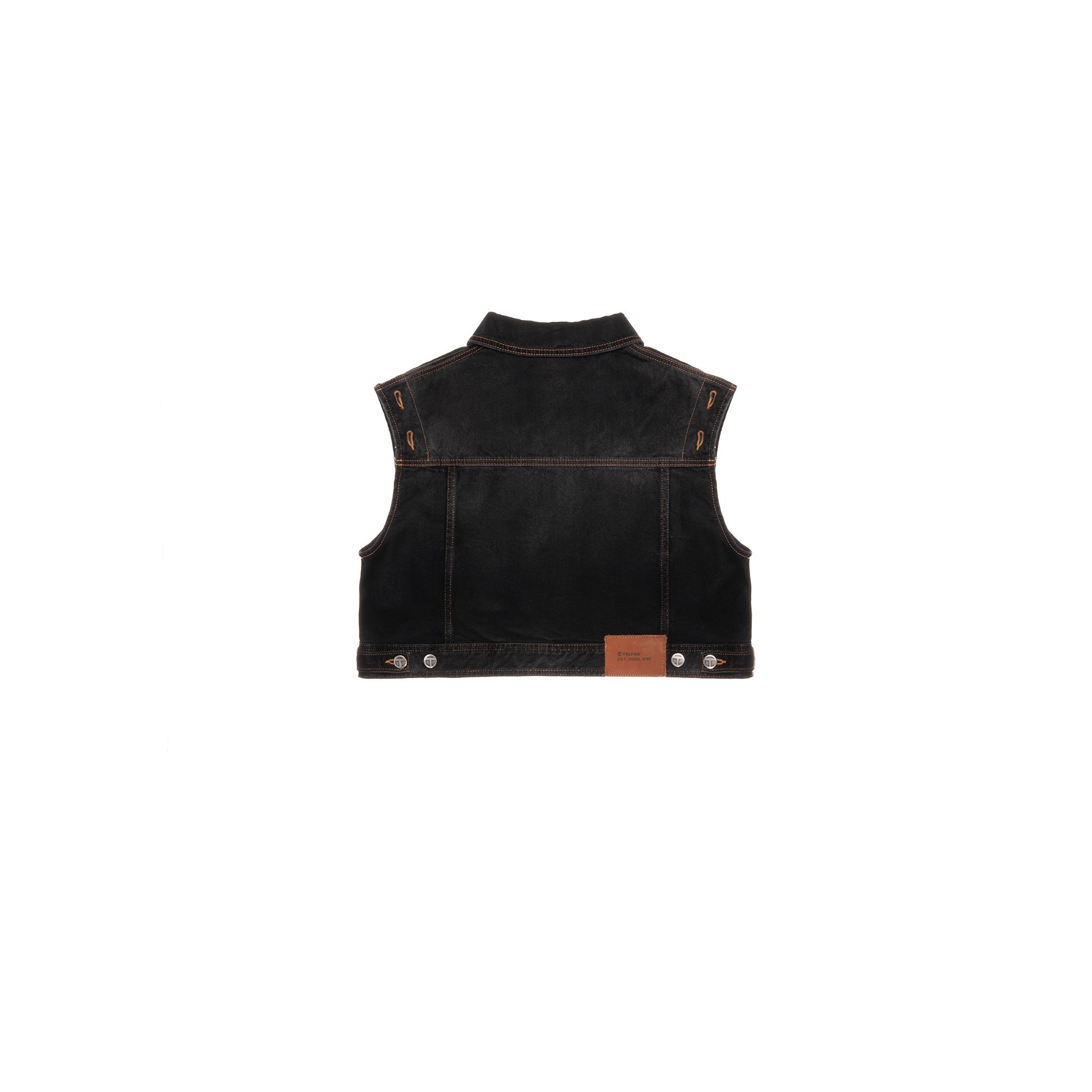 Our iconic Detachable Jean Jacket with cropped body featuring signature removable sleeves, generous chest pockets, adjustable waist tab, custom hardware and debossed leather patch in back. Available in blue and black washed denim.