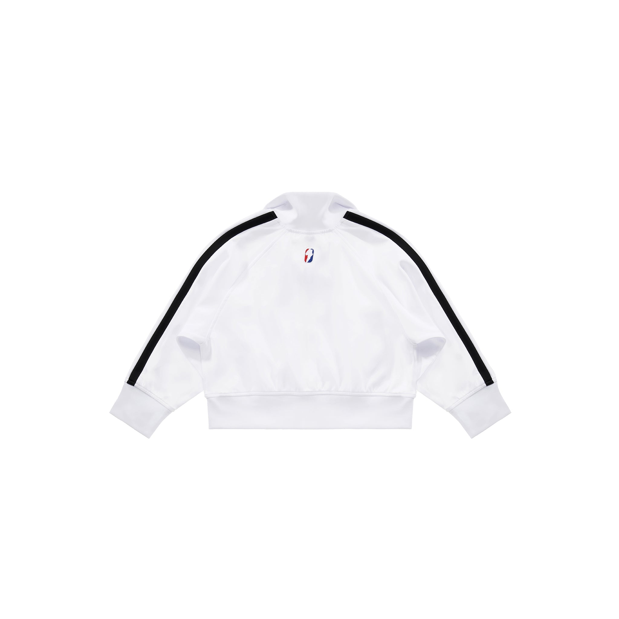 Cropped track jacket featuring sculptural stripes on the sleeves, athletic logo embroidery on the chest, logo zipper pull, welt pockets with zipper closures, ribbed collar, cuffs and waistband.