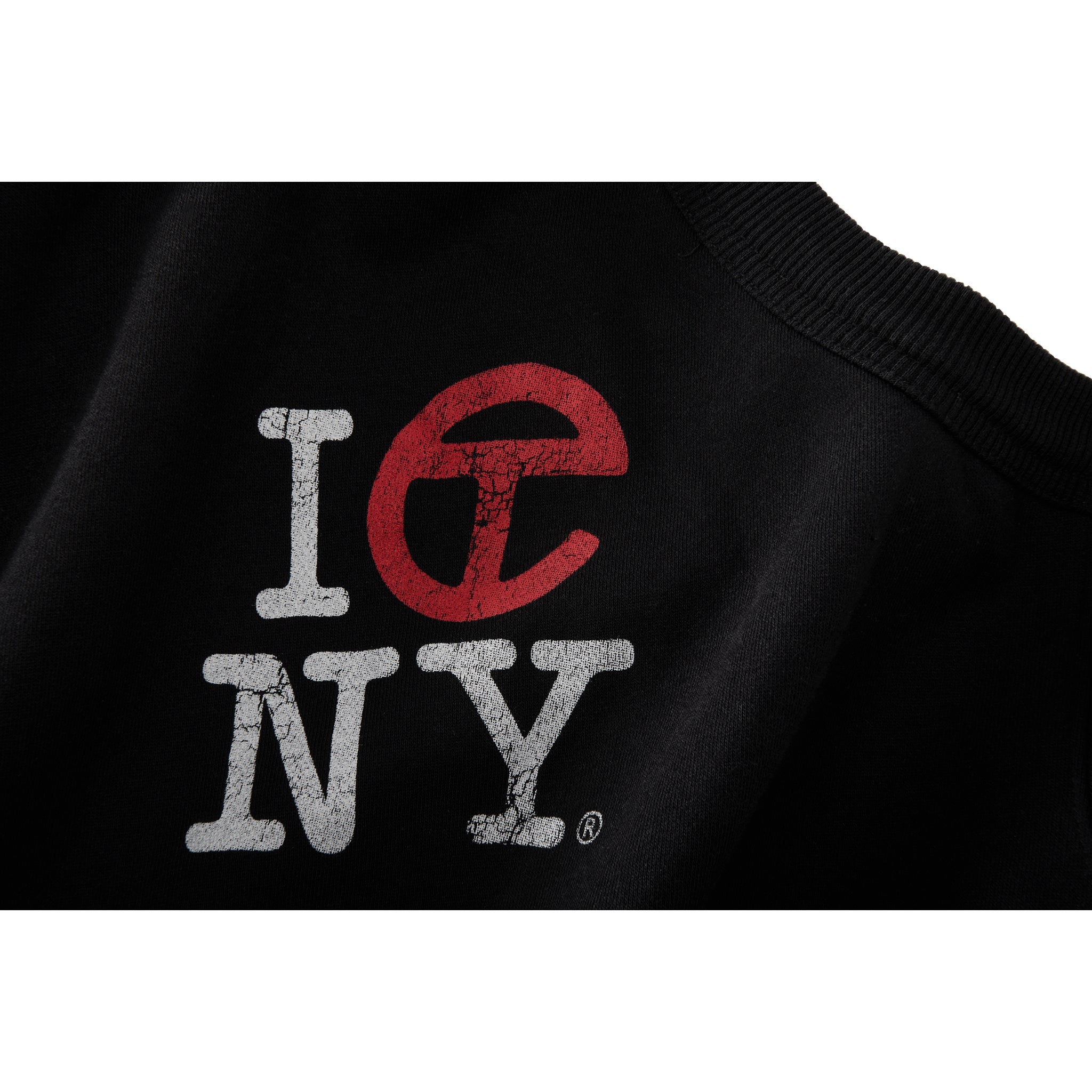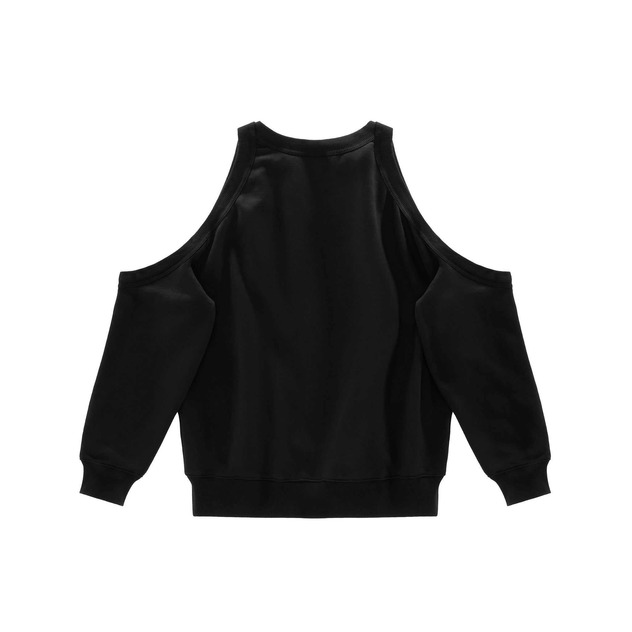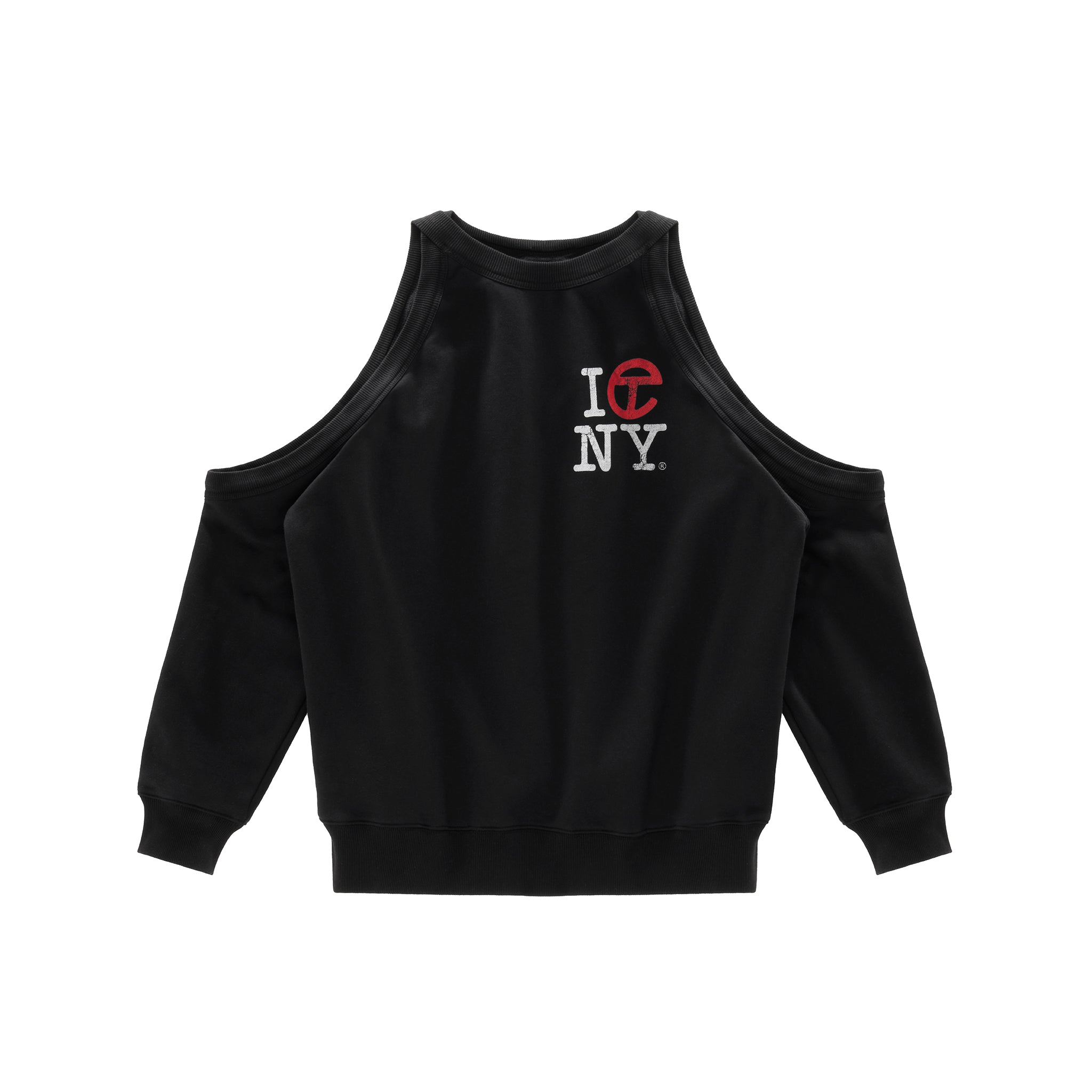 Crewneck featuring cutout infinity loops with ribbed trim, exposed shoulders and signature Canal print in cracked ink.