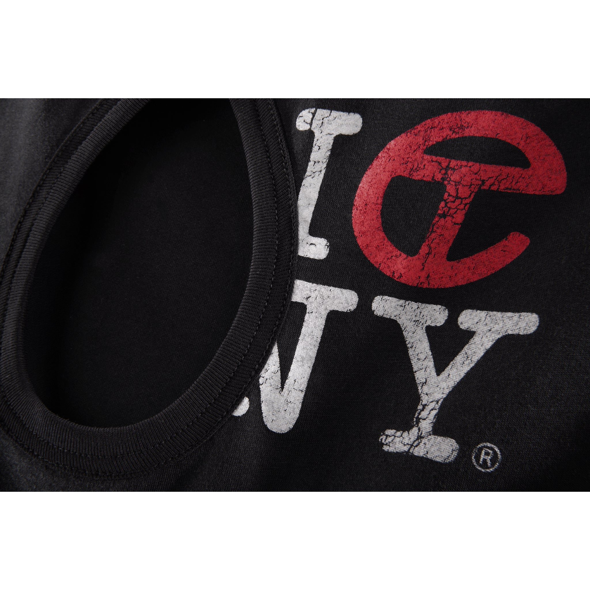 Short sleeve tee featuring low cut neckline, ribbed trim, and infinity keyhole cutout with signature Canal print in cracked ink.