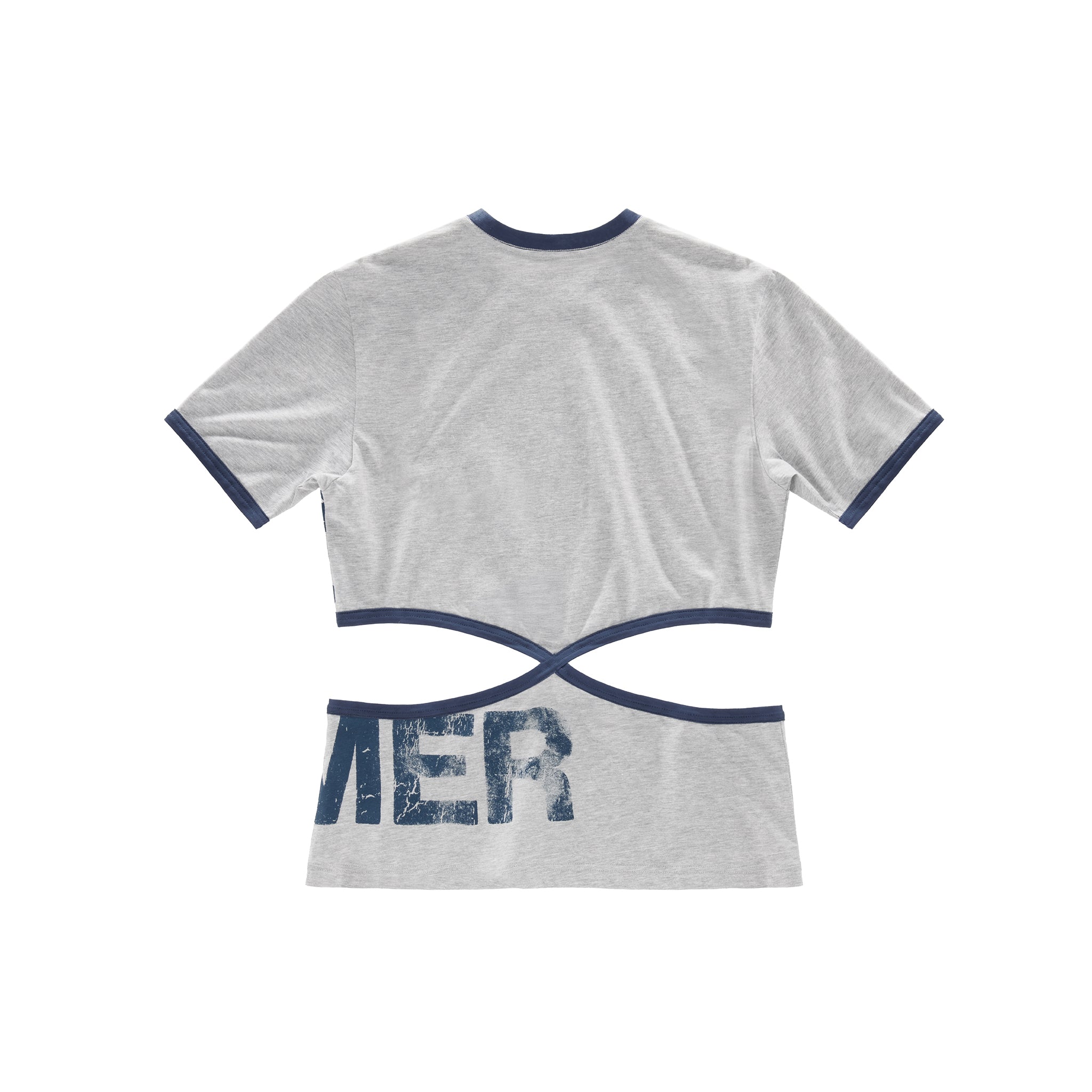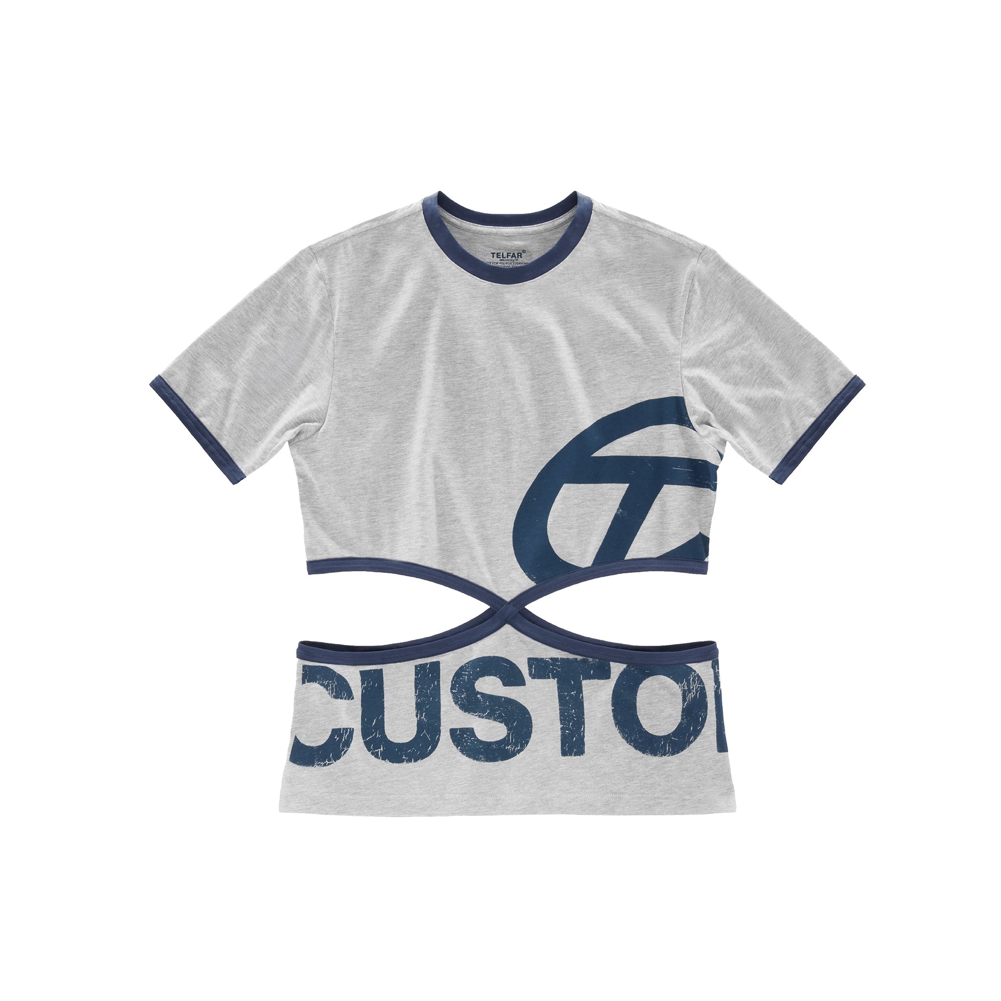 Short sleeve tee featuring infinity cutouts at the waist with ribbed trim and signature Customer insignia.