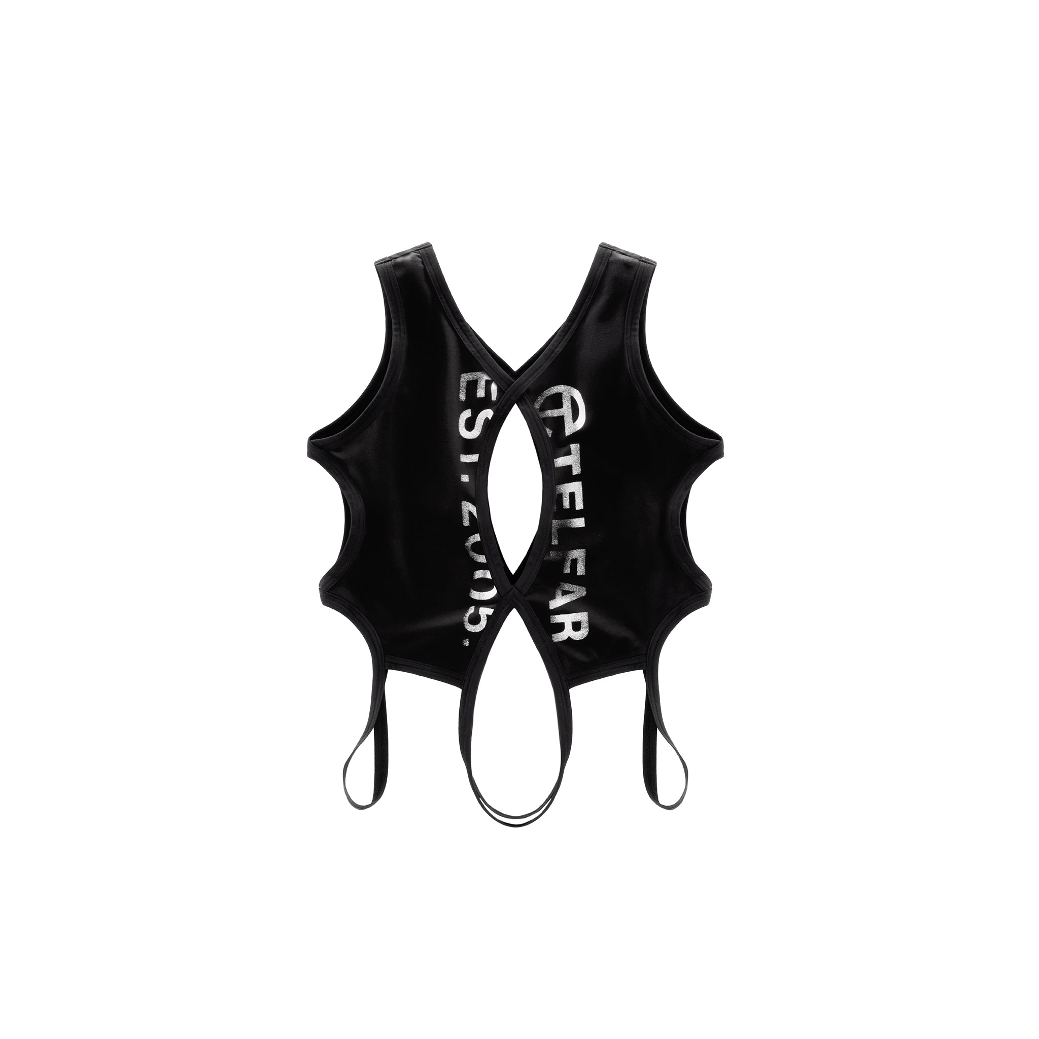 The Helix Tank featuring low cut neckline with ribbed trim, keyhole and infinity loop cutouts with hanging straps and faded logo print.