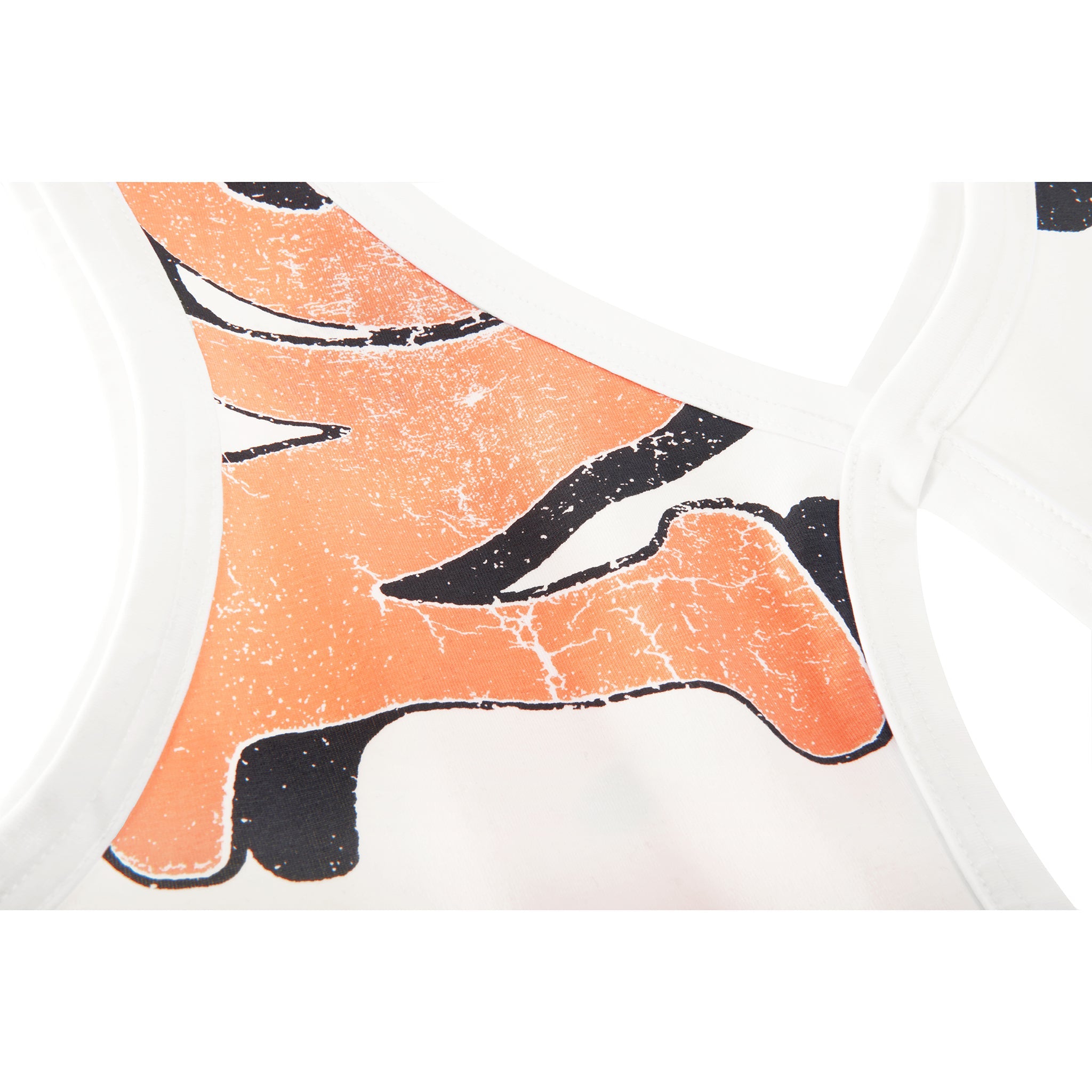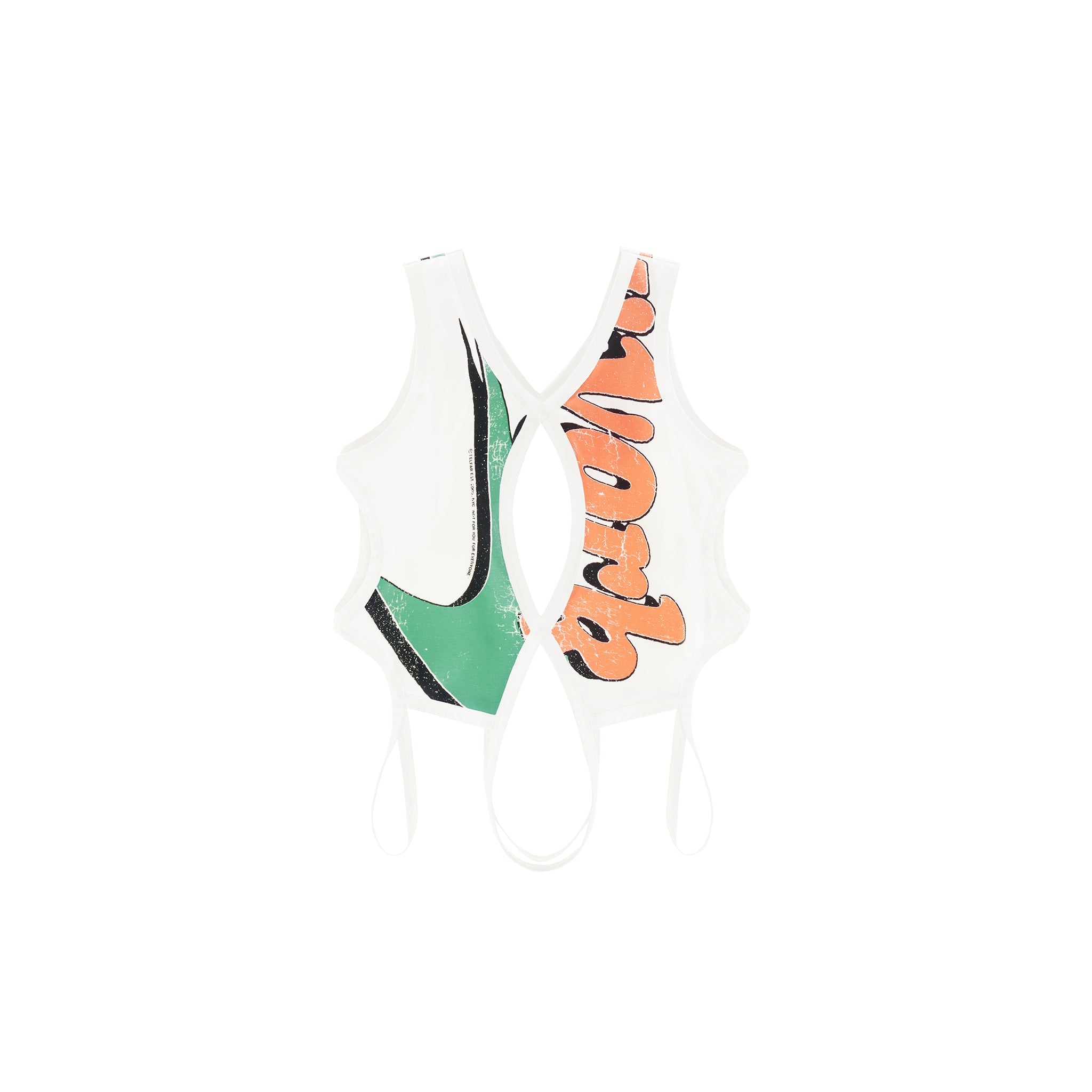 The Helix Tank featuring low cut neckline with ribbed trim, keyhole and infinity loop cutouts with hanging straps and Newyork print in cracked ink.
