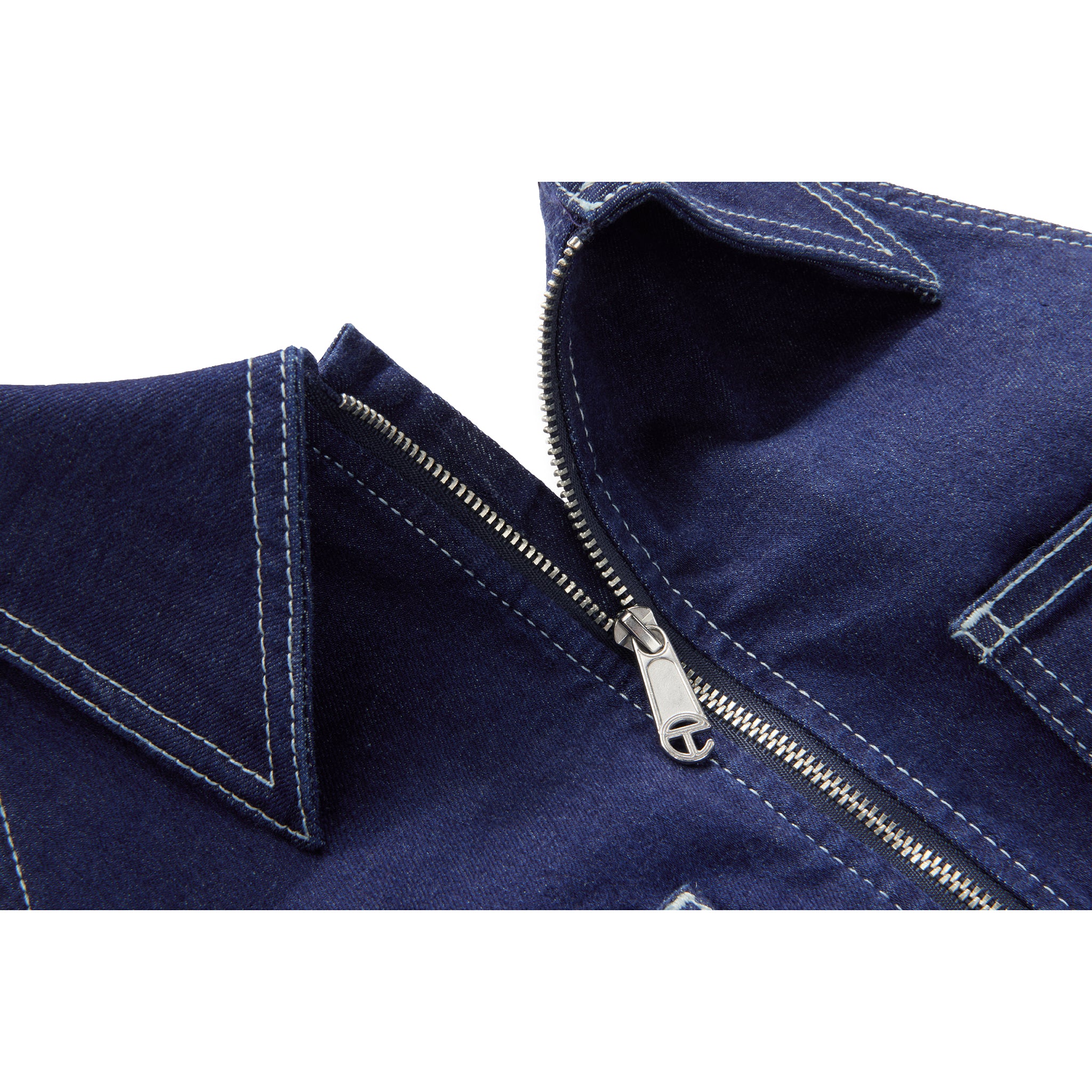 Blue stretch denim romper with contrast stitch. Featuring halter neckline with classic collar, exposed shoulders, front zip, deep pockets with embroidered logo, custom hardware, hidden belt loop stash compartments and debossed leather patch on back.