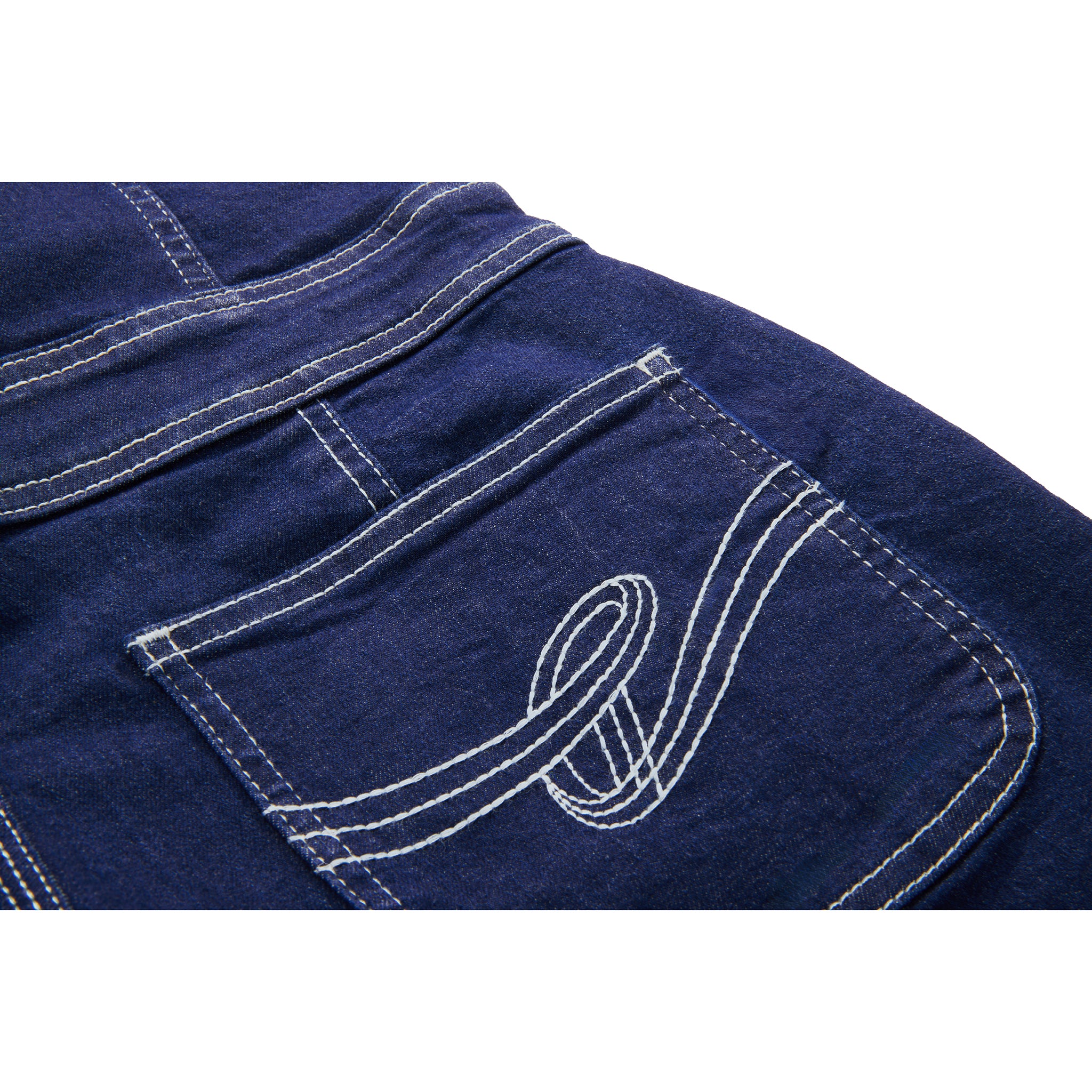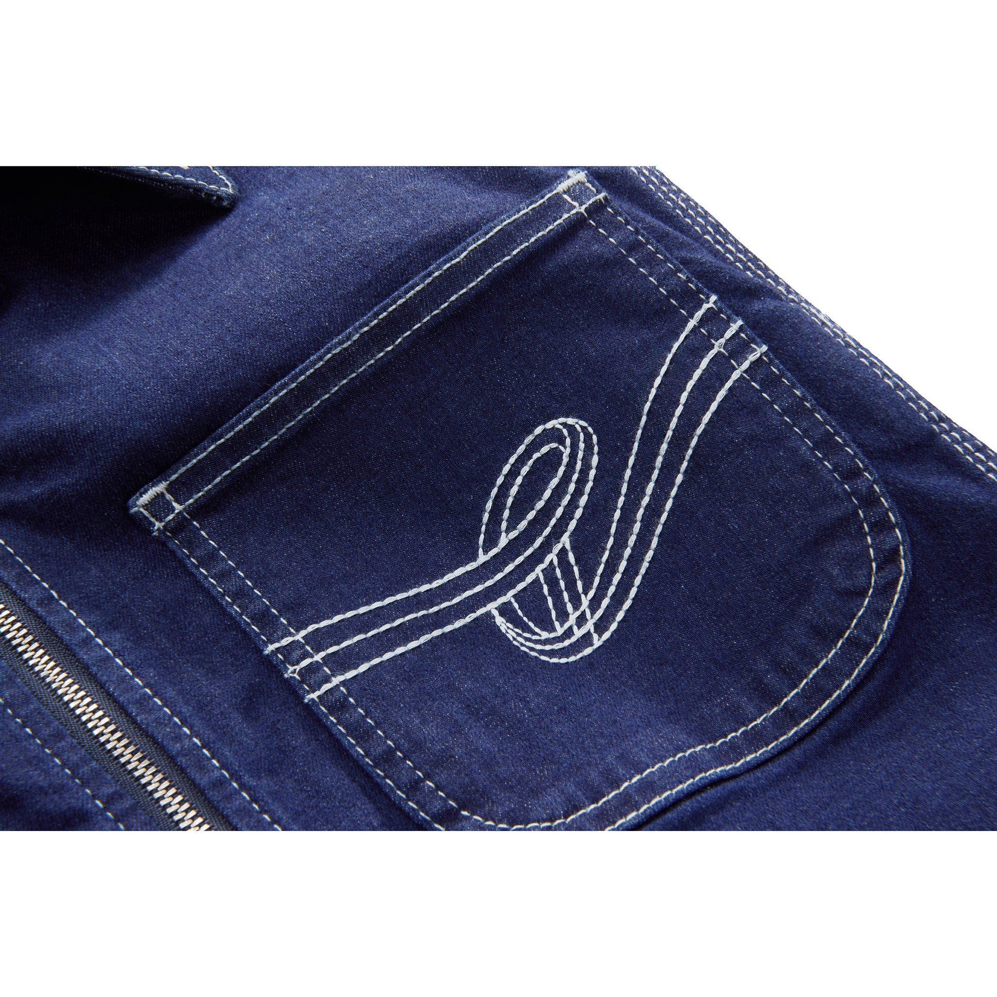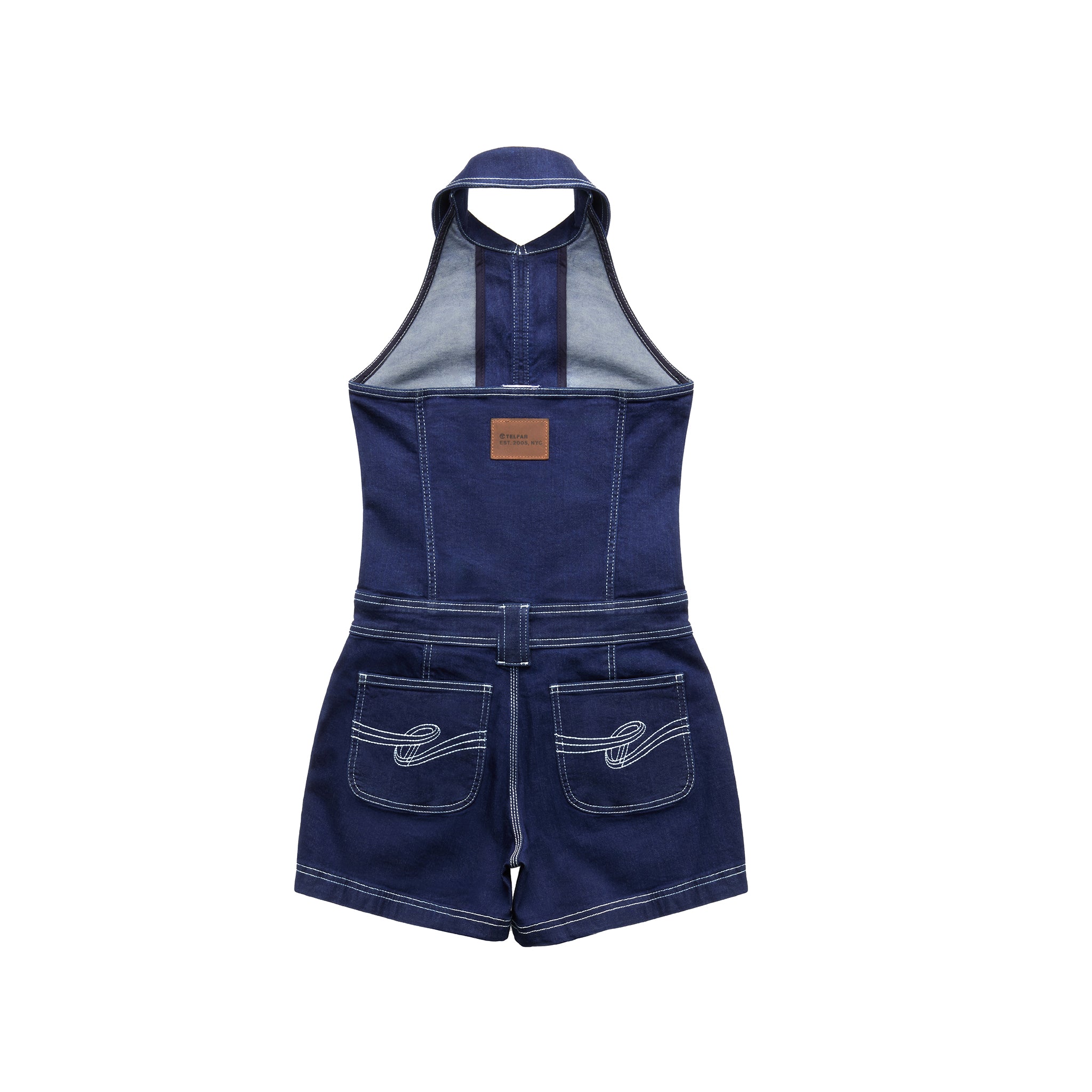 Blue stretch denim romper with contrast stitch. Featuring halter neckline with classic collar, exposed shoulders, front zip, deep pockets with embroidered logo, custom hardware, hidden belt loop stash compartments and debossed leather patch on back.