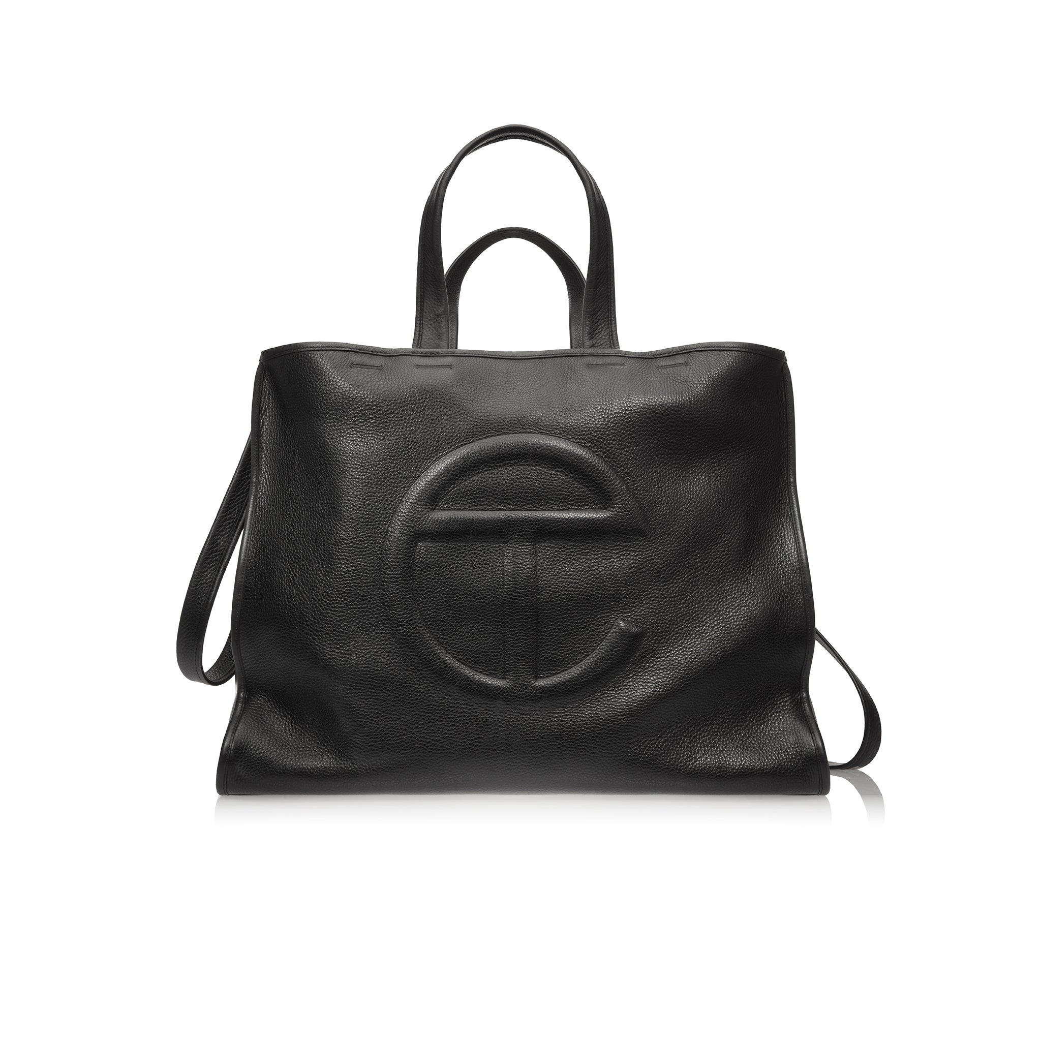 TELFAR’s answer to traditional luxury. Hewn in soft, aniline, full-grain pebble leather — left unlined (since it has nothing to hide), The Carry starts with our iconic tote and deepens in the gusset — to gather  with leather-covered snaps and then drape with an unstructured swagger that you can feel on your eyes. With supple folds that contour to your body and hand straps lengthened luxuriously — so you can now carry The Carry — on your shoulder. Hardware has been intentionally kept to a minimum; studded feet, and an interior key ring.