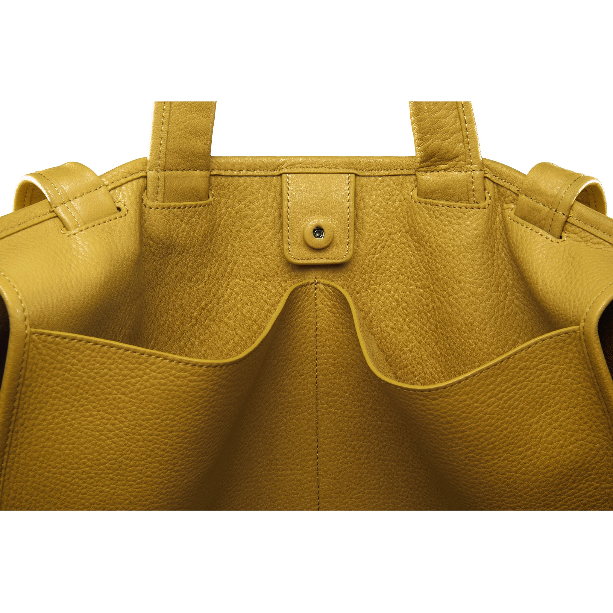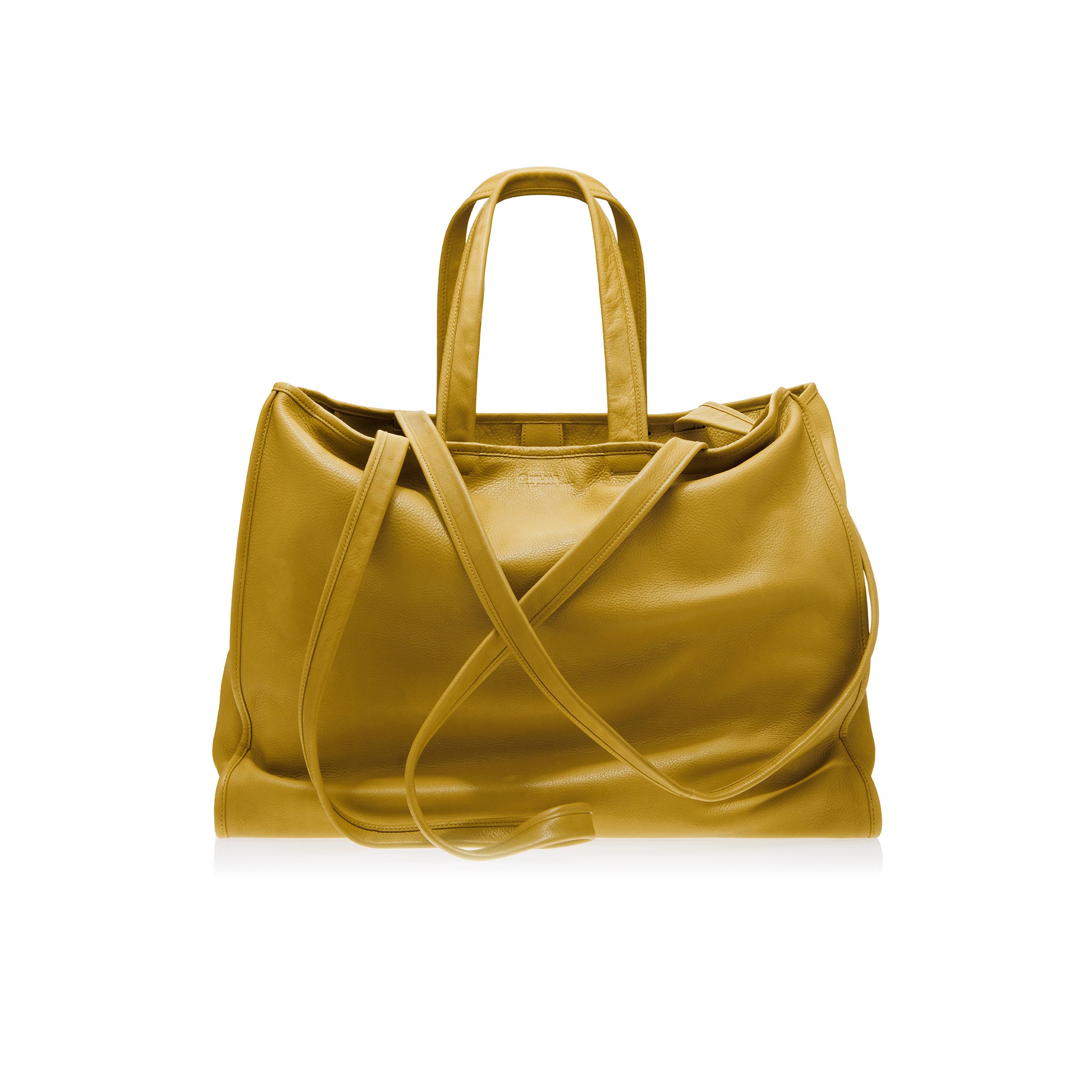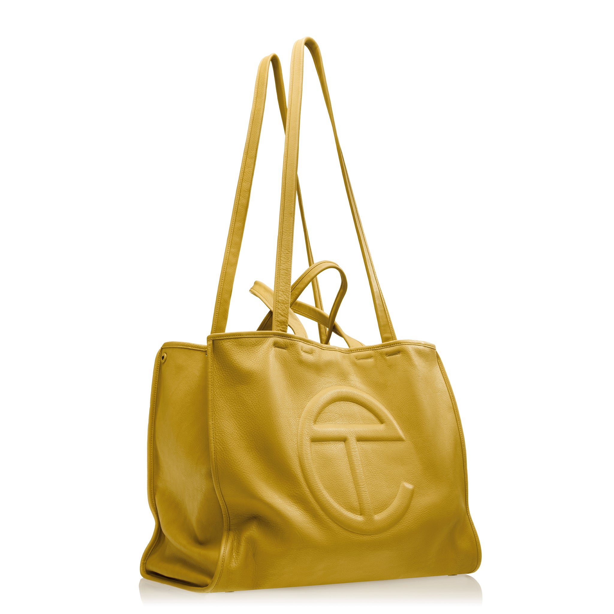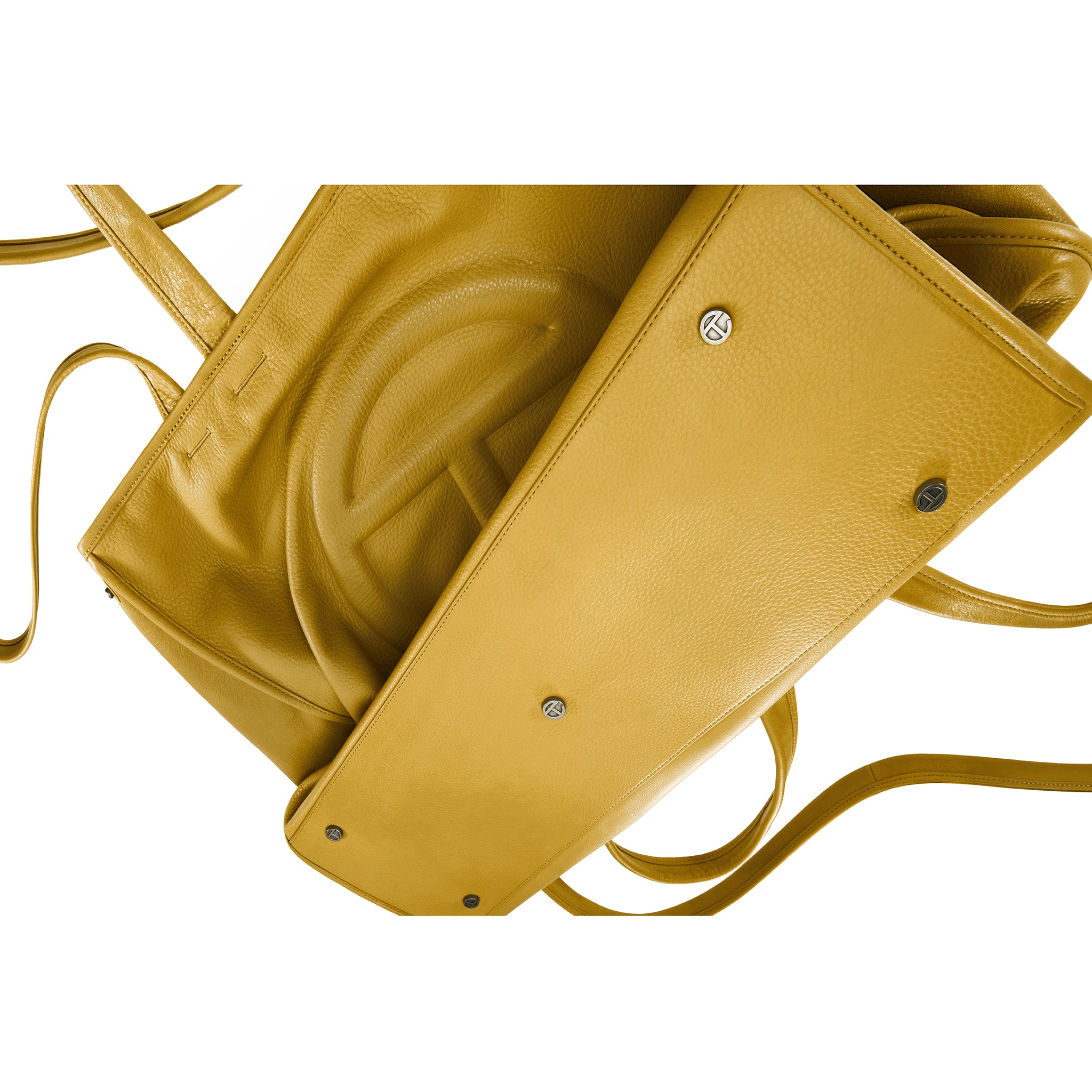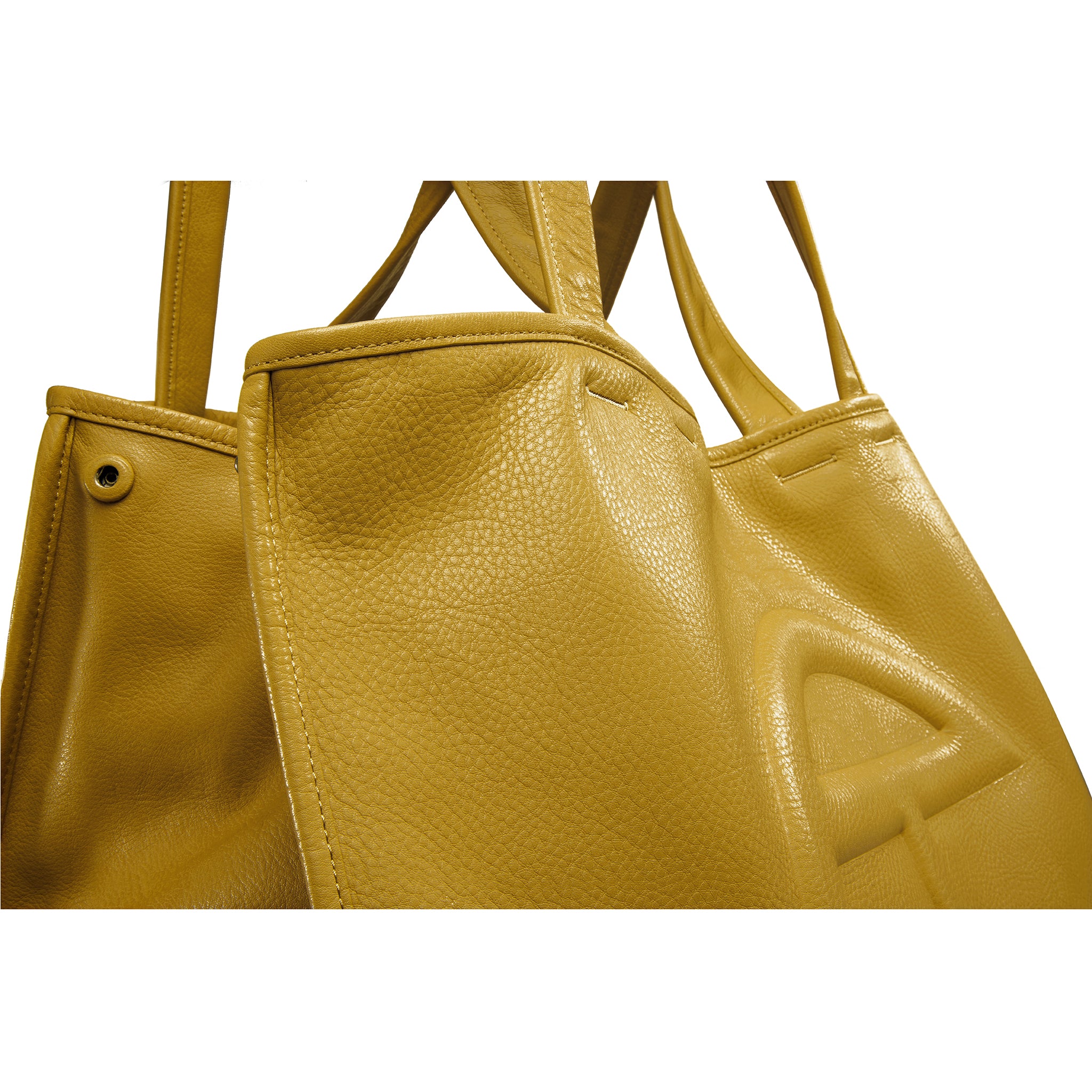 TELFAR’s answer to traditional luxury. Hewn in soft, aniline, full-grain pebble leather — left unlined (since it has nothing to hide), The Carry starts with our iconic tote and deepens in the gusset — to gather  with leather-covered snaps and then drape with an unstructured swagger that you can feel on your eyes. With supple folds that contour to your body and hand straps lengthened luxuriously — so you can now carry The Carry — on your shoulder. Hardware has been intentionally kept to a minimum; studded feet, and an interior key ring.