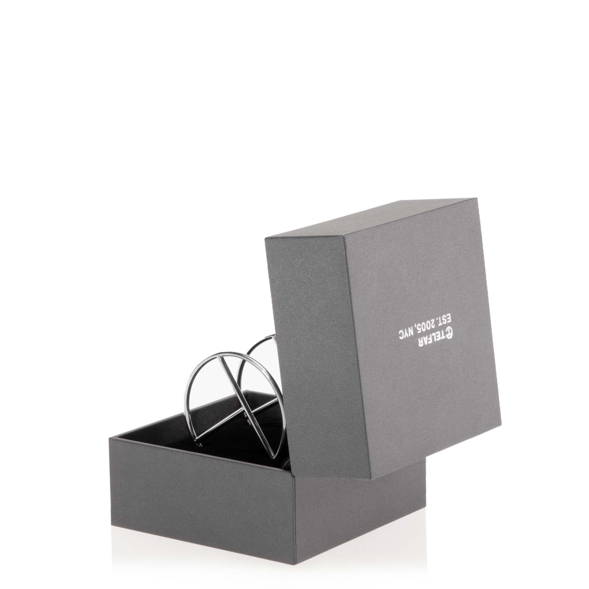 TELFAR logo hoop earring in silver plate. Our biggest, baddest hoop. Always unisex. Sold as a pair. Packaged in custom clamshell box with silver foil insignia.