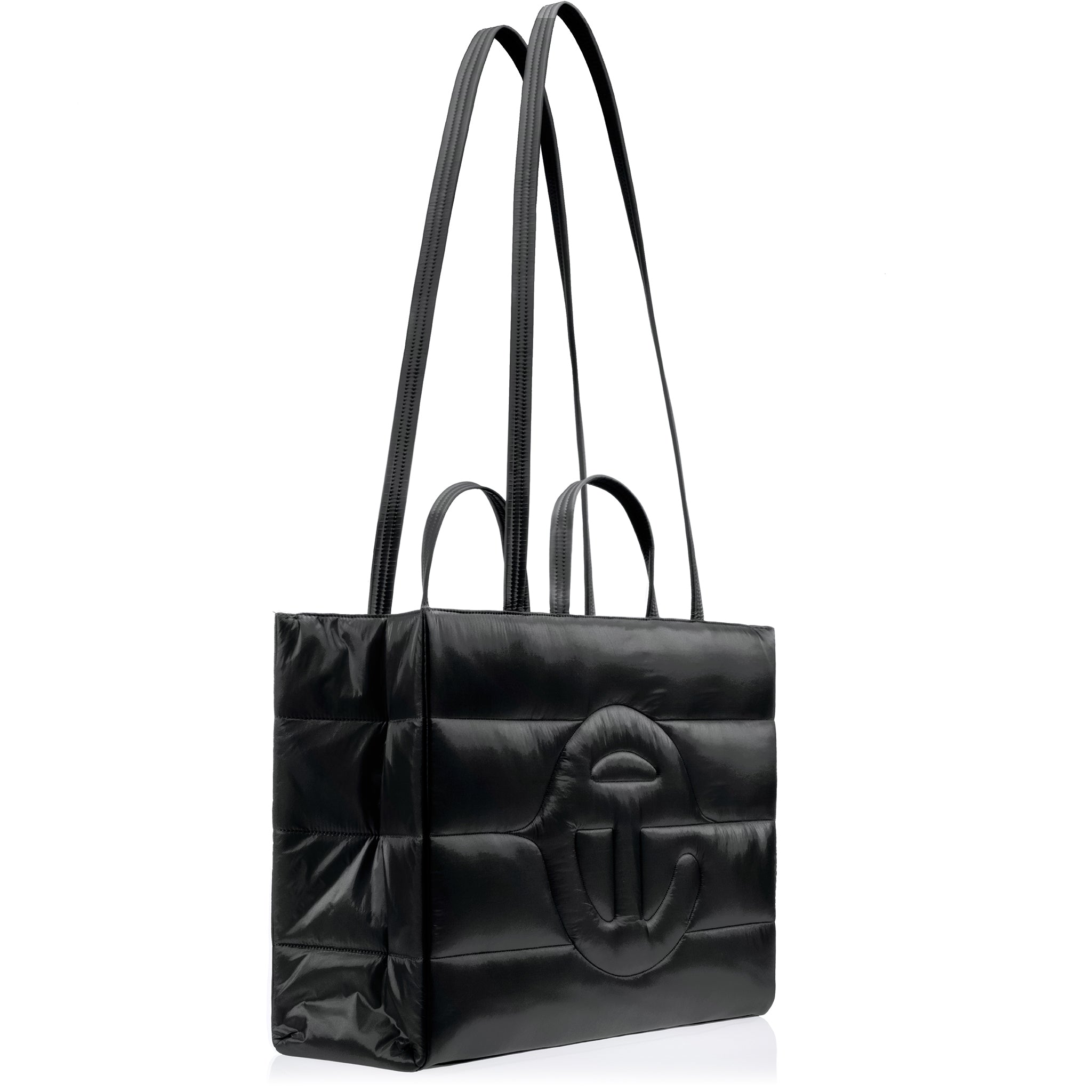 Our iconic Unisex TELFAR Bag, engineered in quilted nylon puff — available for the first time in LARGE size. Featuring a double strap to be held in hand, over the shoulder or cross-body, with a magnetic snap closure and interior zip pocket.