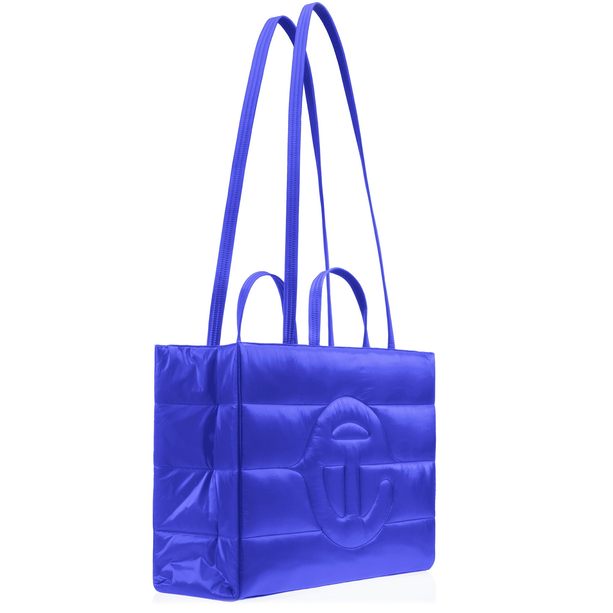 Our iconic Unisex TELFAR Bag, engineered in quilted nylon puff — available for the first time in LARGE size. Featuring a double strap to be held in hand, over the shoulder or cross-body, with a magnetic snap closure and interior zip pocket.