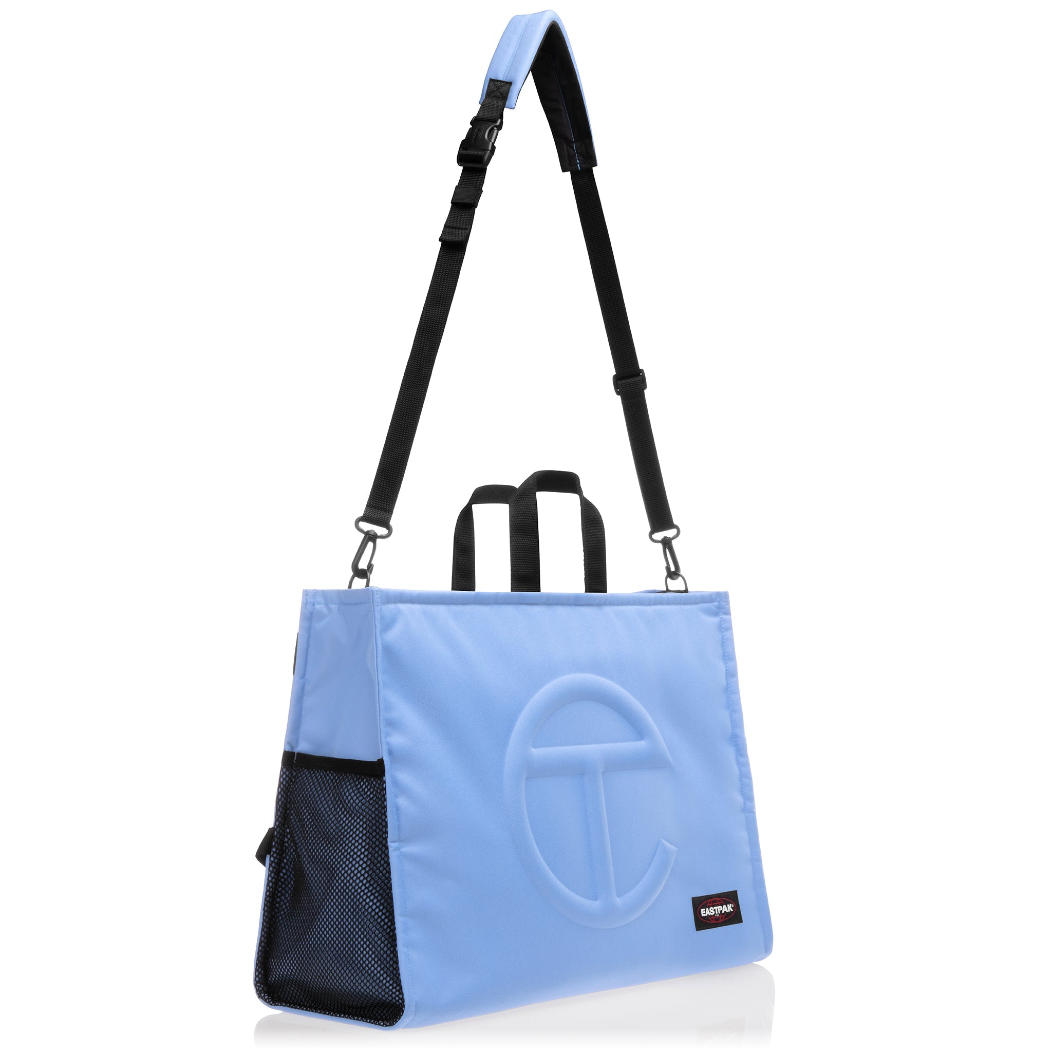 The iconic Large Shopper in tactical canvas with woven hand straps, removable/adjustable padded shoulder strap and adjustable backpack straps on the reverse side. Exterior features embossed Telfar logo, top zipper closure, and side mesh pockets. Interior features zipper pocket and padded laptop compartment.