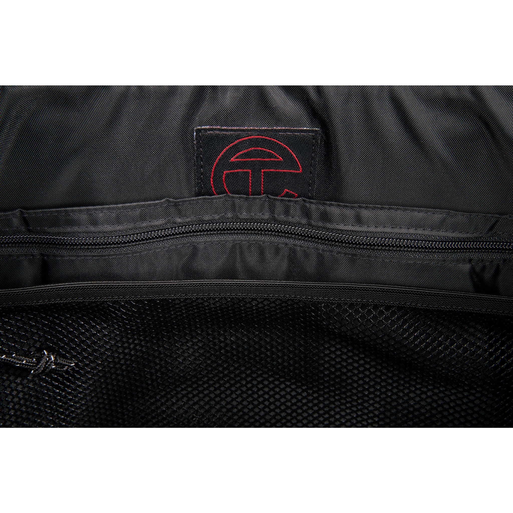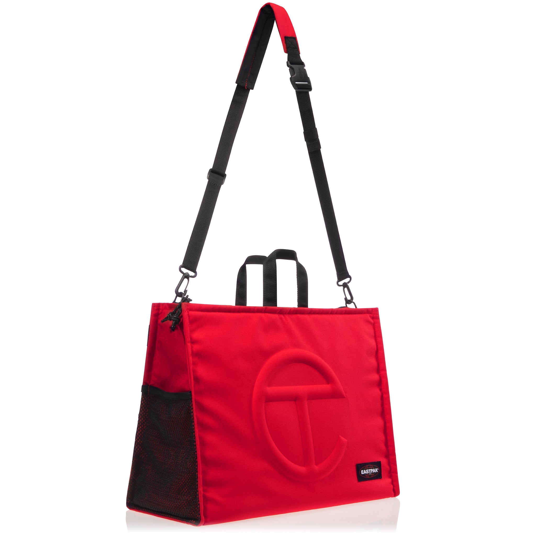 The iconic Large Shopper in tactical canvas with woven hand straps, removable/adjustable padded shoulder strap and adjustable backpack straps on the reverse side. Exterior features embossed Telfar logo, top zipper closure, and side mesh pockets. Interior features zipper pocket and padded laptop compartment.
