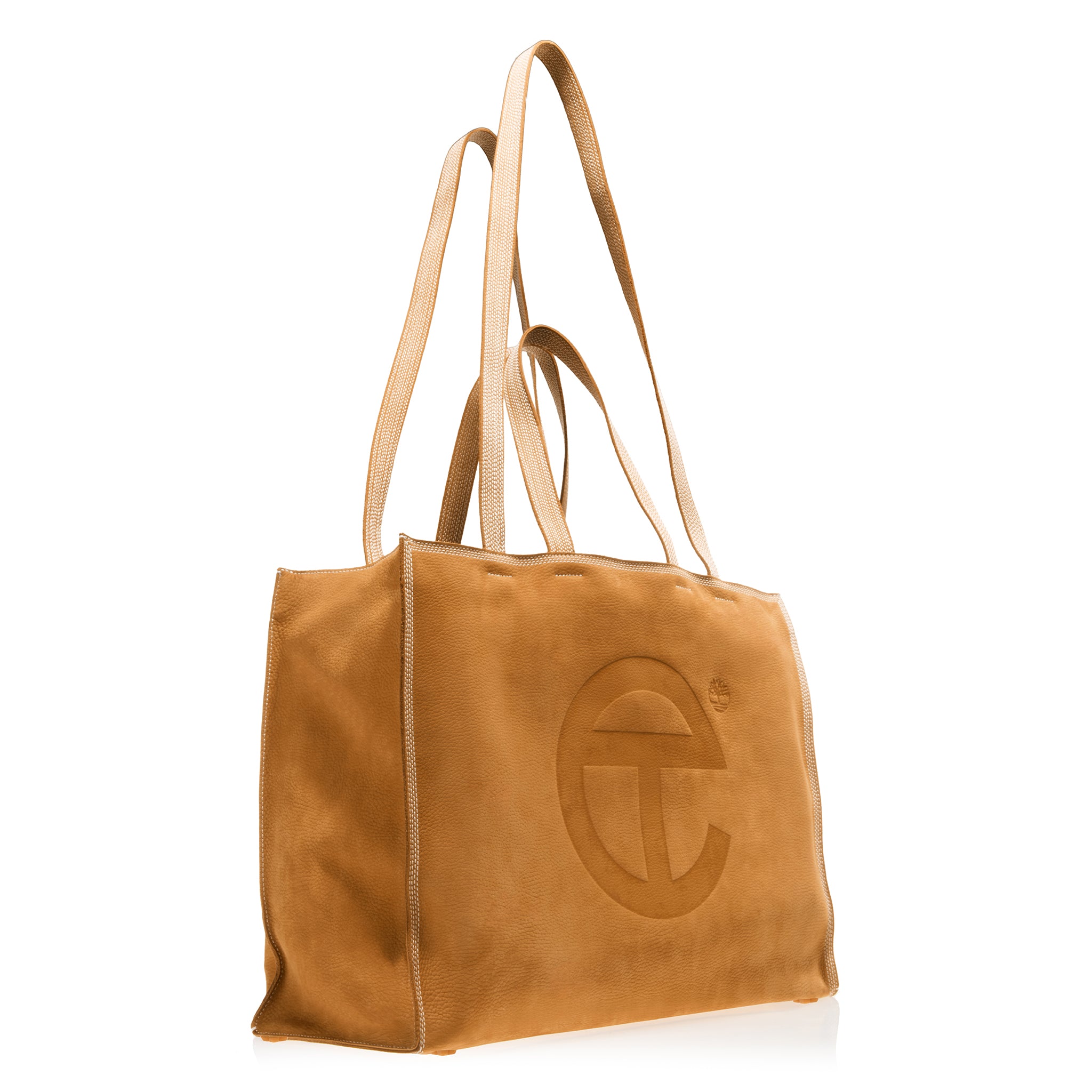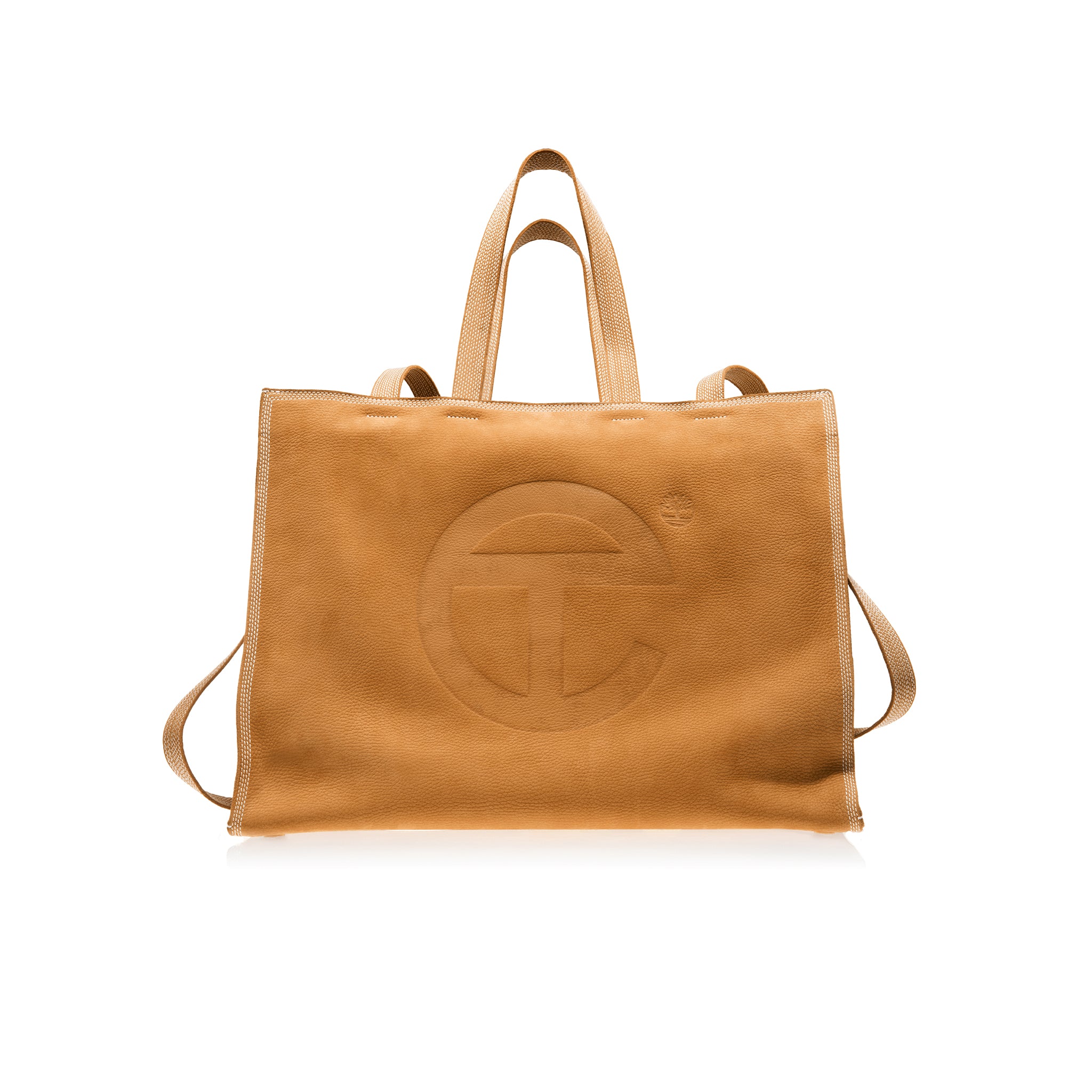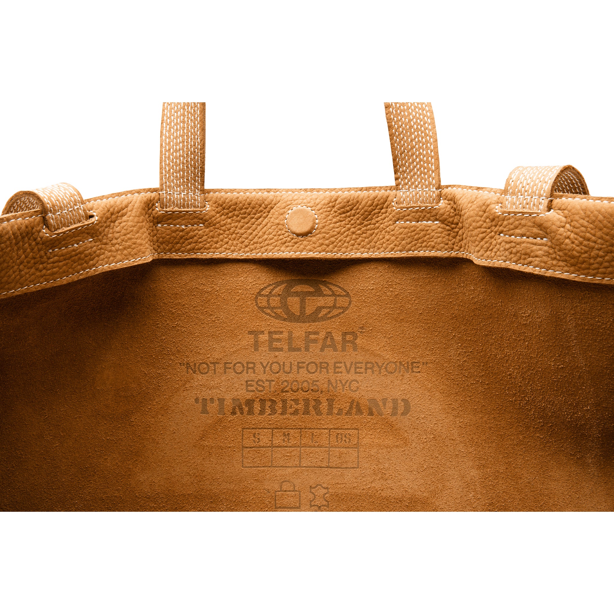The Telfar Timberland shoppers: hewn in supple pebbled nubuck leather is both our softest and hardest ever collab. Our thick nubuck leather requires no internal structure or lining and gives a suave drape; with the iconic heavy quadruple needle stitch running its straps and our logo burned into its front. But we saved the best for last — with the base of each bag studded with four natural rubber feet taken straight from the iconic tread of the Timberland boot. Available in wheat and black.