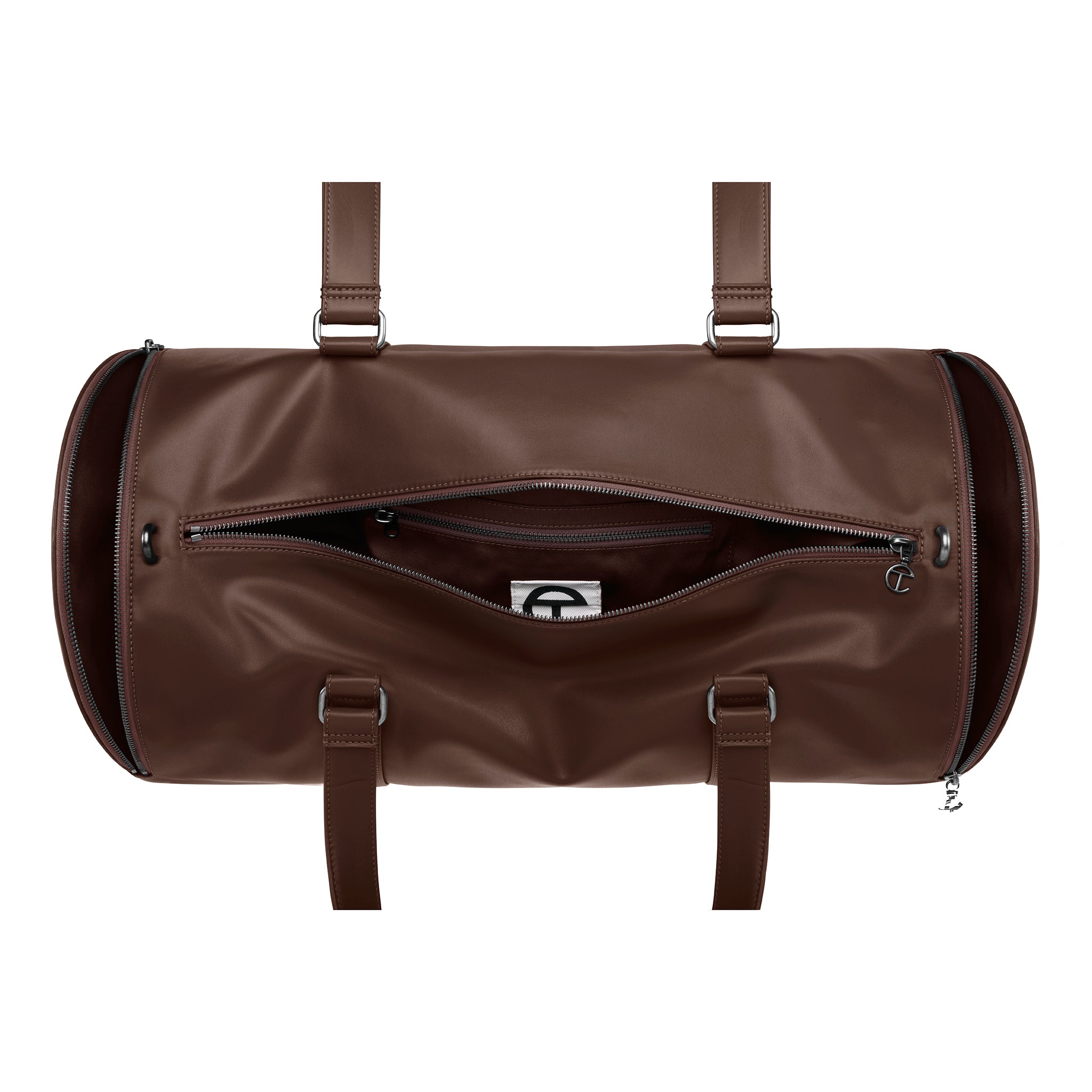 The Large TELFAR Duffle is a universal unisex icon in faux leather — perfect for travel, the gym or whatever you get up to. Featuring twin functional embossed TC logo side pockets, a generous interior with inner pocket, custom antique silver hardware and logo zipper pulls, twin handles and a detachable shoulder strap.