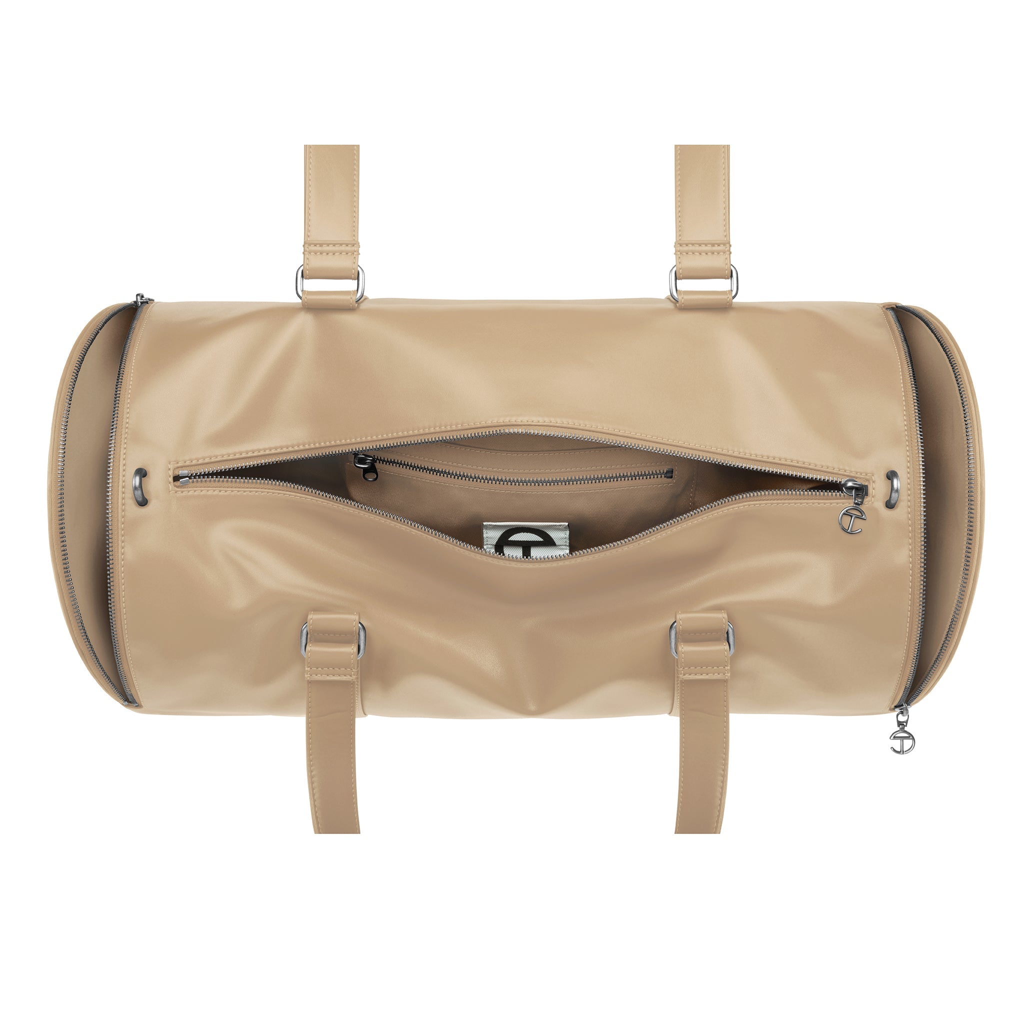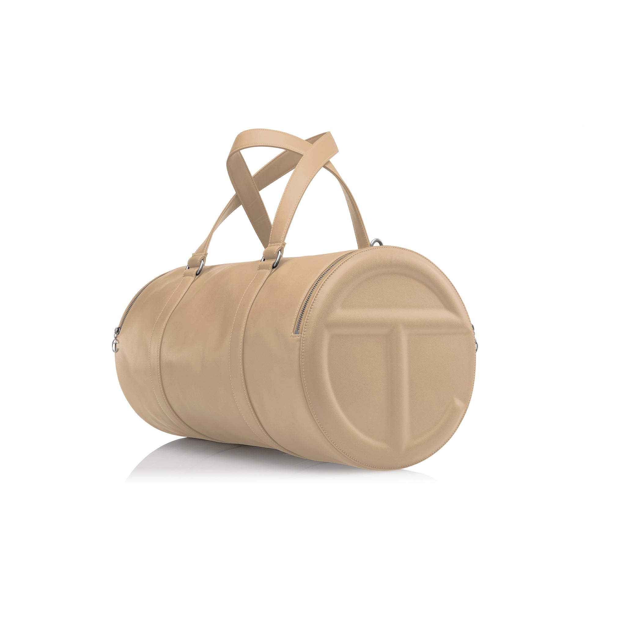 The Large TELFAR Duffle is a universal unisex icon in faux leather — perfect for travel, the gym or whatever you get up to. Featuring twin functional embossed TC logo side pockets, a generous interior with inner pocket, custom antique silver hardware and logo zipper pulls, twin handles and a detachable shoulder strap.