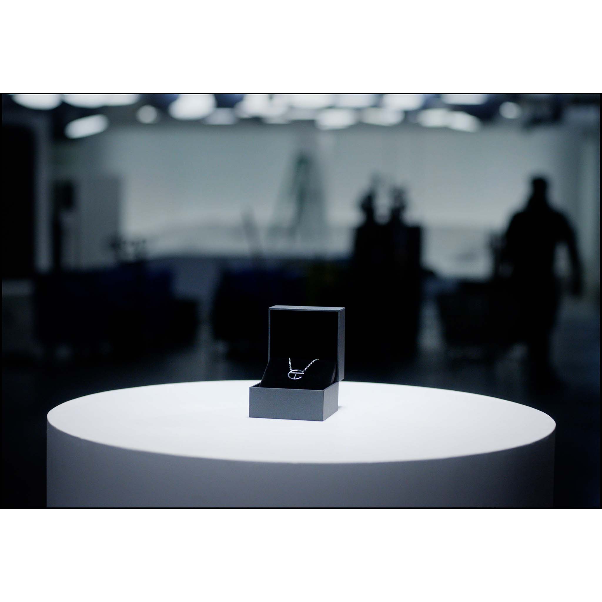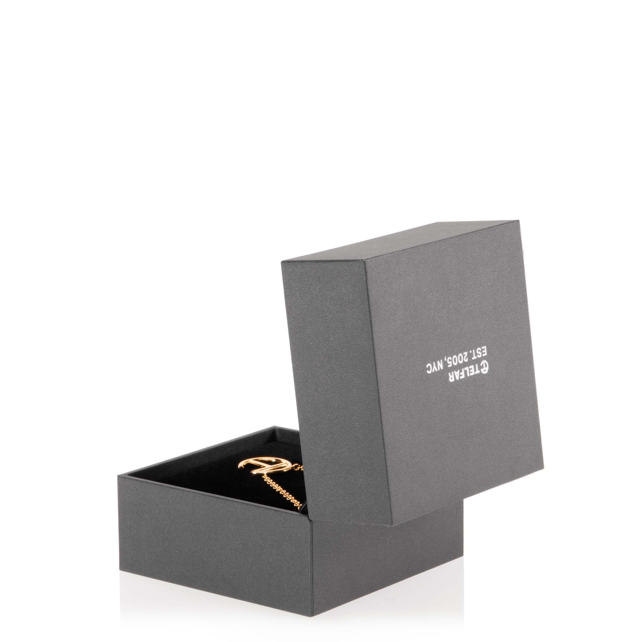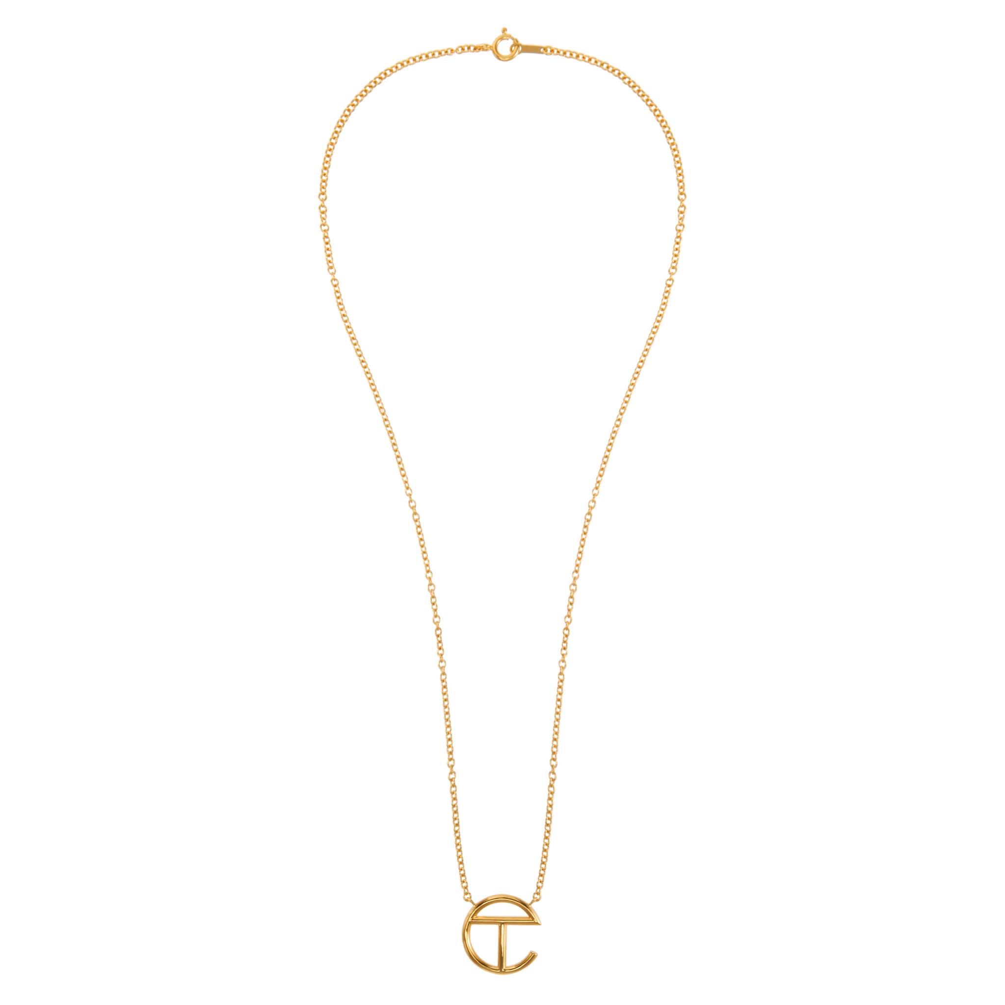 TELFAR logo pendant on chain in gold plate. Unisex. Packaged in custom clamshell box with silver foil insignia.
