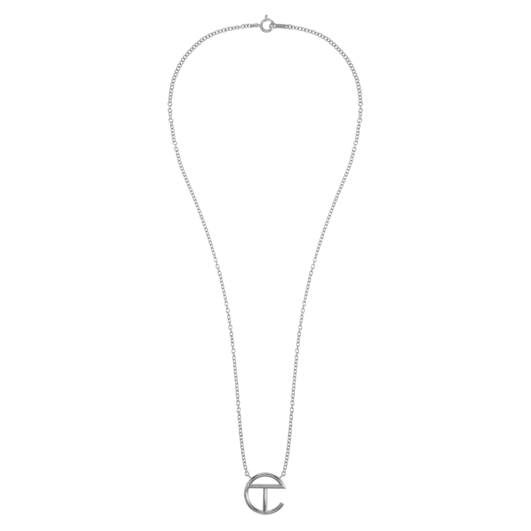 TELFAR logo pendant on chain in silver plate. Unisex. Packaged in custom clamshell box with silver foil insignia.