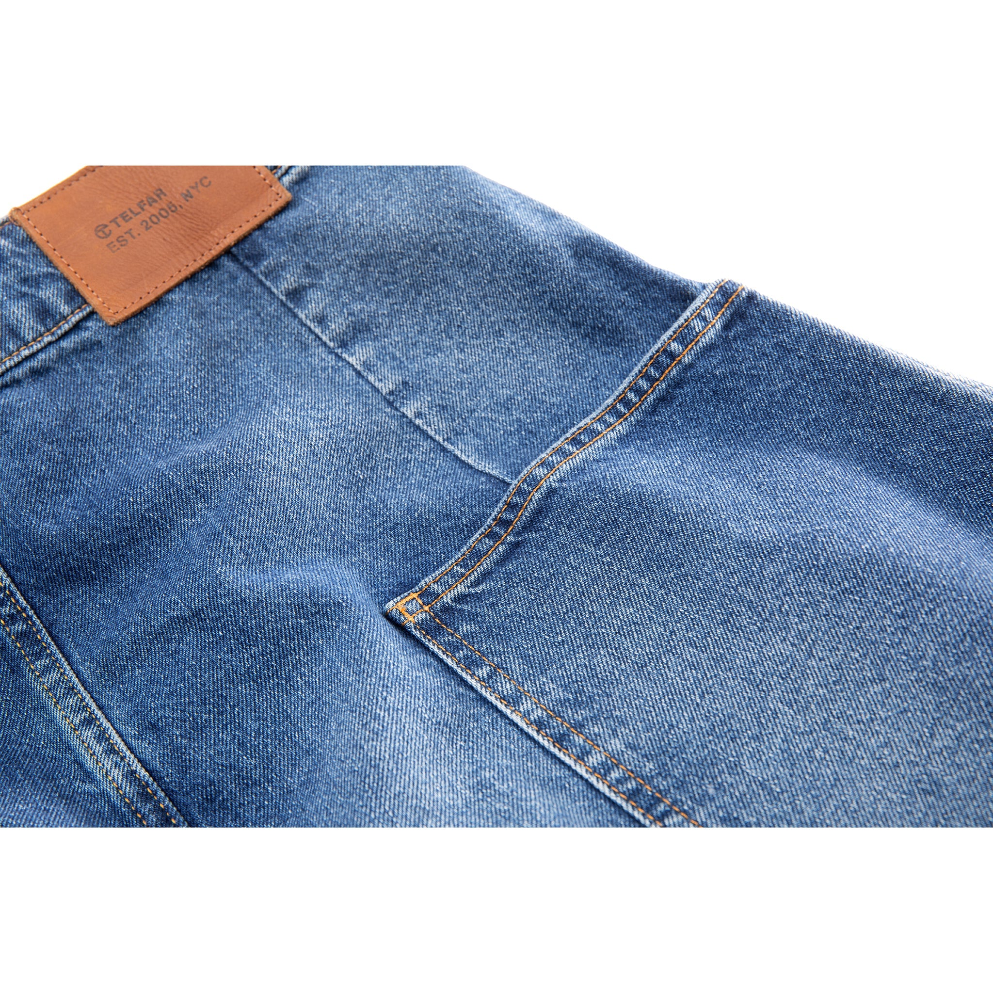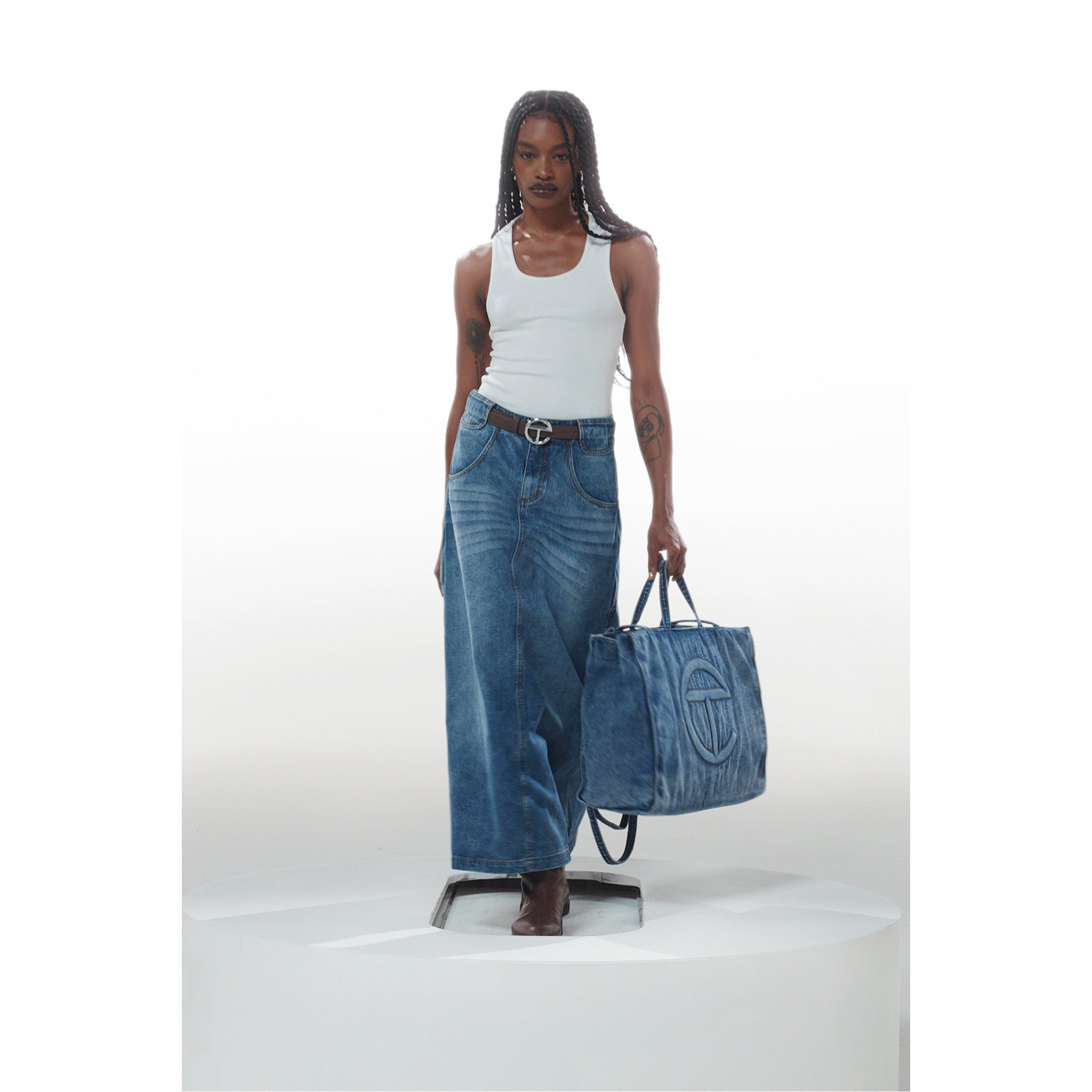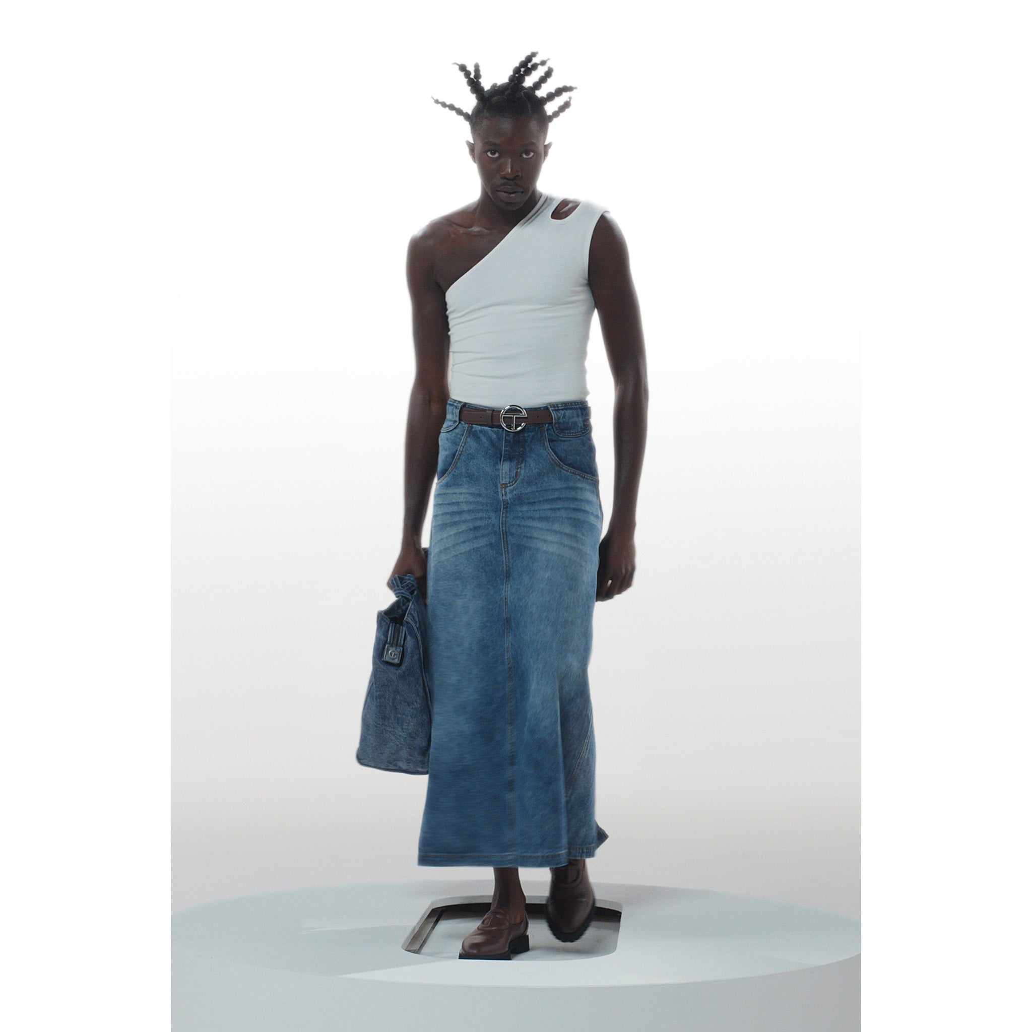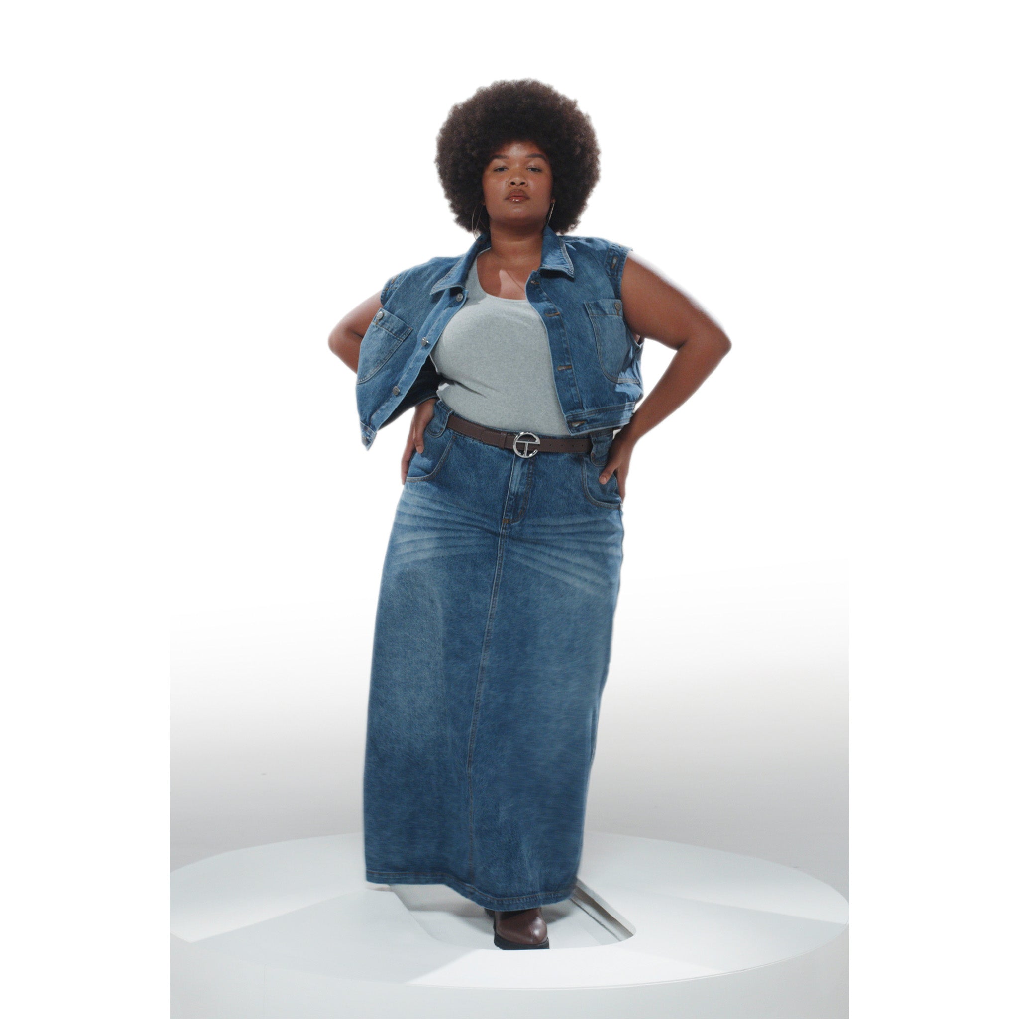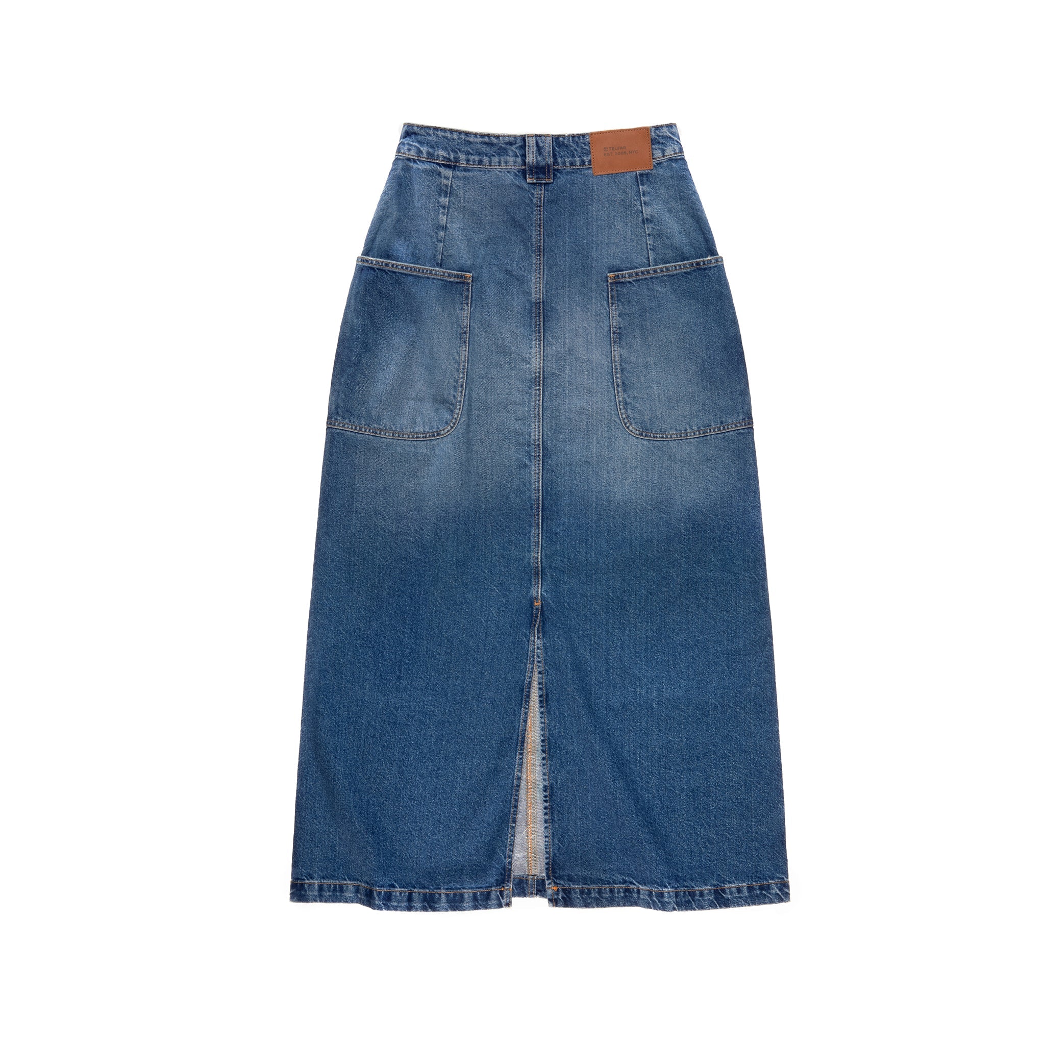 Our Long unisex Jean Skirt featuring deep pockets, hidden belt loop stash compartments, custom hardware and debossed leather patch in back. Available in blue and black washed denim.