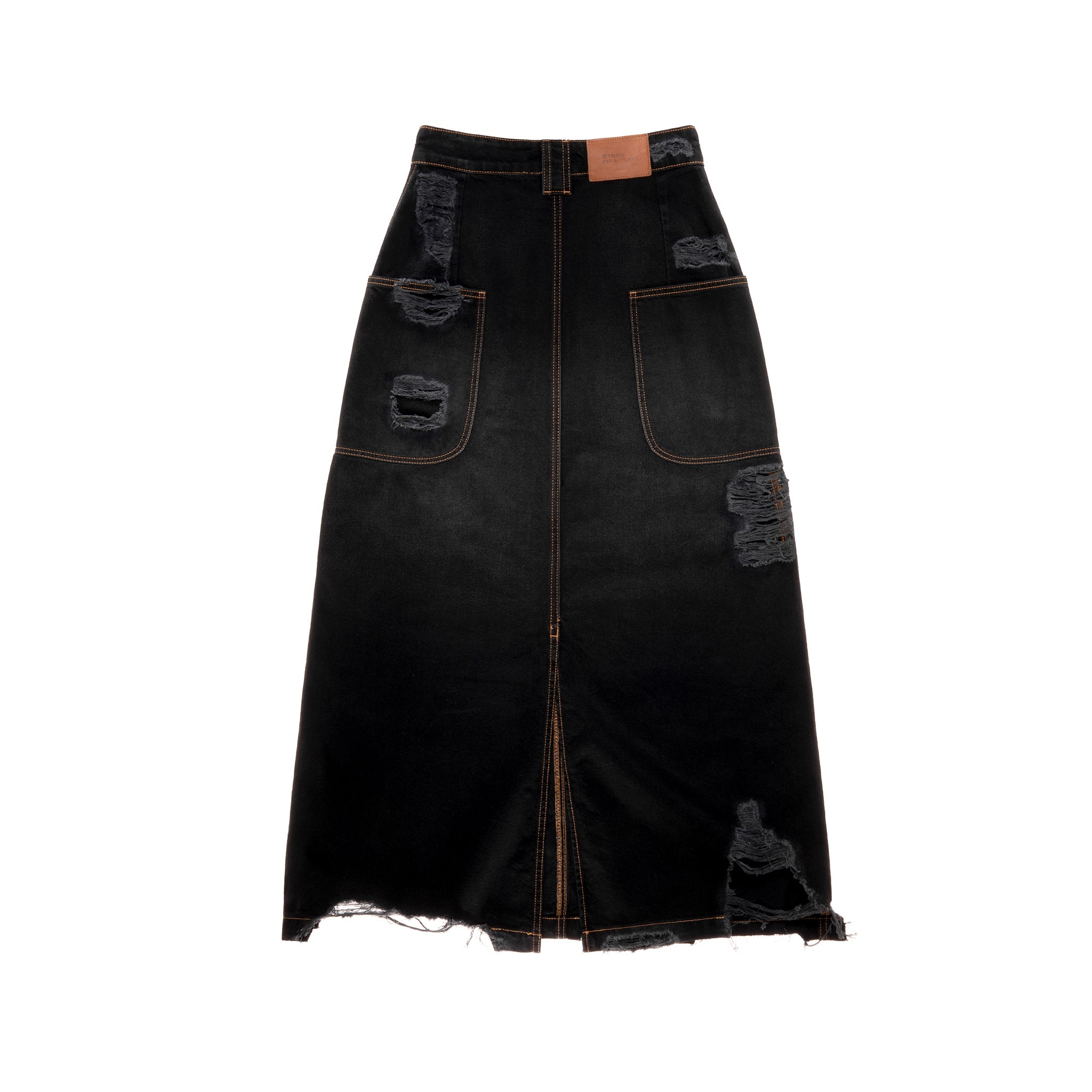 Our Long unisex Jean Skirt featuring deep pockets, hidden belt loop stash compartments, custom hardware and debossed leather patch in back. Available in blue and black washed denim.