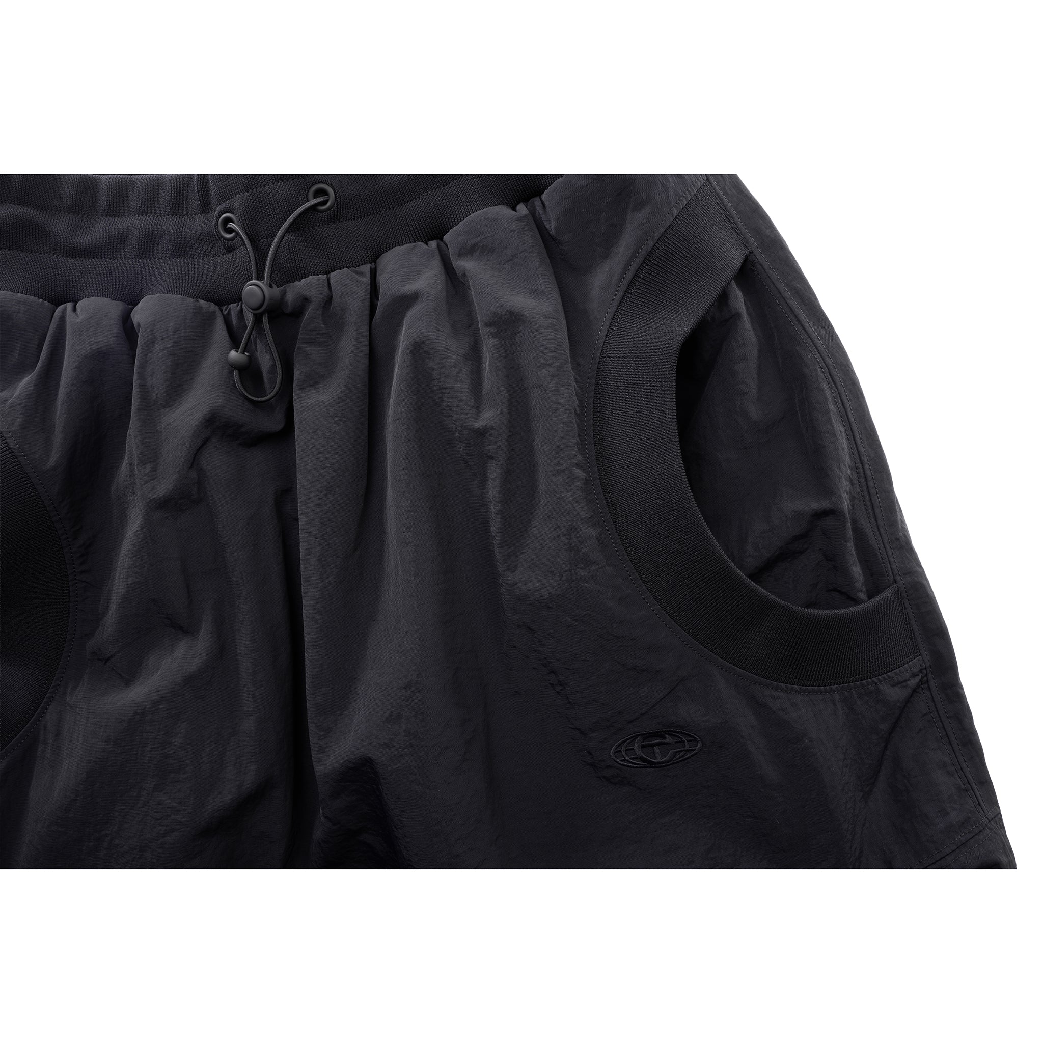 Reversible bomber pants with water-resistant matte exterior, thermal waffle knit interior. Adjustable drawstring closure at the waistband and hemline. Slit pockets at the hips, below the knees, and back panel. Signature Globe logo. Available in Black and Rust.