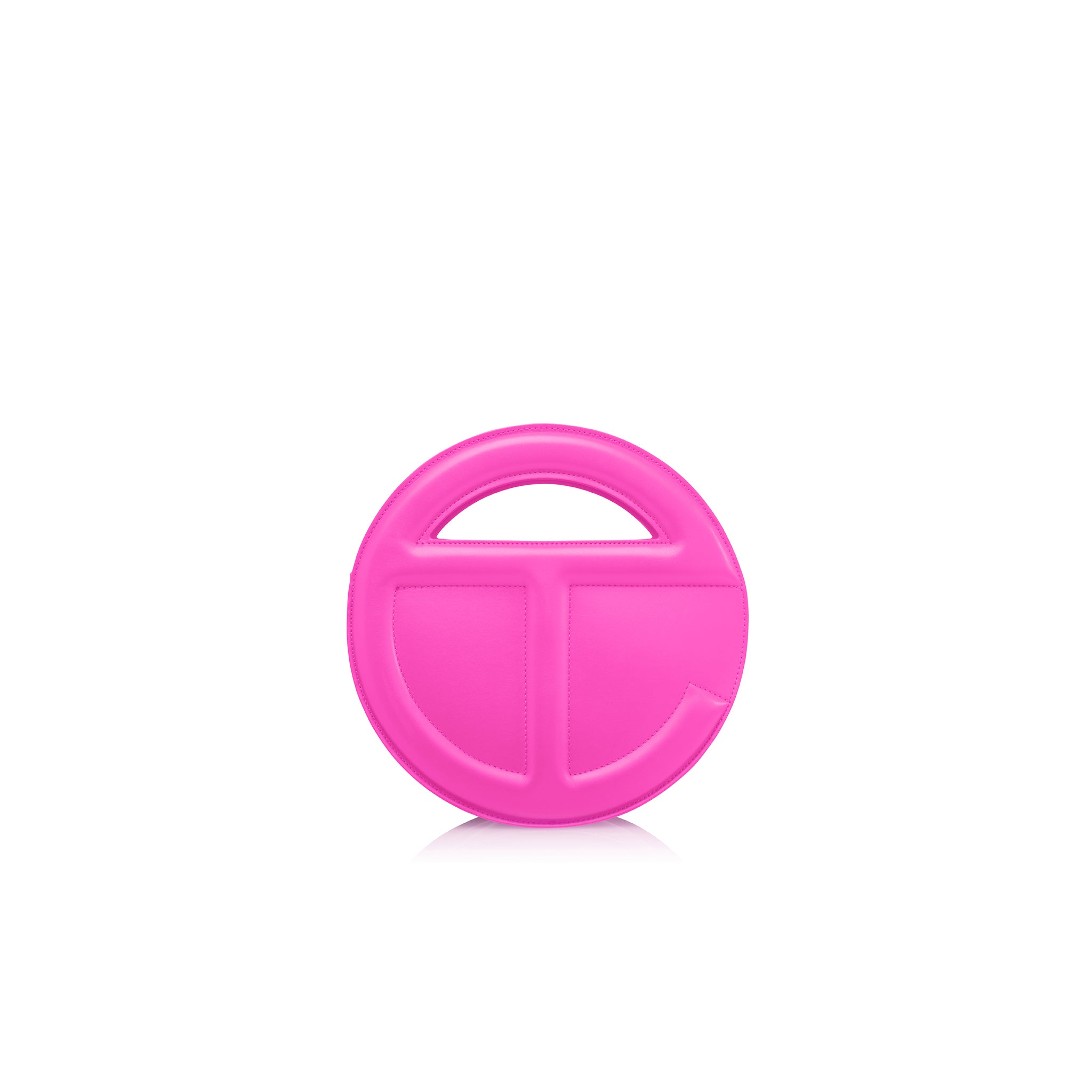 Sculptural and iconic TELFAR unisex Circle Bag with double-sided functional embossed logo handle, zip closure on main body and inner pocket and two hidden compartments for easy access. Detachable and adjustable shoulder strap can be worn over the shoulder or cross-body. Made from faux leather and twill lining. Bag is packaged in a drawstring bag with screen-printed logo and foil-stamped box.