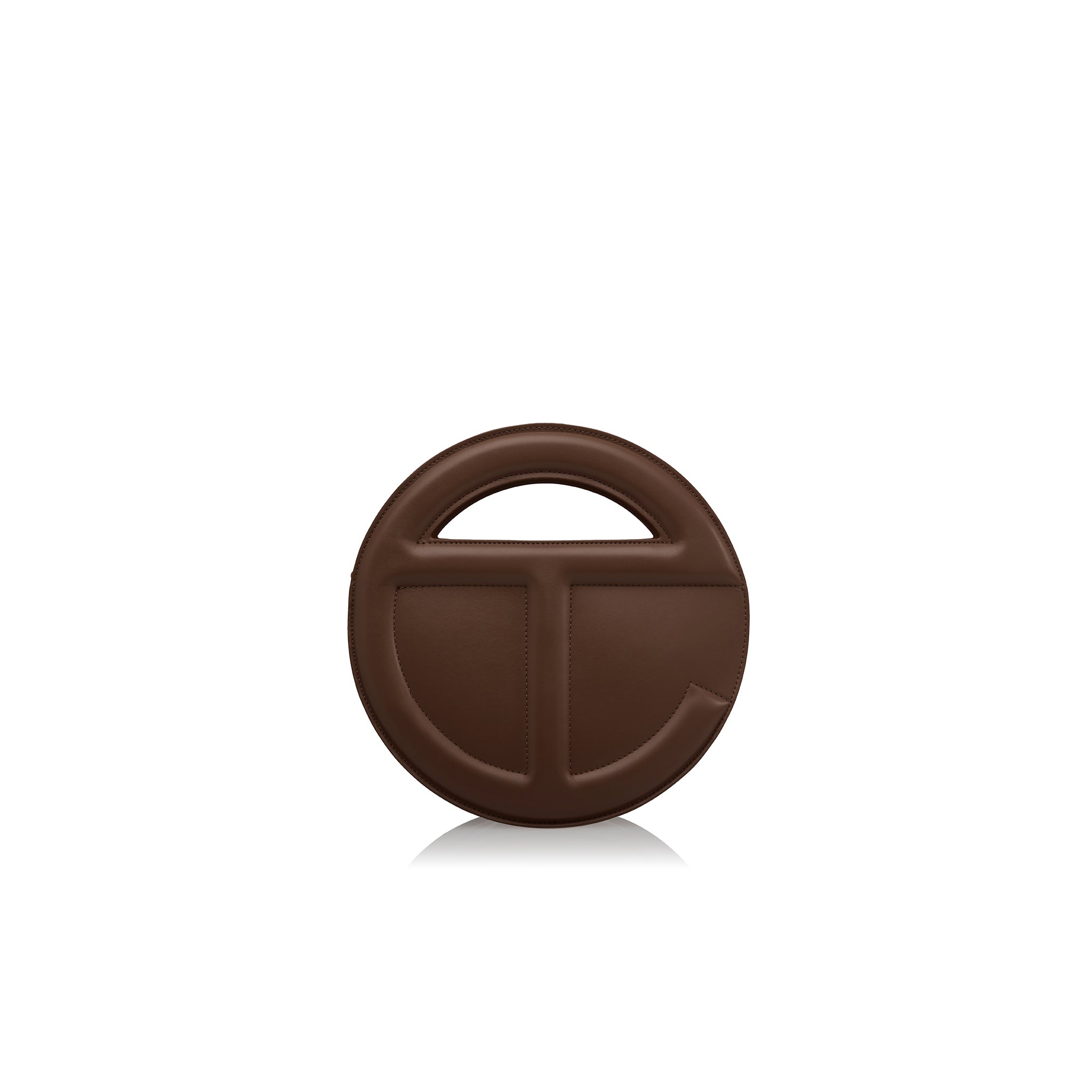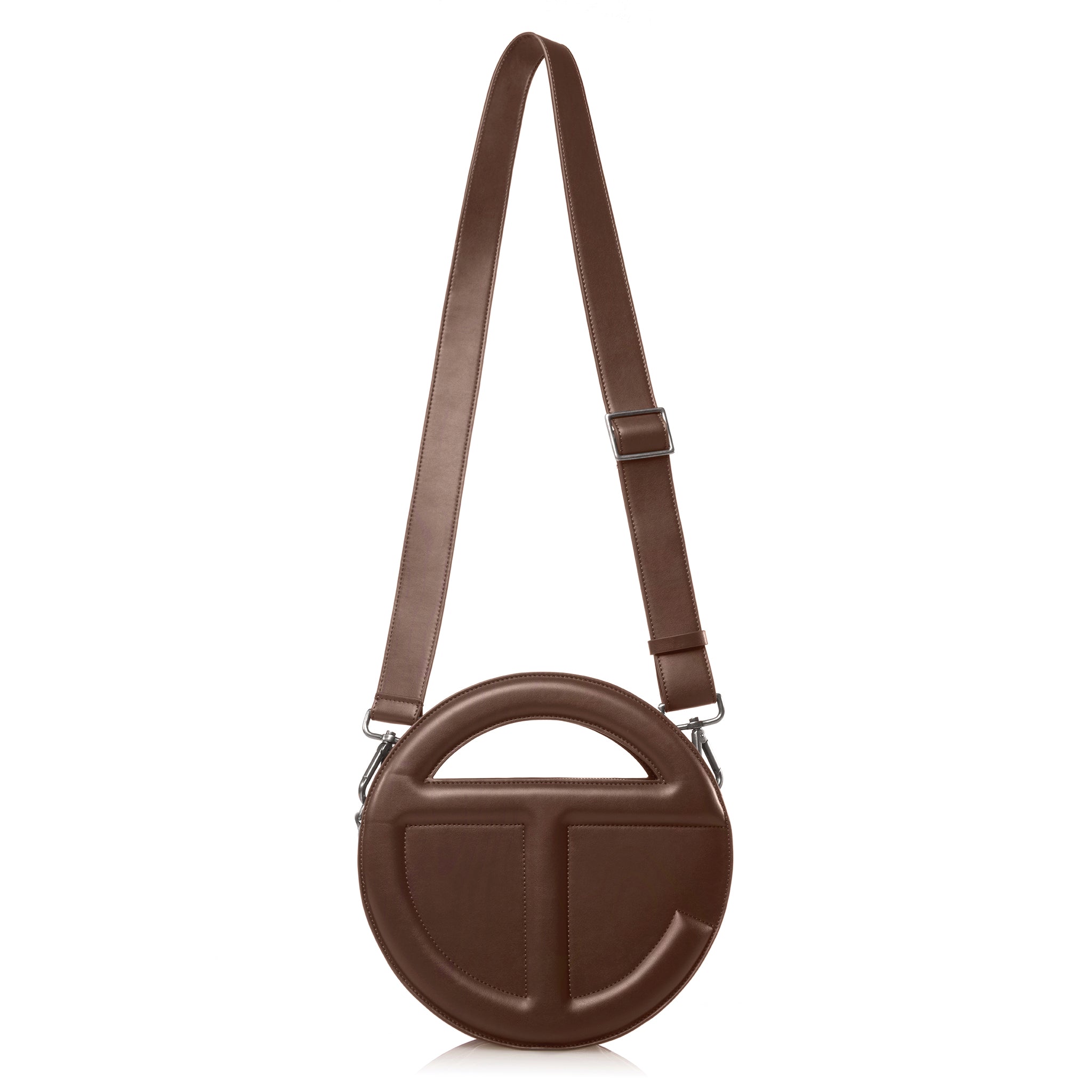Sculptural and iconic TELFAR unisex Circle Bag with double-sided functional embossed logo handle, zip closure on main body and inner pocket and two hidden compartments for easy access. Detachable and adjustable shoulder strap can be worn over the shoulder or cross-body. Made from faux leather and twill lining. Bag is packaged in a drawstring bag with screen-printed logo and foil-stamped box.