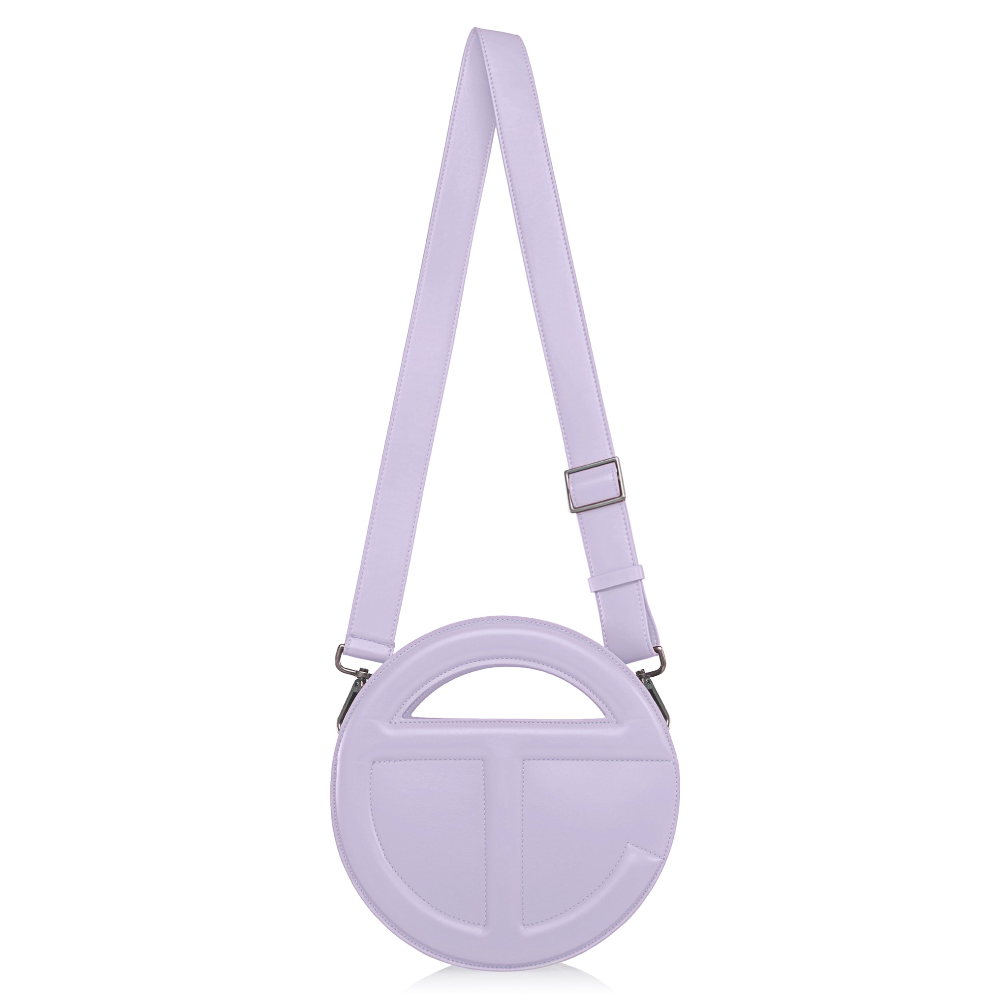 Sculptural and iconic TELFAR unisex Circle Bag with double-sided functional embossed logo handle, zip closure on main body and inner pocket and two hidden compartments for easy access. Detachable and adjustable shoulder strap can be worn over the shoulder or cross-body. Made from faux leather and twill lining. Bag is packaged in a drawstring bag with screen-printed logo and foil-stamped box.