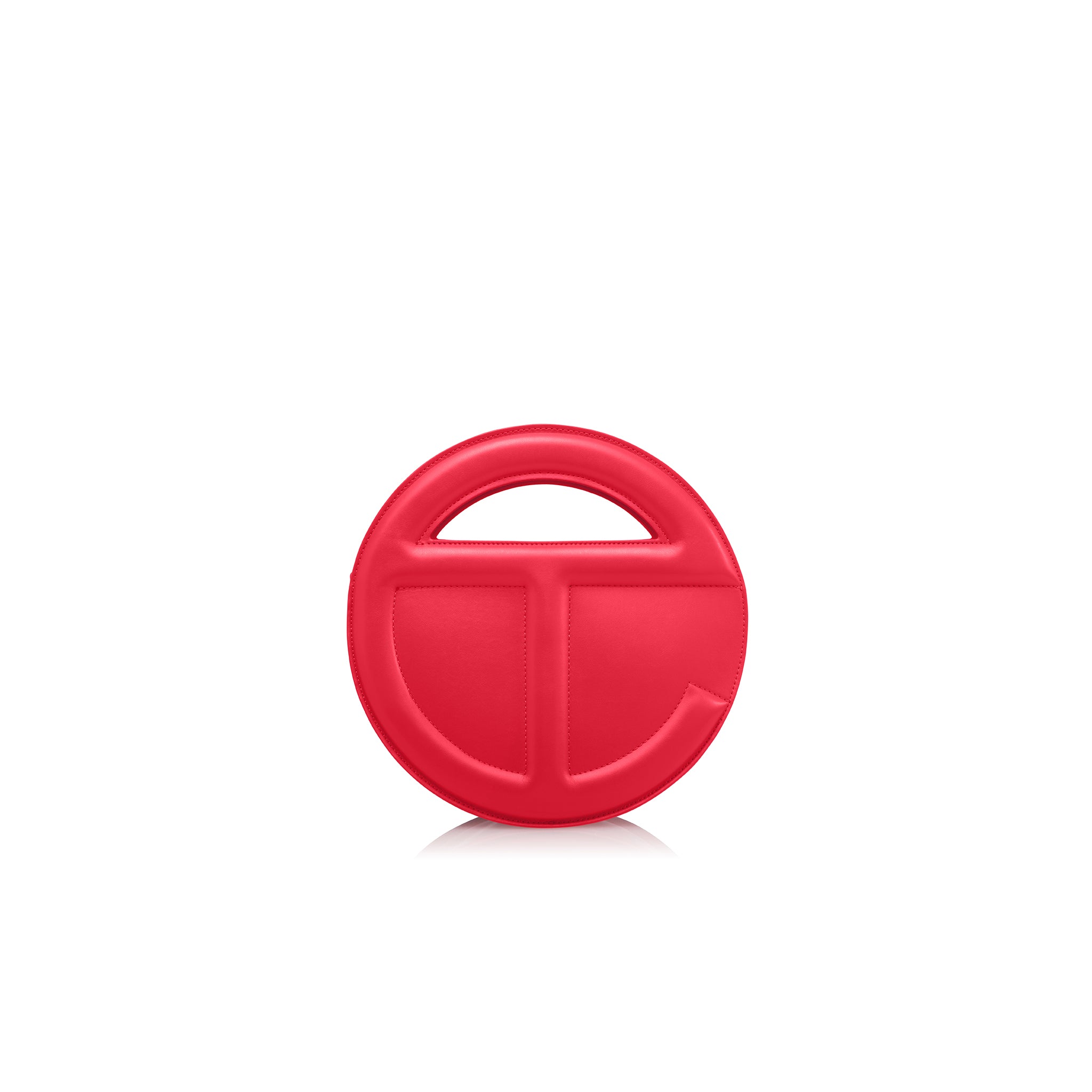 Sculptural and iconic TELFAR unisex Circle Bag with double-sided functional embossed logo handle, zip closure on main body and inner pocket and two hidden compartments for easy access. Detachable and adjustable shoulder strap can be worn over the shoulder or cross-body. Made from faux leather and twill lining. Bag is packaged in a drawstring bag with screen-printed logo and foil-stamped box.