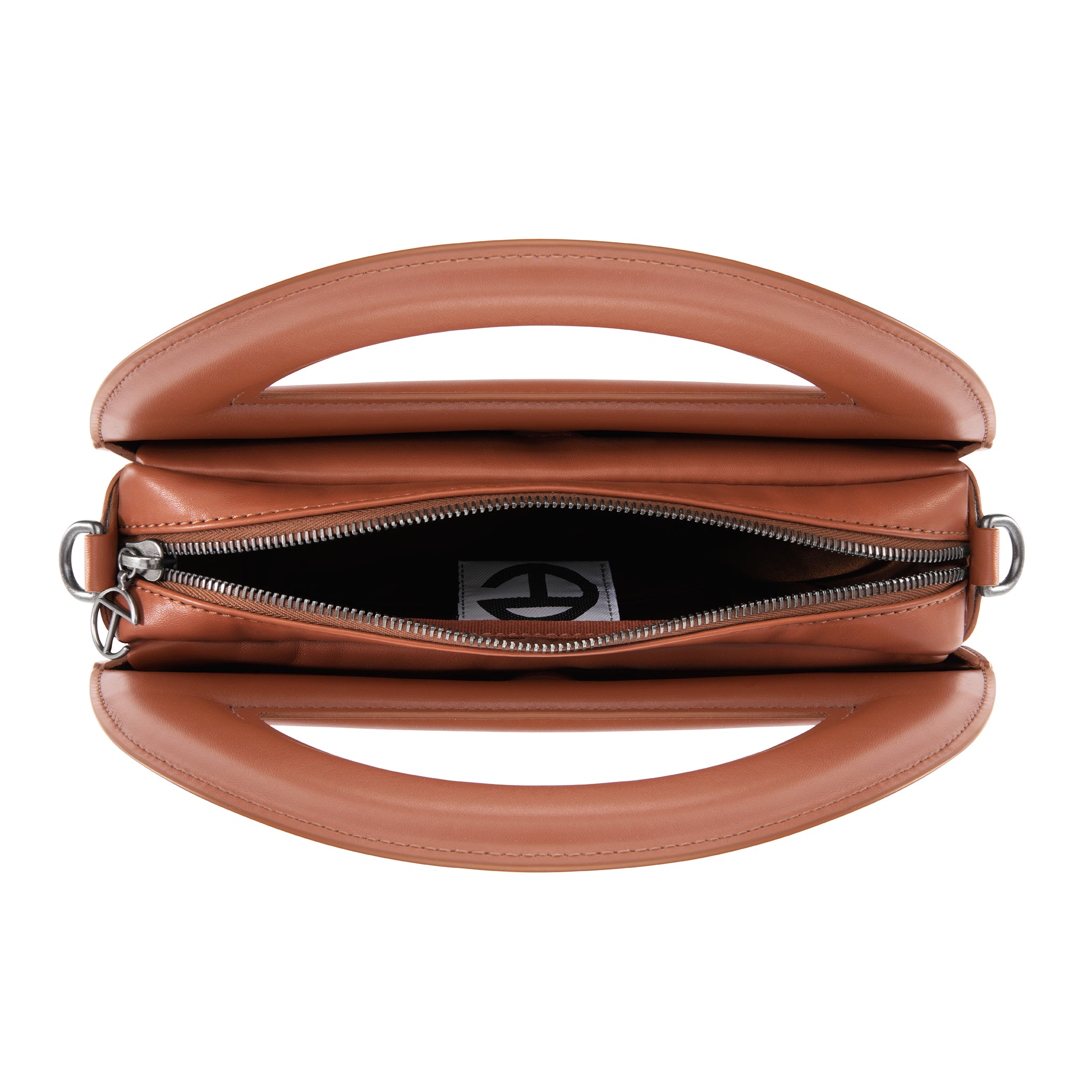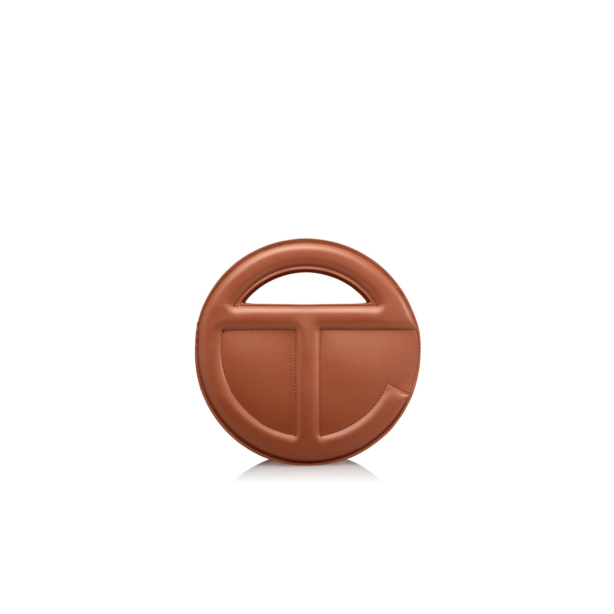 Sculptural and iconic TELFAR unisex Circle Bag with double-sided functional embossed logo handle, zip closure on main body and inner pocket and two hidden compartments for easy access. Detachable and adjustable shoulder strap can be worn over the shoulder or cross-body. Made from faux leather and twill lining. Bag is packaged in a drawstring bag with screen-printed logo and foil-stamped box.