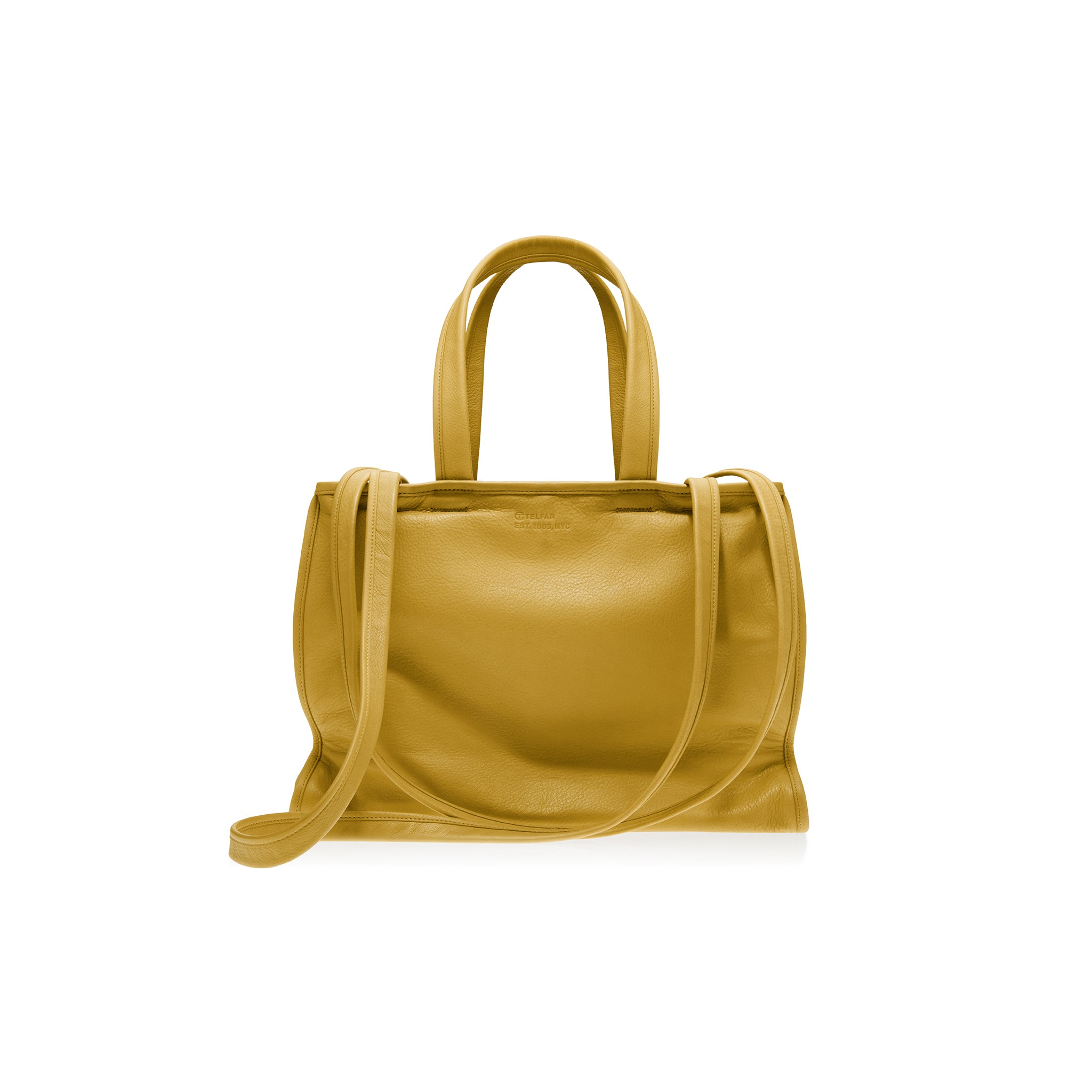 TELFAR’s answer to traditional luxury. Hewn in soft, aniline, full-grain pebble leather — left unlined (since it has nothing to hide), The Carry starts with our iconic tote and deepens in the gusset — to gather with leather-covered snaps and then drape with an unstructured swagger that you can feel on your eyes. With supple folds that contour to your body and hand straps lengthened luxuriously — so you can now carry The Carry — on your shoulder. Now featuring a zipper pocket and slip interior pockets. Hardware has been intentionally kept to a minimum; studded feet, and an interior key ring.
