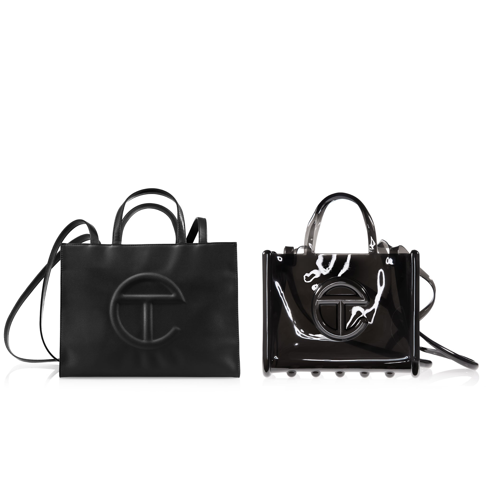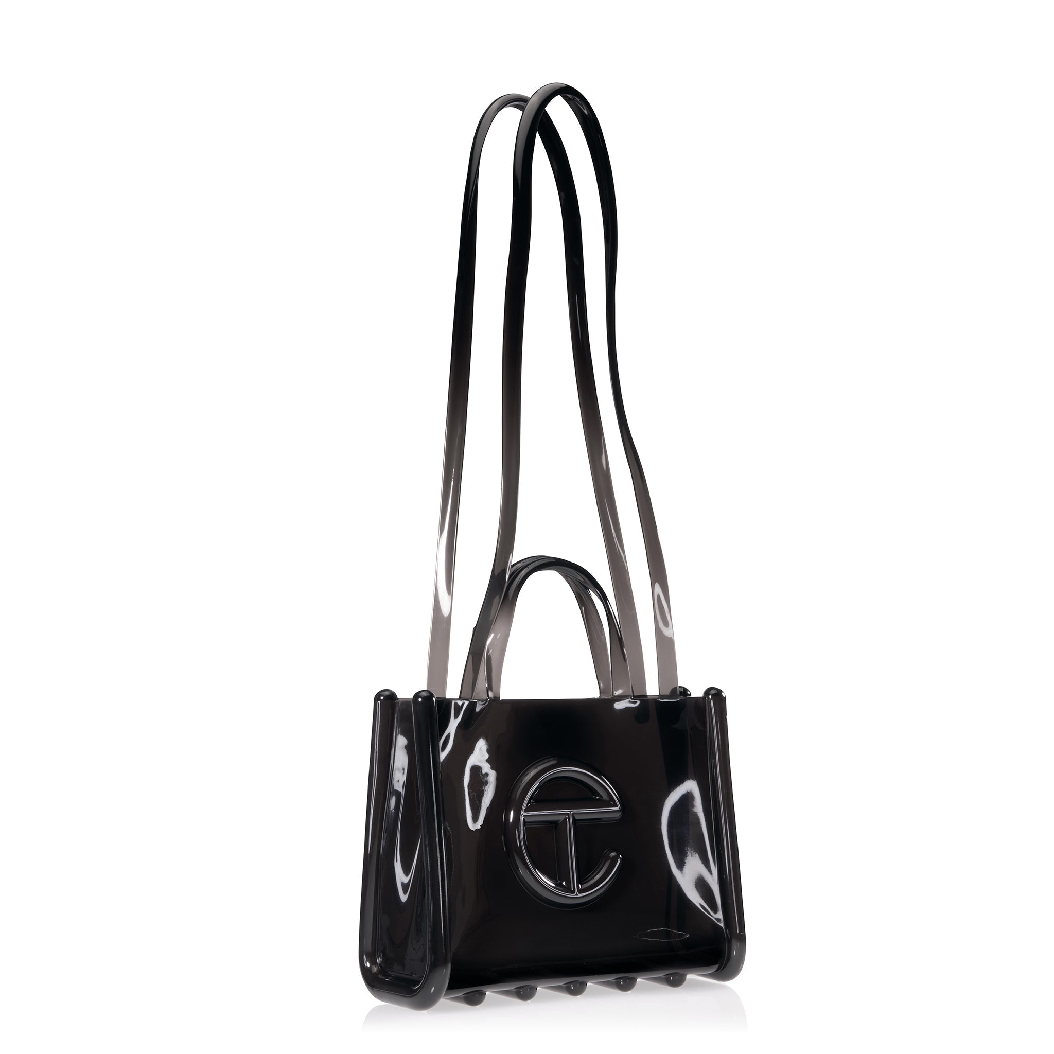 The medium Melissa x Telfar Jelly Shopper — featuring fluid design and tubular construction. This translucent shopper is completely water-resistant, making it an instant summer staple. Molded using Melissa’s exclusive Melflex materials, it looks extra bomb with the matching slides.