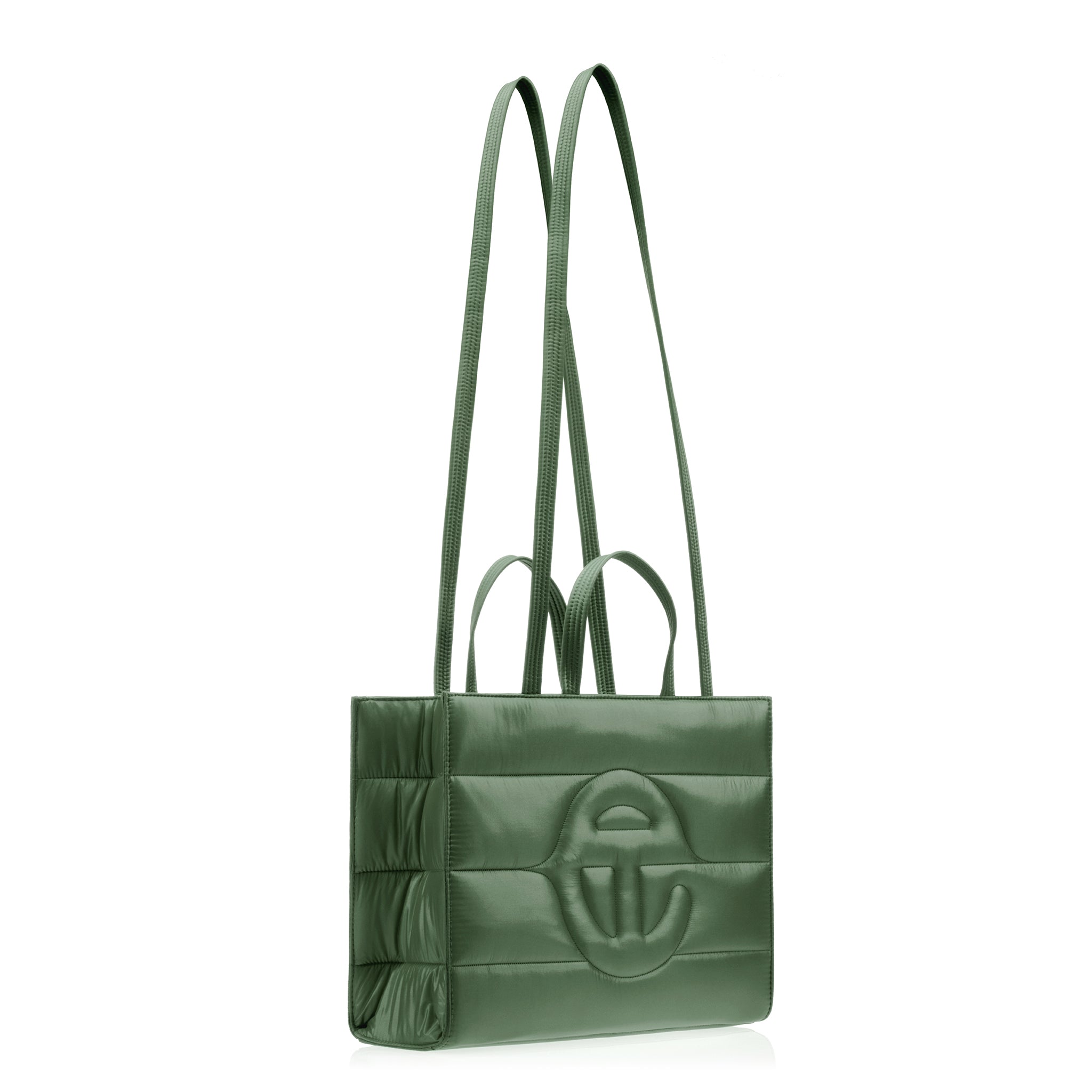 Our iconic Unisex TELFAR Bag, engineered in quilted nylon puff. Featuring a double strap to be held in hand, over the shoulder or cross-body, with a magnetic snap closure and interior zip pocket.