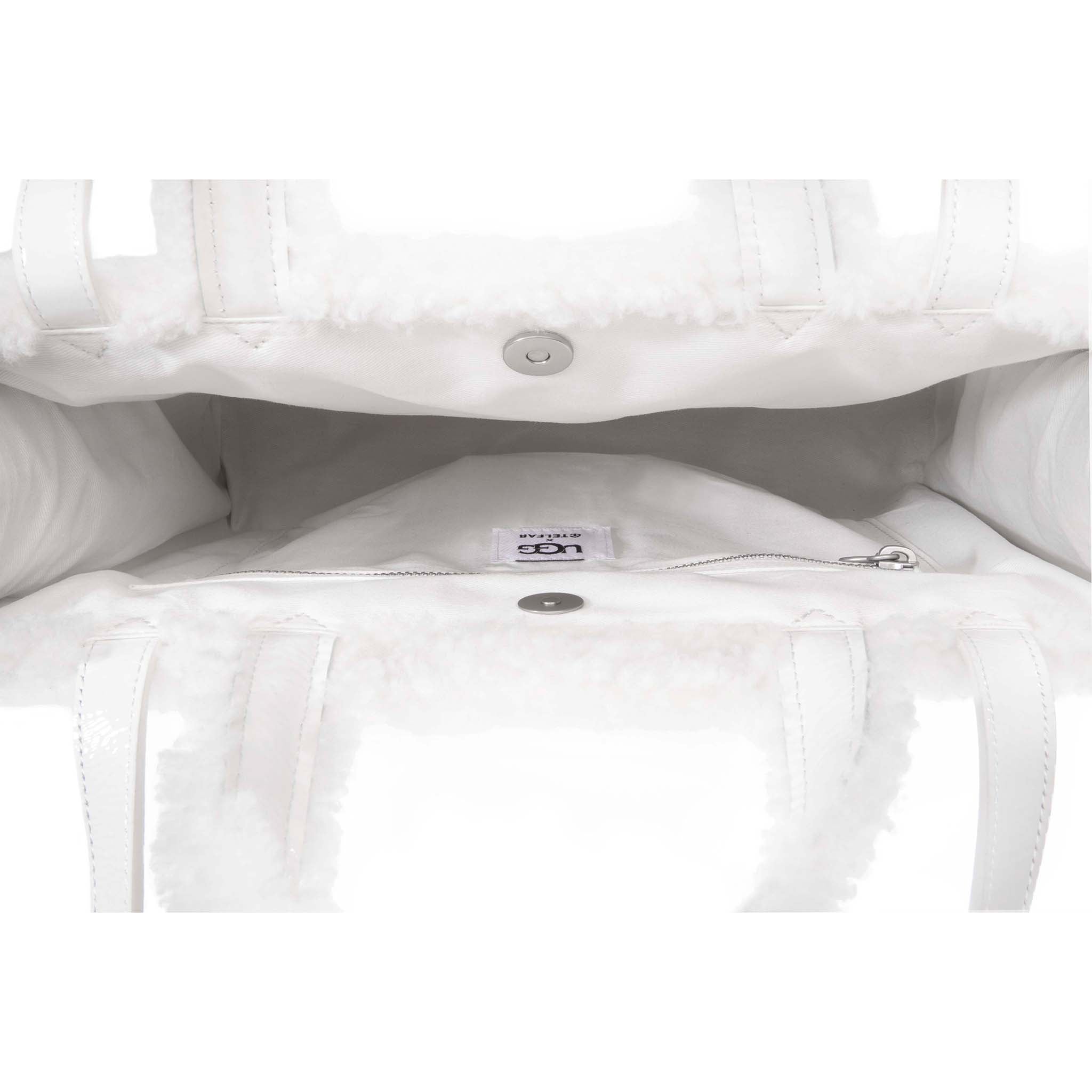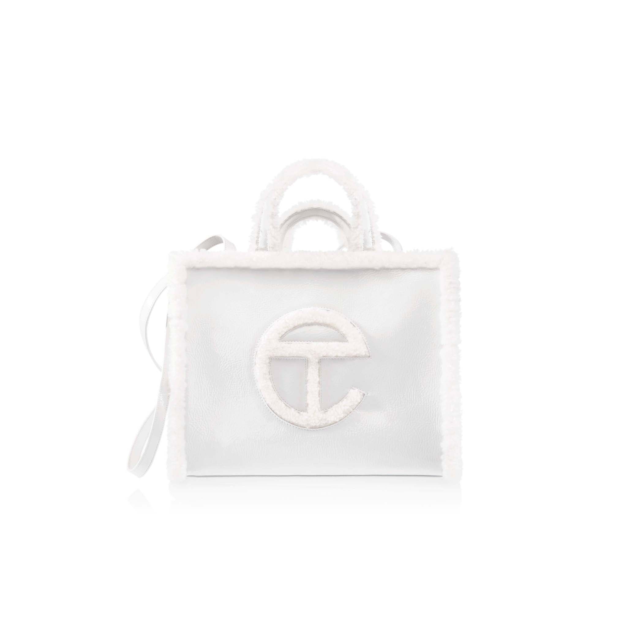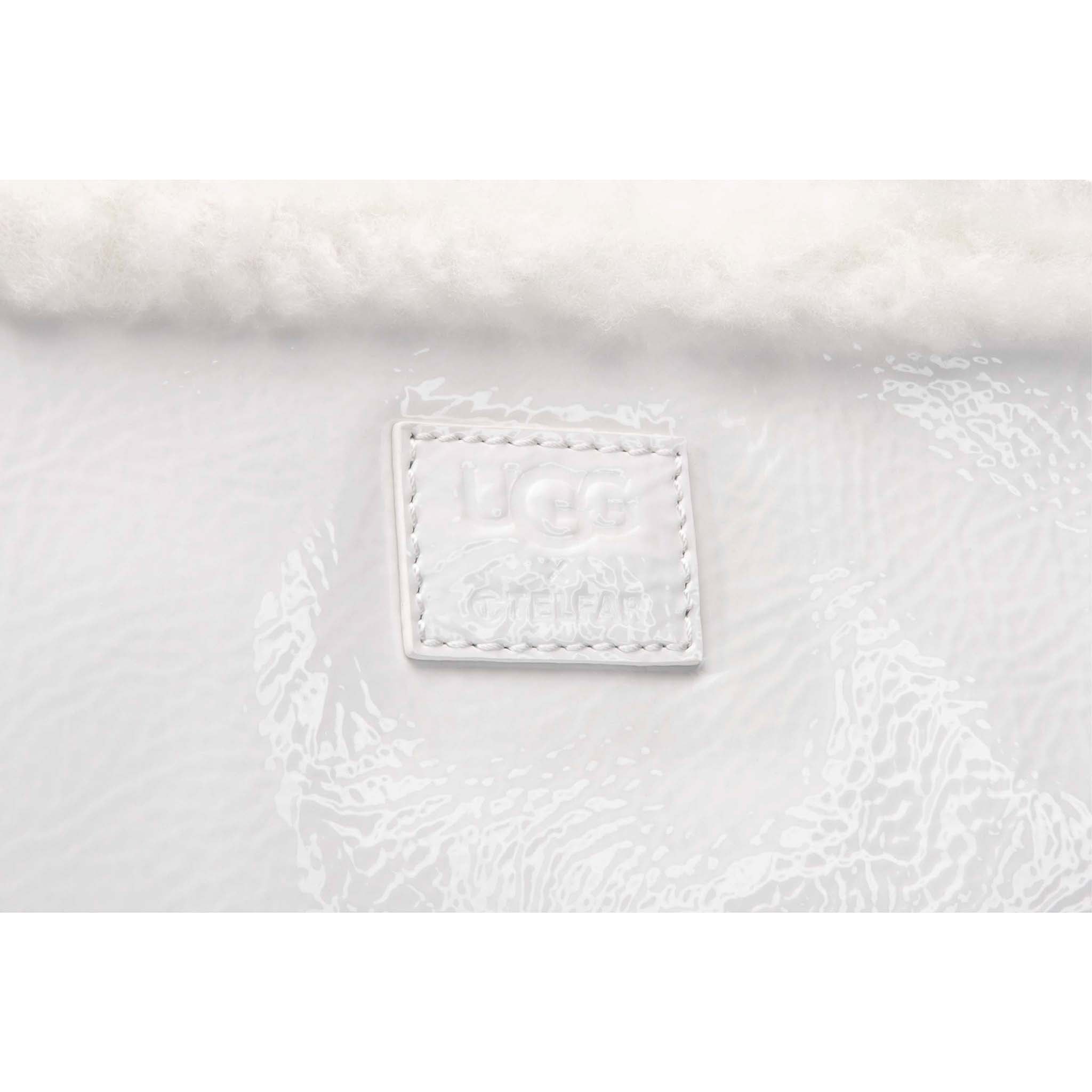Our iconic UGG x TELFAR shopper in crinkle patent leather with a cuddly genuine shearling trim. Bag features double strap to be worn cross-body, inner zip compartment and magnetic snap closure.