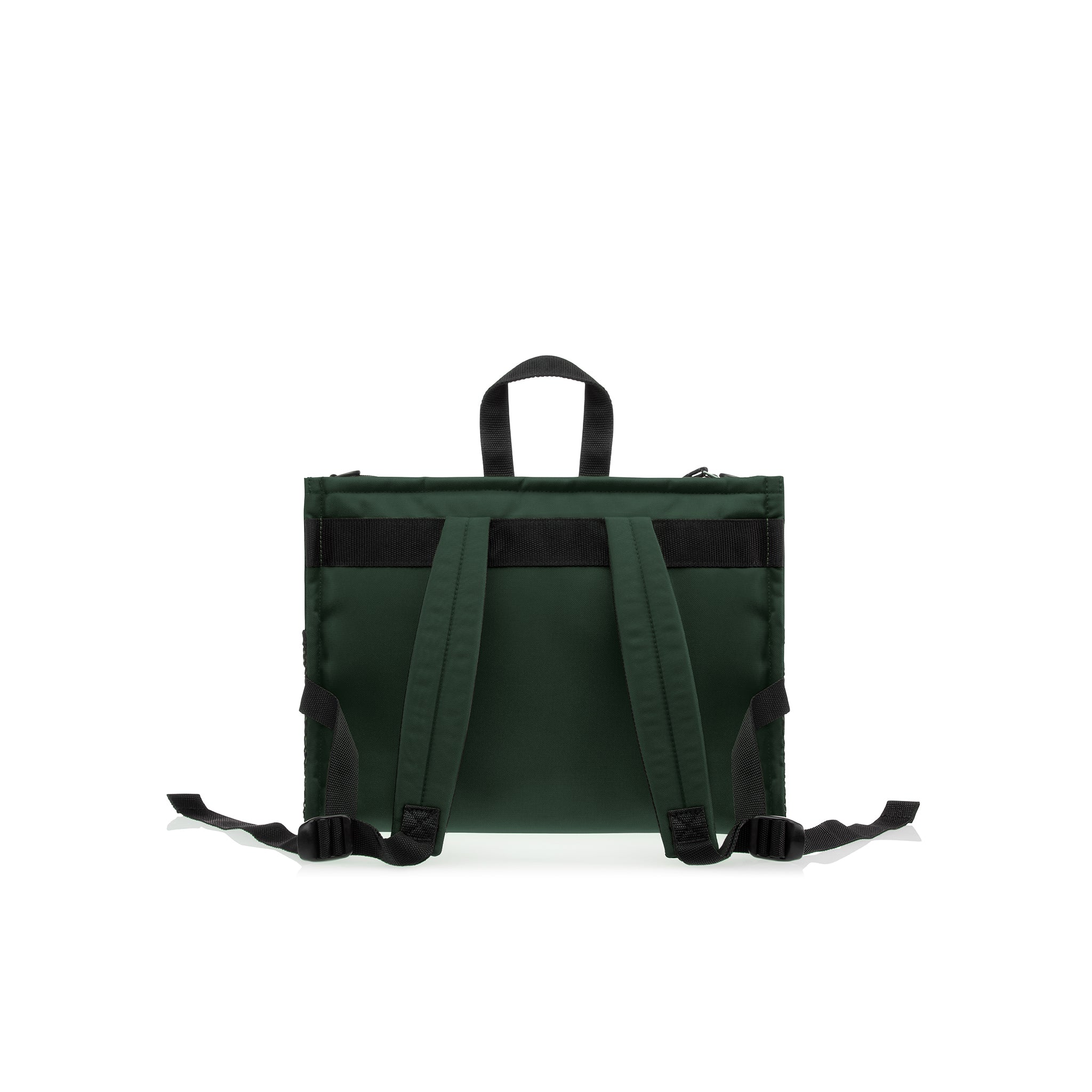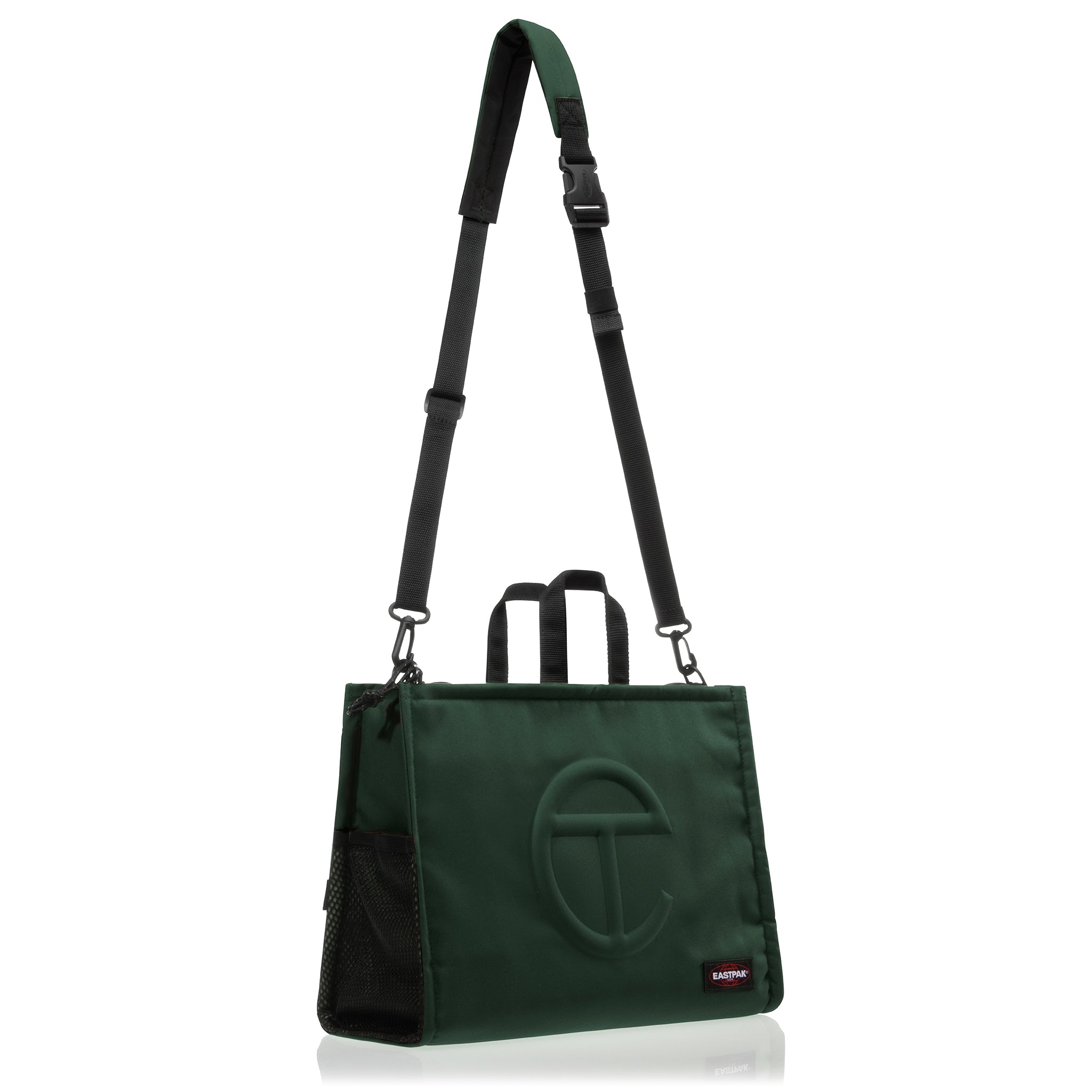 The iconic Medium Shopper in tactical canvas with woven hand straps, removable/adjustable padded shoulder strap and adjustable backpack straps on the reverse side. Exterior features embossed Telfar logo, top zipper closure, and side mesh pockets. Interior features zipper pocket and padded laptop compartment.