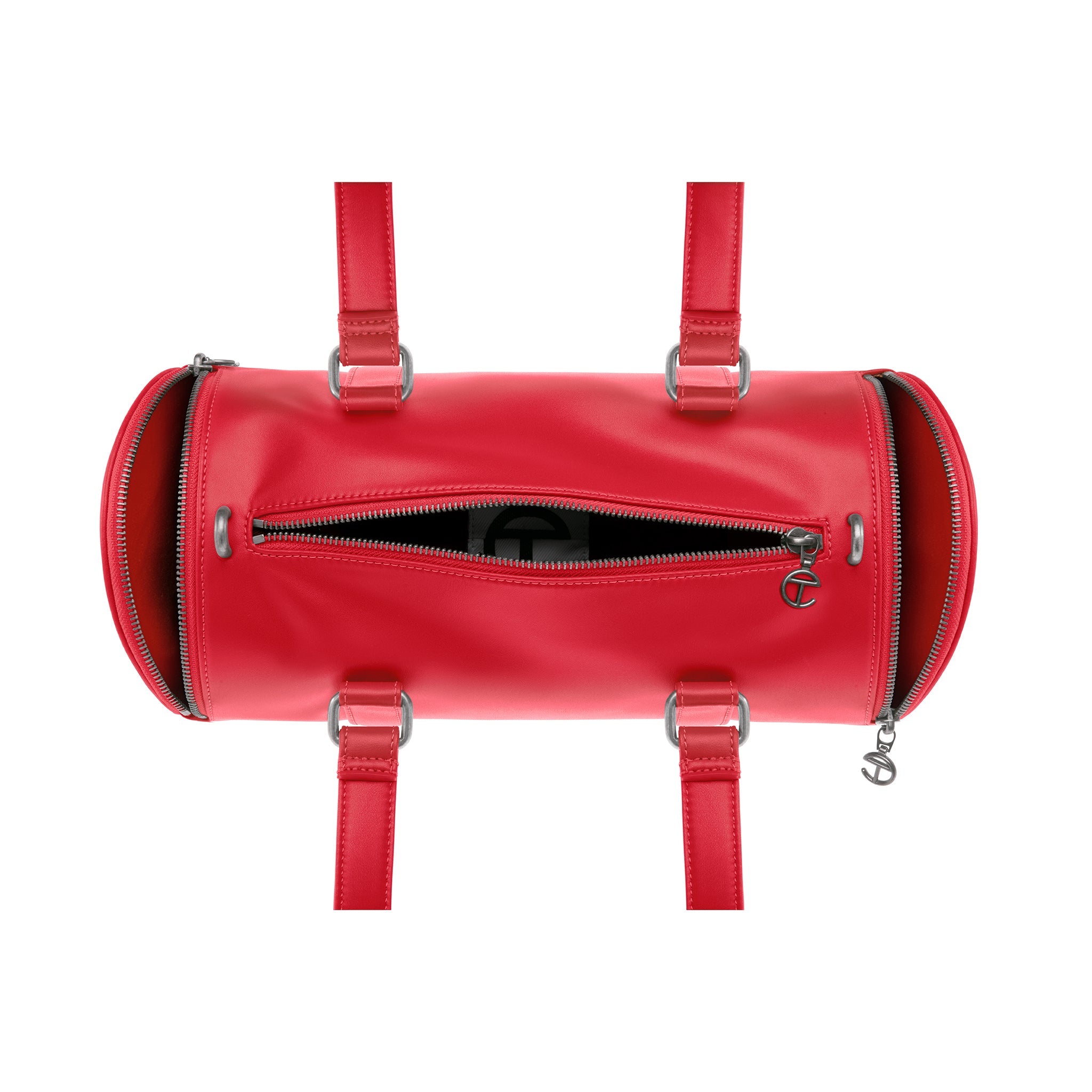 The Medium TELFAR Duffle is a universal unisex icon in faux leather, in an all-day-everyday-everybody size. Featuring twin functional embossed TC logo side pockets, a generous interior with inner pocket, custom antique silver hardware and logo zipper pulls, twin handles and a detachable shoulder strap.
