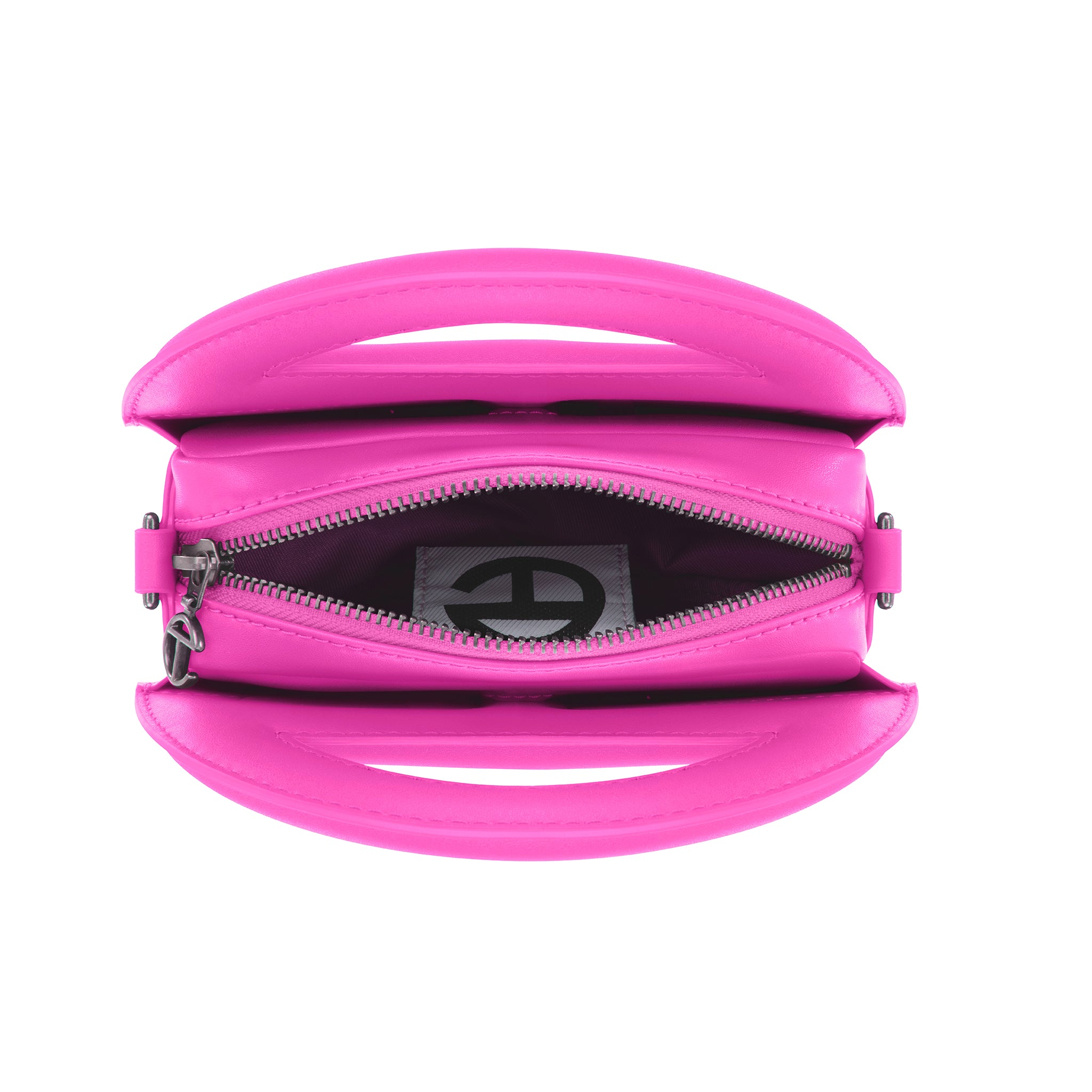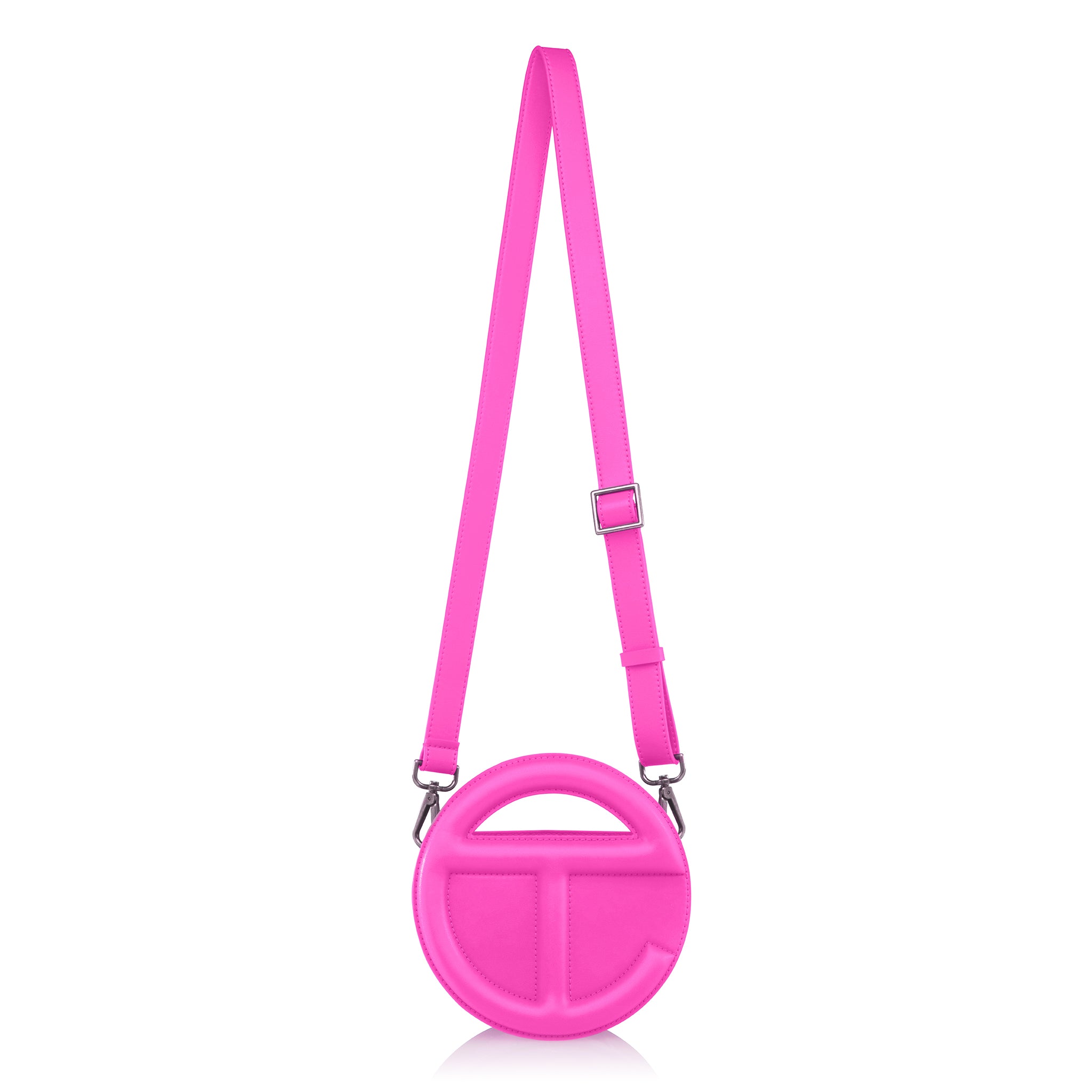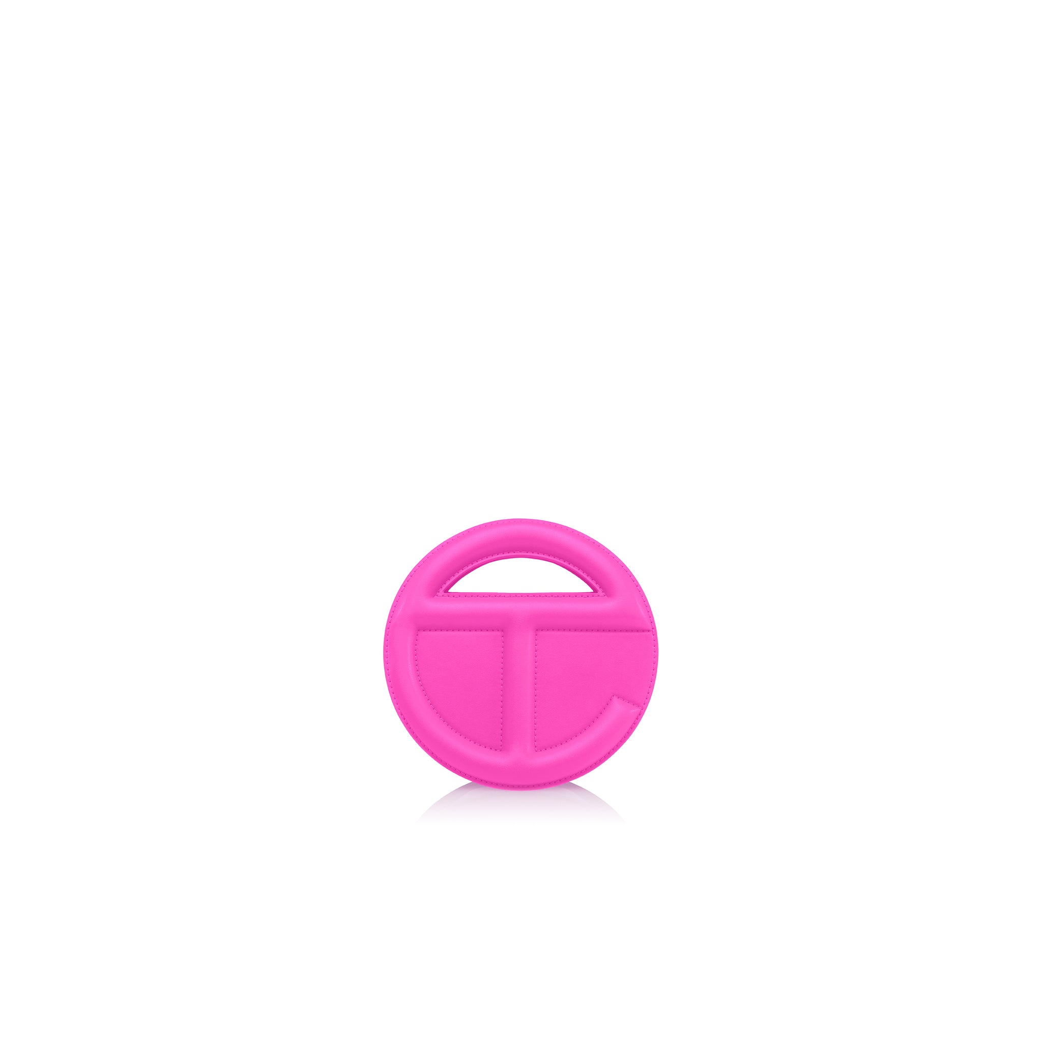 The sculptural and iconic TELFAR unisex MINOR Circle Bag with double-sided functional embossed logo handle, zip closure to main body, and two hidden compartments for easy access. Detachable and adjustable shoulder strap can be worn over the shoulder or cross-body. Made from faux leather and twill lining. Bag is packaged in a drawstring bag with screen-printed logo and foil-stamped box.