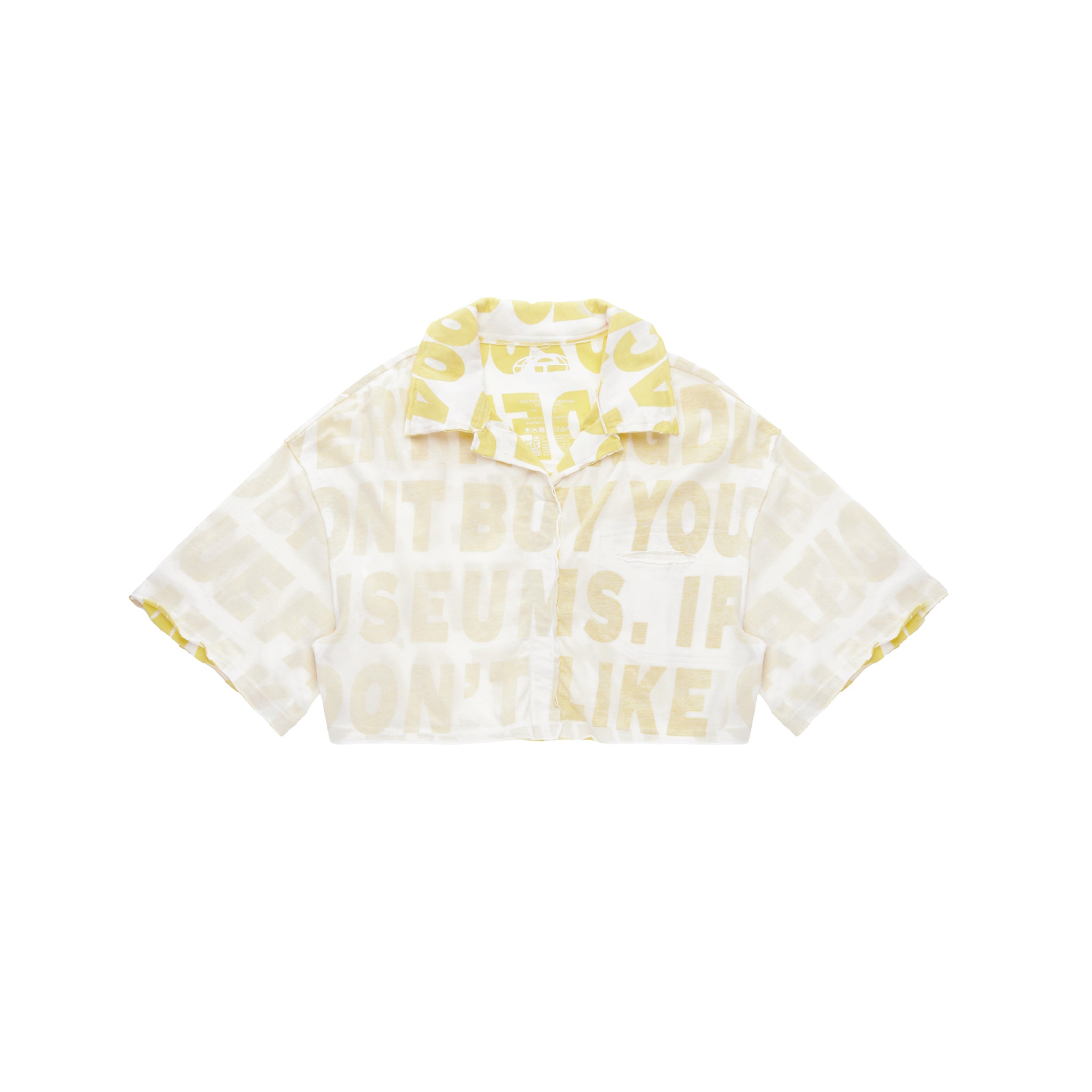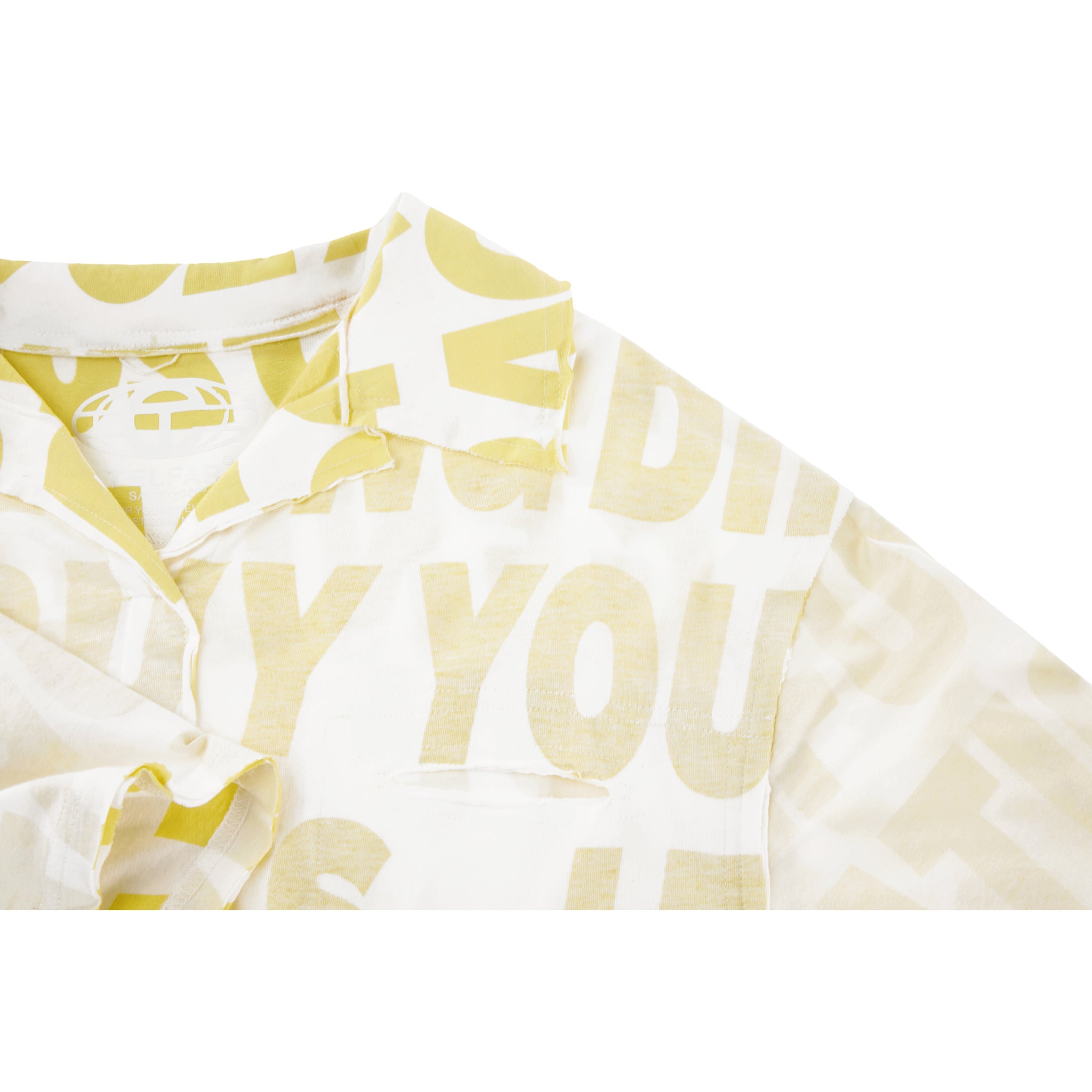 The Crop Split T Dress Shirt – featuring our signature Mission print on 100% ultra-soft jersey cotton. Constructed with a classic collar, short sleeves, chest pocket and forming a relaxed fit with hidden button closures, exposed seams and raw edges.