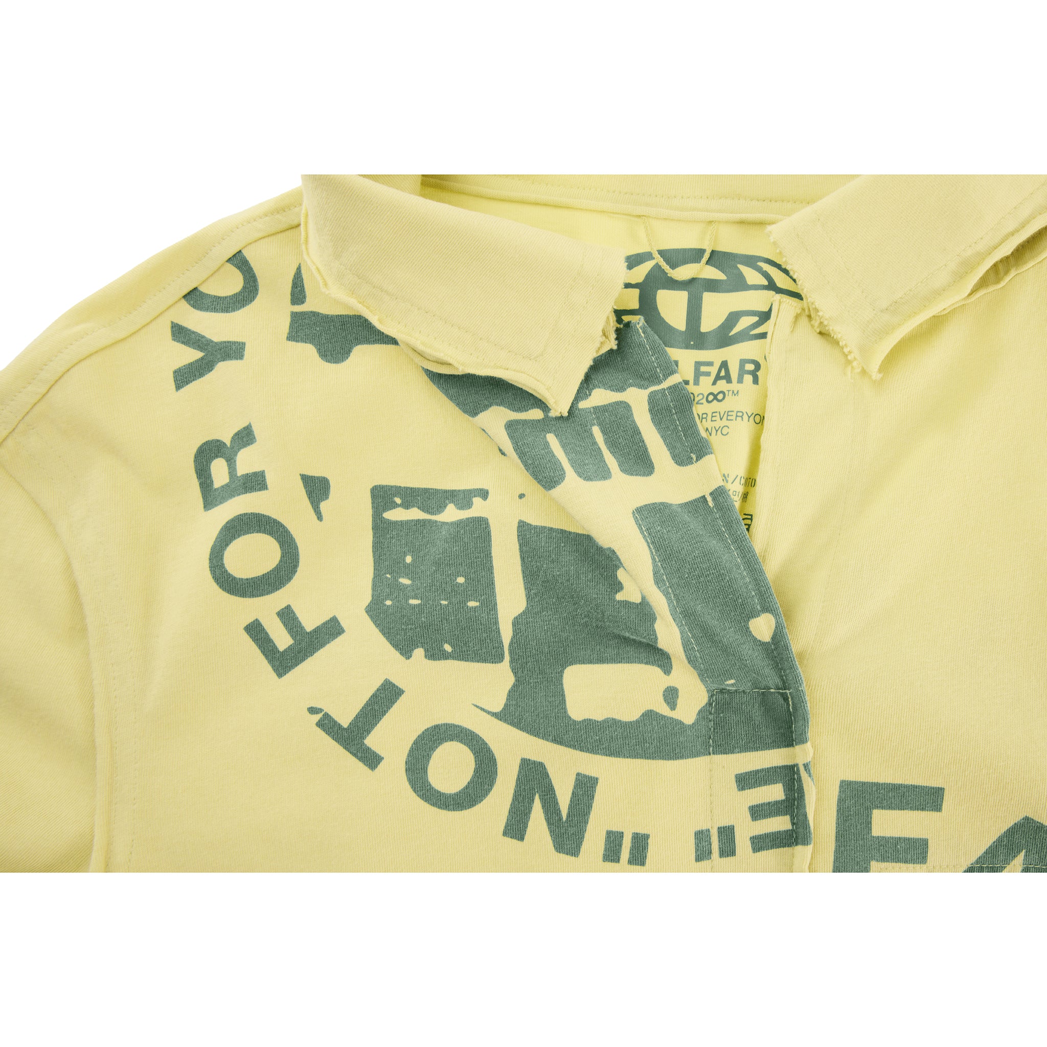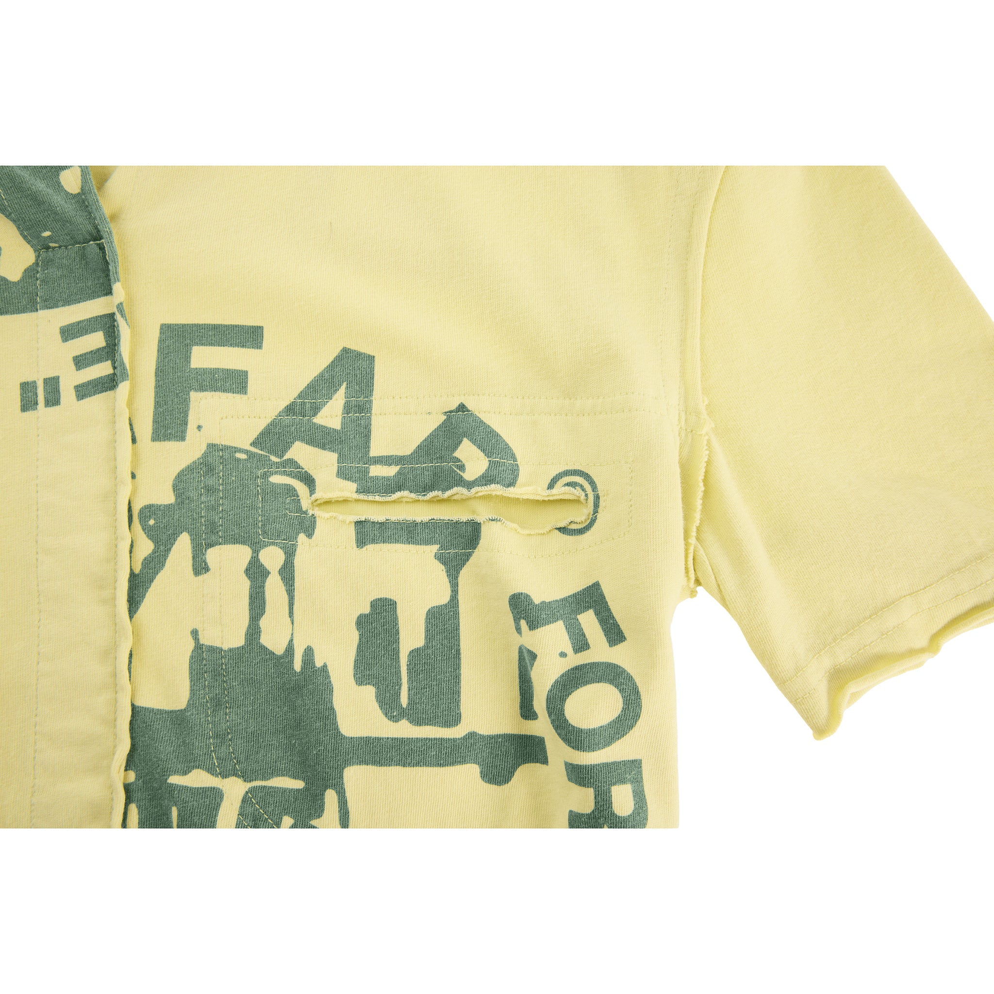 The Split T Dress Shirt – featuring our signature OMG print on 100% ultra-soft jersey cotton. Constructed with a classic collar, short sleeves, chest pocket and forming a relaxed fit with hidden button closures, exposed seams and raw edges.