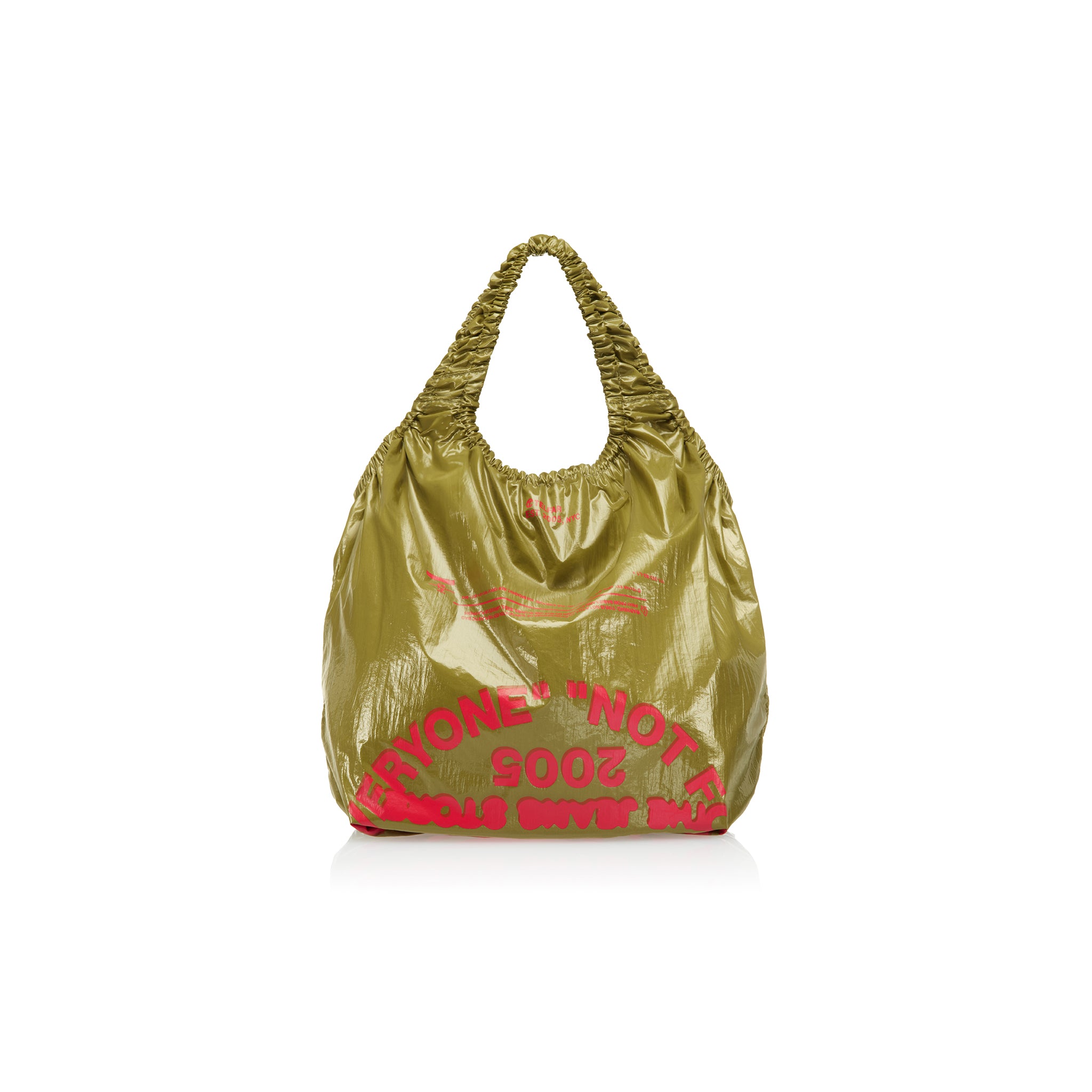 Our take on the staple New York sidewalk silhouette — double lined with ruched elastic handles, tonal seams, and a generous interior. It features two deep side pockets that fit water bottles, a zip pocket, slit pocket, and hidden stash pocket. This bag is not single use. But for use by singles. And couples. Keep away from children.