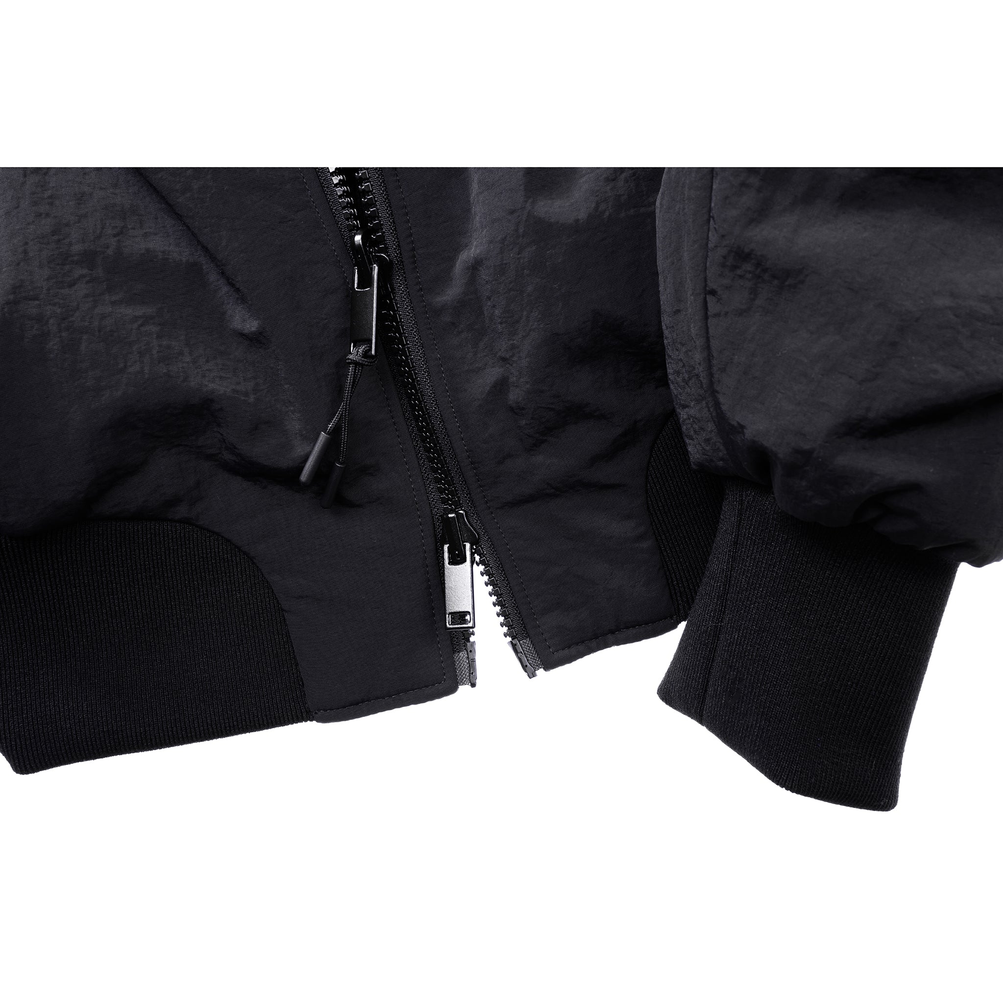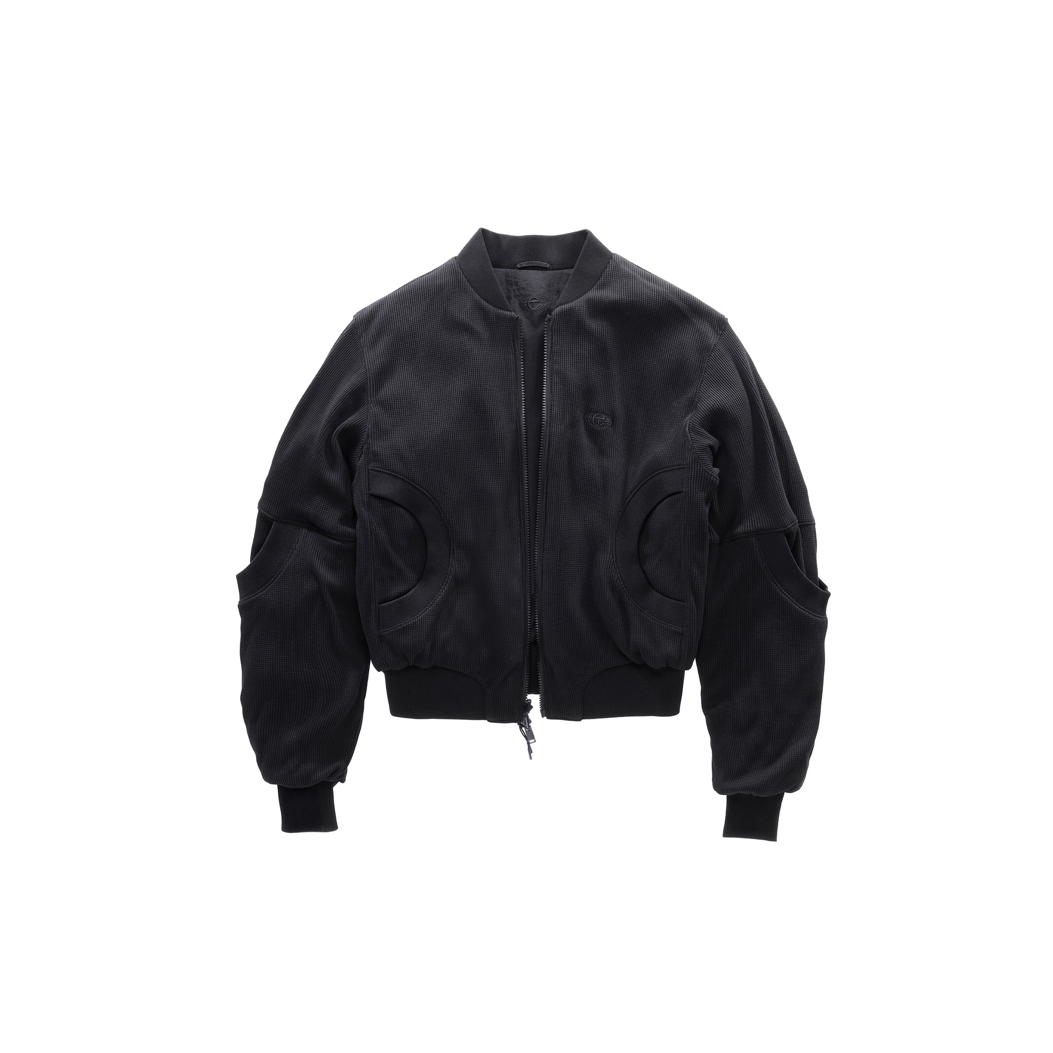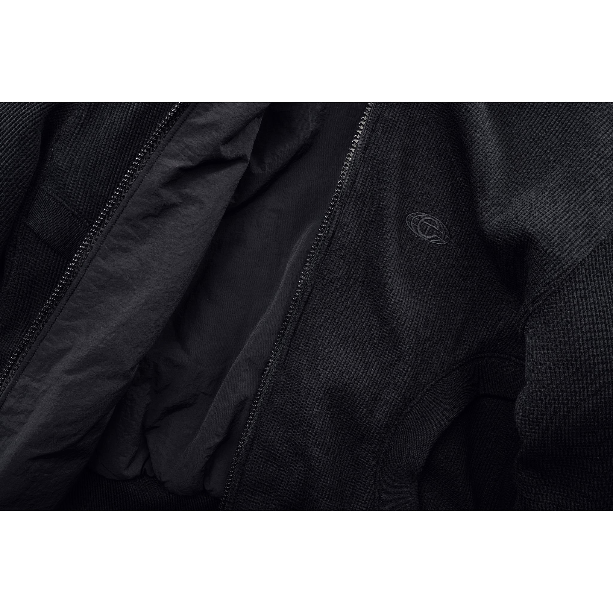 Reversible bomber jacket with water-resistant matte exterior, thermal waffle knit interior. Slit pockets at the side and around the elbows. Ribbed trim at the collar, waistband, cuffs and pockets. Full zipper closure. Available in Black and Rust.
